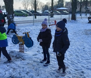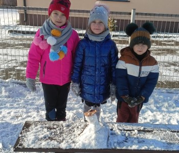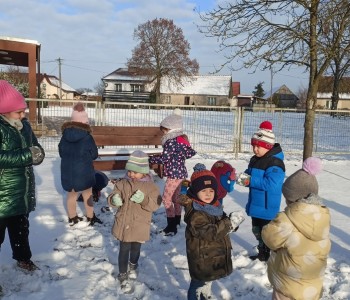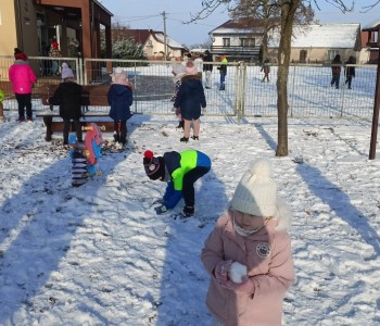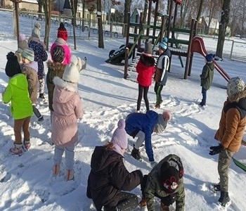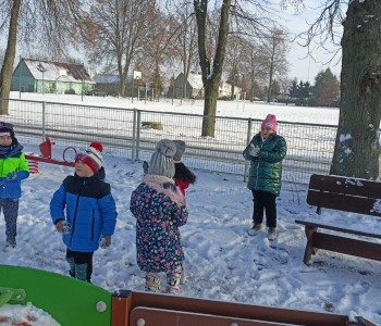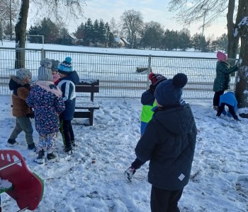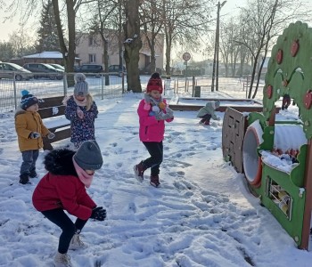 Wykorzystując zimową aurę i śnieg dzieci z grupy Bolka i Lolka oraz Pszczółki Mai wyszły na przedszkolny plac zabaw. Była to świetna okazja, aby zażyć z dziećmi ruchu na świeżym powietrzu i przy okazji świetnie się bawić na śniegu. Dzieci urządziły rzucanie śnieżkami do celu oraz próbowały ulepić bałwana. Zabawa na świeżym powietrzu z wykorzystaniem śniegu była dla nich świetną rozrywką. Było wesoło i radośnie. Z uśmiechami na twarzach wróciliśmy do przedszkola.