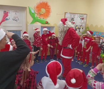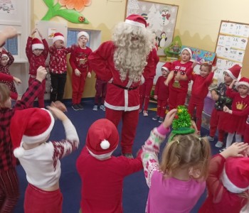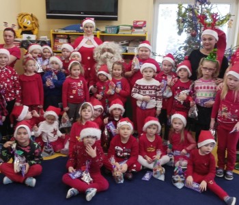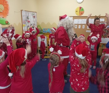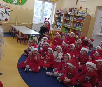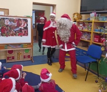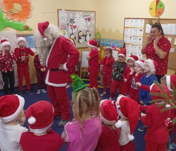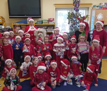Wizyta świętego Mikołaja to dzień na który cały rok czekają wszystkie dzieci. Od rana w przedszkolu panował gwar i radość oraz niecierpliwość w oczekiwaniu na przyjście niezwykłego gościa – Św. Mikołaja! Przedszkolaki wyglądały jak mali pomocnicy Mikołaja, ponieważ wszystkie dzieci ubrane były – na czerwono i ,,mikołajkowo”. Wreszcie przyjechał długo oczekiwany gość. Powitaliśmy Świętego Mikołaja piosenką i wierszem. Spotkanie minęło w bardzo miłej atmosferze i przyniosło dzieciom wiele radości. Wszystkie przedszkolaki otrzymały prezenty. Cieszymy się, że Św. Mikołaj o nas pamiętał i czekamy na jego wizytę w przyszłym roku.