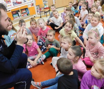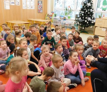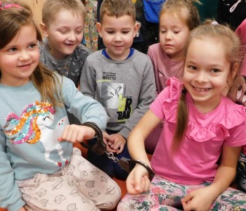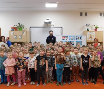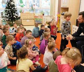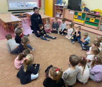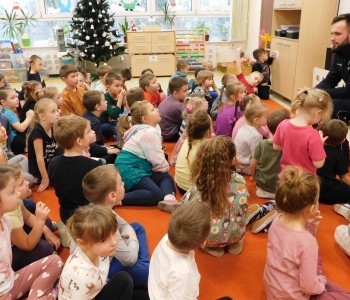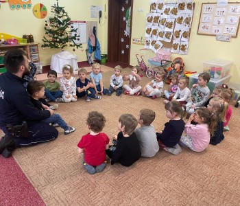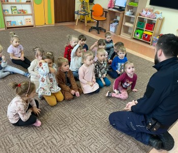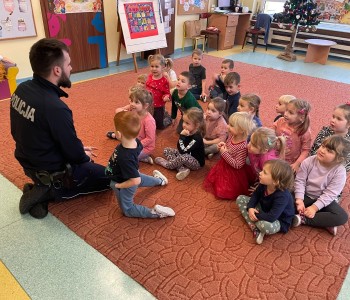 „Bezpieczne zachowania w ruchu drogowym” oraz „Umundurowanie Policjanta i jego praca”– to temat spotkania, które miało miejsce w czwartek 7grudnia 2023r. w naszym przedszkolu. Odwiedził nas Pan Policjant – Pan Patryk Wierzbiński w ramach współpracy z Policją. Przedszkolacy z grup najstarszych najpierw spotkali się z Panem Policjantem, który po obejrzeniu filmu edukacyjnego przypomniał im, jakie są bezpieczne zachowania w ruchu drogowym.