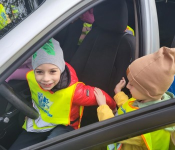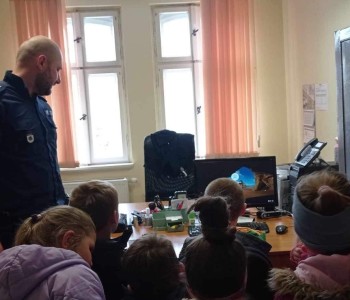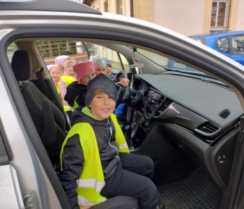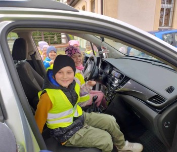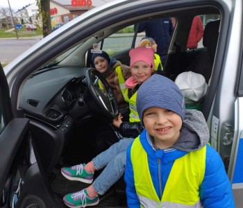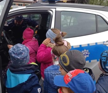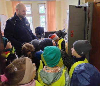 Przed wejściem czekał na przedszkolaki Pan mł. asp. Maciej Pikulik, który powitał wszystkich i zaprosił do odwiedzenia komisariatu. Pierwszym pomieszczeniem, do którego weszły dzieci była policyjna dyżurka – miejsce, w którym przyjmowane są wszystkie zgłoszenia. Dzieci poznały w jaki sposób patrolowane jest miasto, jakiego sprzętu używają policjanci. Zwiedzanie skończyło się przed komisariatem, gdzie wszystkie dzieci mogły zobaczyć radiowóz policyjny, a nawet do niego wsiąść. Dziękujemy Panom Policjantom za możliwość zwiedzenia komisariatu oraz zobaczenia radiowozu policyjnego.