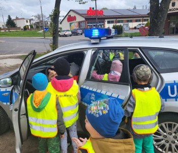 „Zwiedzanie Komisariatu Policji” oraz „Radiowóz policyjny” to tematyka dotycząca współpracy z Policją. W poniedziałek 22 kwietnia, dlatego więc najstarsze grupy przedszkolaków: „Wróbelek Elemelek”, „Czerwony Kapturek” oraz „Muminki” poszły z wizytą na Komisariat Policji. Celem wizyty było poznanie komisariatu Komendy Policji w Margoninie i pracy policjanta oraz zapoznanie z radiowozem policji.