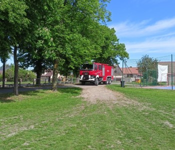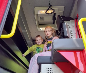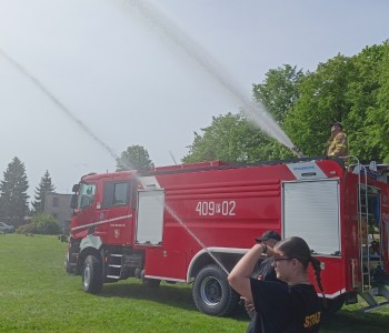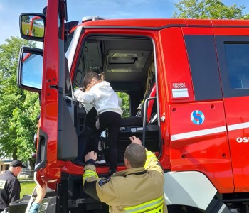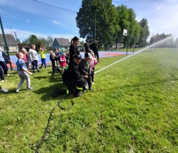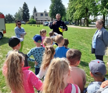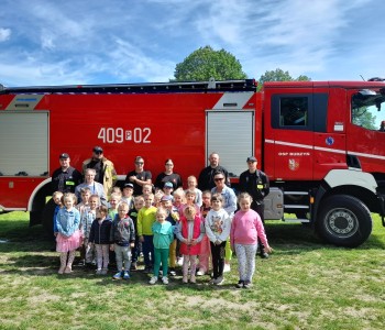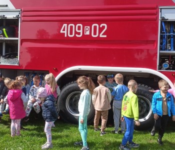 Dużą atrakcją dla dzieci było oglądanie wozów strażackich i pokaz „gaszenia pożaru”. Największą niespodzianką okazał się przyjazd największego w powiecie wozu strażackiego. Strażacy przekazali dzieciom wiele cennych informacji na temat przestrzegania zasad bezpieczeństwa i utrwalili numery alarmowe. Serdecznie dziękujemy naszym gościom za wspaniale poprowadzone spotkanie!