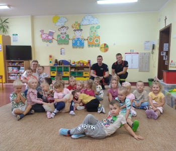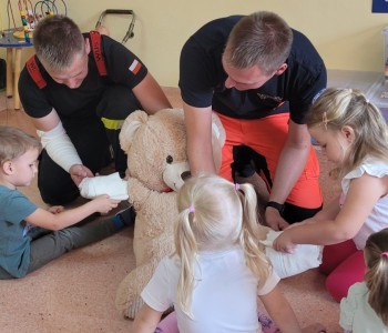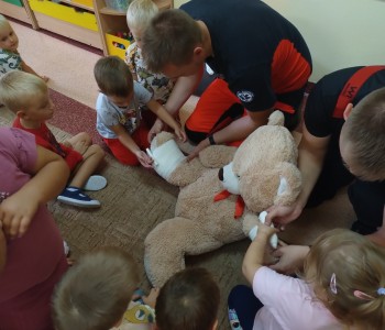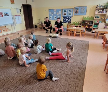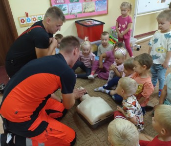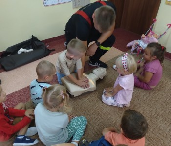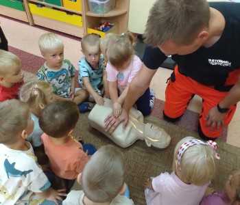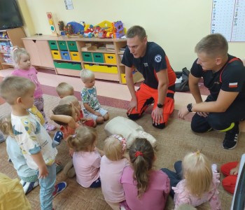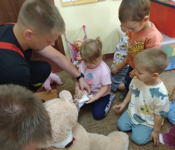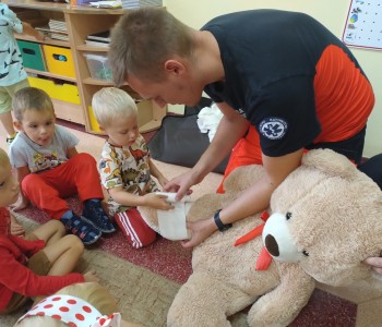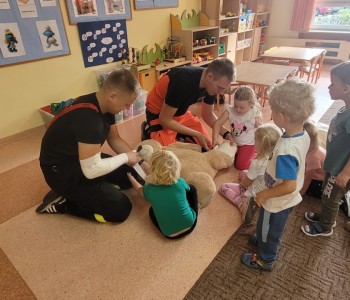 10 września przedszkolaków z grupy "Smerfy" i "Krasnala Hałabały" odwiedziły wyjątkowe osoby. Pan Patryk-ratownik medyczny oraz Pan Bartosz- strażak. Zaproszeni goście przybliżyli dzieciom specyfikę swoich zawodów. Każdy przedszkolak mógł zaopiekować się chorym misiem oraz poćwiczyć udzielanie pierwszej pomocy na przyniesionym fantomie. Na koniec spotkania najmłodsi zostali obdarowani cukierkami i kolorowankami. Dziękujemy za przybycie! Było nam bardzo miło!