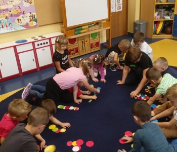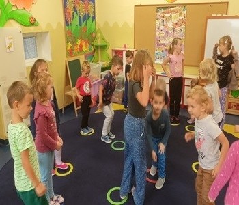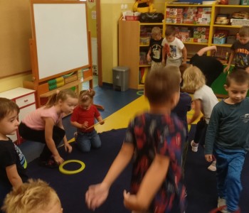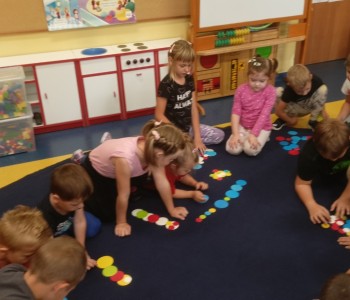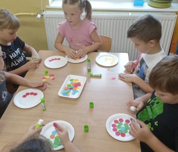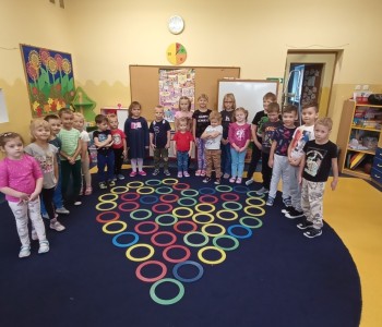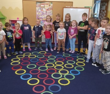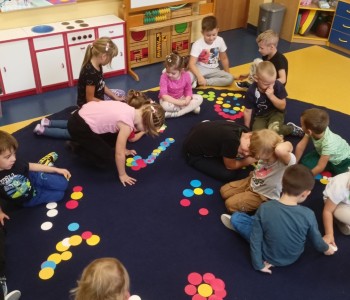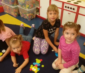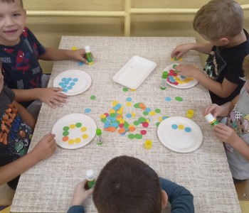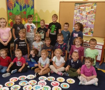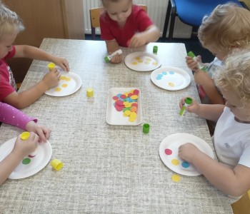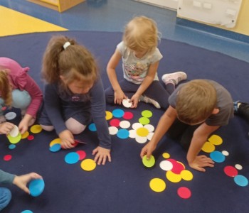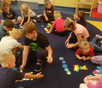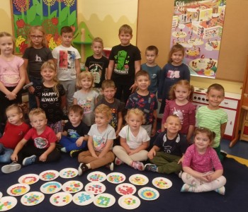 Na początku wysłuchały opowiadania pt. „Kropka” i poznały dziewczynkę, która potrafiła znaleźć swój talent i uwierzyła w swoje możliwości. Następnie brały udział w zabawach ruchowych z krążkami, a na zakończenie ułożyły z nich wielkie serce. Swoją kreatywność rozwijały podczas układania różnych kompozycji wykorzystując kolorowe kółka. Miały również okazję wykonać pracę plastyczną na papierowych talerzykach, na których naklejały kolorowe kółka w dowolny sposób rozwijając swoją wyobraźnię twórczą.