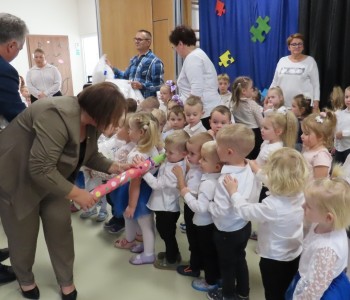 Uroczystość rozpoczęła się od powitania gości i przedstawienia krótkiej części artystycznej, w której dzieci zaprezentowały swoje umiejętności – dając tym samym dowód, jak dużo już potrafią. Były więc piosenki, wierszyki oraz tańce. Po części artystycznej najmłodsi obiecali: zgodnie bawić się w przedszkolu, przychodzić każdego dnia z uśmiechem na ustach, słuchać pani i pomagać kolegom, a nade wszystko być dzielnym przedszkolakiem. Następnie wysłuchały gratulacji od Burmistrza Miasta i Gminy Margonin Pana Janusza Piechockiego. Każdy nowo przybyły przedszkolak został pasowany symbolicznym ołówkiem przez Panią Dyrektor Katarzynę Panek. Na pamiątkę tego pięknego wydarzenia każde dziecko otrzymało upominek, który wręczyła Przewodnicząca Rady Rodziców Pani Tutko- Żurek. Pasowanie na przedszkolaka, to uroczystość, która na stałe zagościła w kalendarzu uroczystości przedszkolnych- zawsze wzrusza rodziców i cieszy dzieci.