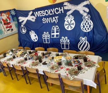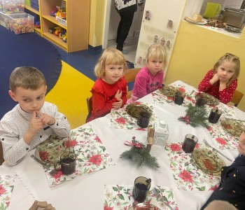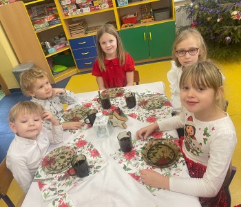 W piątek 20 grudnia 2024r. obchodziliśmy w naszym przedszkolu jeden z najpiękniejszych dni w roku – Wigilię Bożego Narodzenia. W sali przedszkolnej odświętnie ubrane przedszkolaki wysłuchały życzeń, które złożyły im panie wychowawczynie. Następnie wszyscy zasiedli do pięknie, własnoręcznie przystrojonych stołów, na których czekał świąteczny obiad.