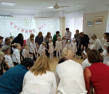 Mali artyści mogli w ten sposób podziękować za trud włożony w ich wychowanie. Było wiele wzruszeń i oklasków. Na koniec wszystkie wnuczęta obdarowały swoich bliskich własnoręcznie przygotowanymi upominkami. Dopełnieniem tego wyjątkowego spotkania były zabawy taneczne z babcią i dziadkiem oraz słodki poczęstunek. Bardzo dziękujemy za Waszą obecność i za wspólnie spędzony czas!