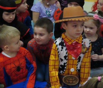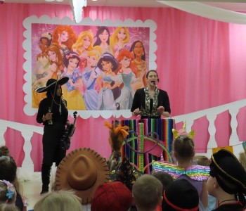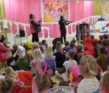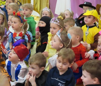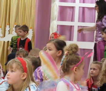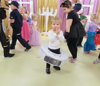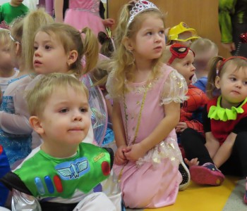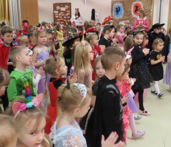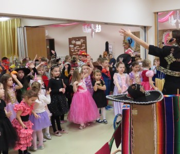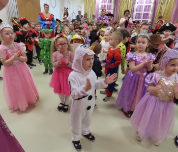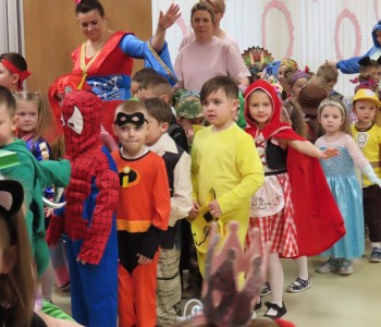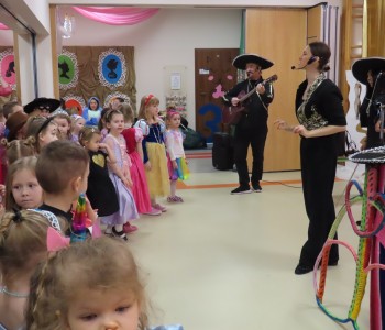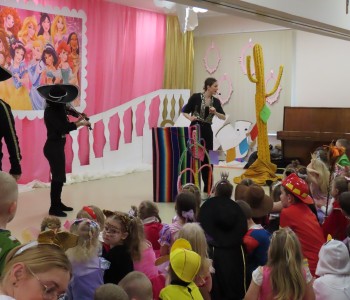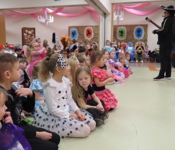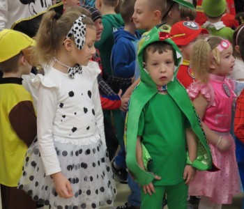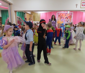 Stroje dzieci były bardzo barwne i oryginalne od postaci z bajek, po zwierzęta, aniołki, a nawet pojawił się robot sprzątający. Tego dnia każde dziecko miało okazję zaprezentować swój strój całej przedszkolnej społeczności. Albowiem wszystkie grupy wychodziły kolejno na środek sali i prezentowały swoje przebrania, tańcząc w rytm karnawałowej muzyki. Po intensywnych zabawach tanecznych, nastąpiła chwila przerwy i dzieci udały się do swoich sal na słodki poczęstunek przygotowany przez Panie z kuchni. Miały okazję również obejrzeć w tym czasie film edukacyjny, z którego dowiedziały się, w jaki sposób obchodzony jest karnawał w różnych zakątkach świata. Podczas drugiej części balu każde dziecko mogło swobodnie tańczyć przy ulubionych dziecięcych przebojach - solo, w parach, we wspólnym kole lub w tradycyjnym „wężu”.Na zakończenie każda grupa stanęła do wspólnego pamiątkowego zdjęcia. Ale to jeszcze nie koniec atrakcji tego dnia! Tuż po balu dzieci miały okazję obejrzeć przedstawienie teatru „Kulturka” pt. „Uciekające sombrero” – nawiązujące do tradycji meksykańskich. Serdecznie dziękujemy wszystkim pracownikom przedszkola(szczególnie Panu Romkowi i niezastąpionym Paniom Woźnym) za zaangażowanie, włożony trud i poświęcony czas na przygotowanie przepięknej scenografii, która przeniosła nas do baśniowego świata bajek Disneya. Dominika Bykowska