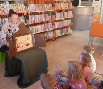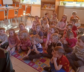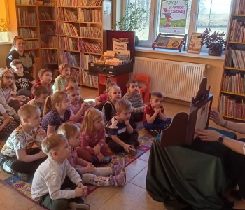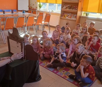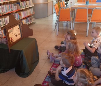 Dzieci z grupy Pszczółki Mai oraz Bolka i Lolka odwiedziły Bibliotekę w Radwankach. Podczas pobytu w bibliotece dzieci wysłuchały bajki Kumiko Yamamoto „Szukając Marudka” przedstawionej w formie teatrzyku kamishibai.