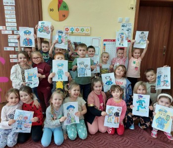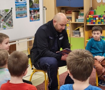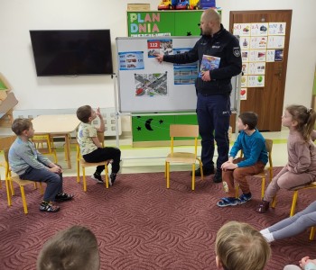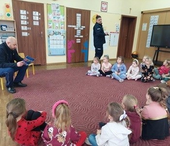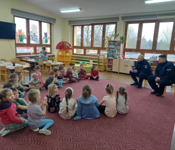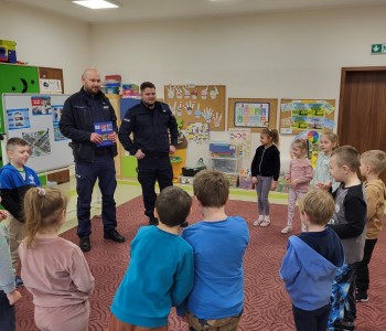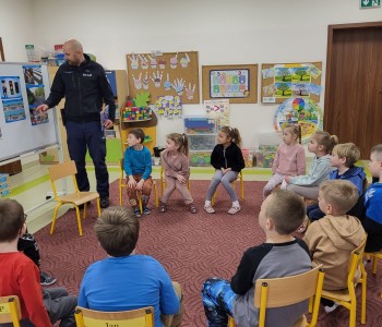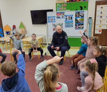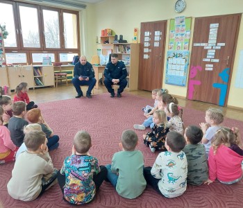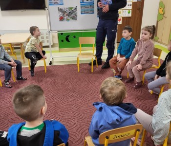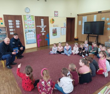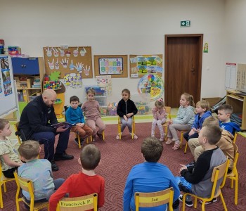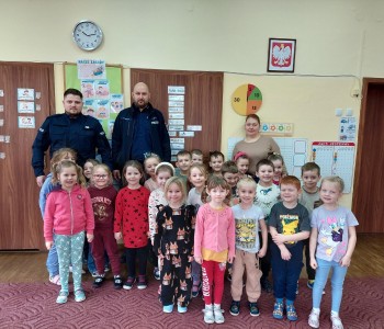 Panowie Policjanci przypomnieli dzieciom numery alarmowe. Zwrócili uwagę na niebezpieczeństwa, jakie mogą czyhać na dzieci w kontaktach z nieznajomymi, z którymi nie wolno rozmawiać oraz wpuszczać ich do domu. Funkcjonariusze Policji próbowali przekazać dzieciom informacje, które sprawią, że najmłodsi odczytają ich, jako osoby godne zaufania, takie do których zawsze można zwrócić się o pomoc. Duże zainteresowanie dzieci wzbudził mundur oraz akcesoria potrzebne policjantowi do pracy. Dzieci czynnie uczestniczyły w spotkaniu, zadawały pytania, dzieliły się swoimi spostrzeżeniami i doświadczeniami. Na koniec w podziękowaniu za wizytę przedszkolaki zatańczyły do piosenki pt:"Pan policjant". Było nam bardzo miło. Zapraszamy ponownie.