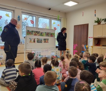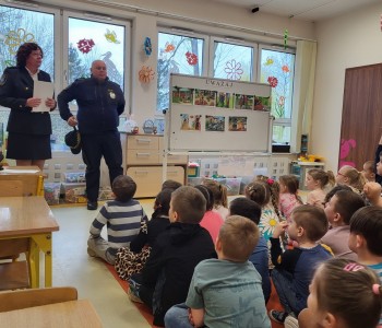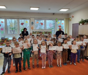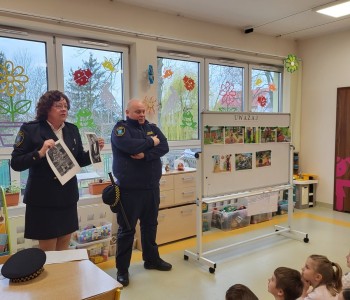 Dzieci bardzo aktywnie uczestniczyły w rozmowie i były zainteresowane tematem. Obejrzały także ciekawą bajkę na powyższy temat. To bardzo ważne, żeby uświadamiać dzieci przed różnymi zagrożeniami jednak istotne jest, żeby to robić w przystępny dla nich sposób. Dziękujemy Pani komendant Katarzynie Kurek i inspektorowi Mateuszowi Krojence za spotkanie i poruszenie ważnego tematu dla bezpieczeństwa naszych pociech.