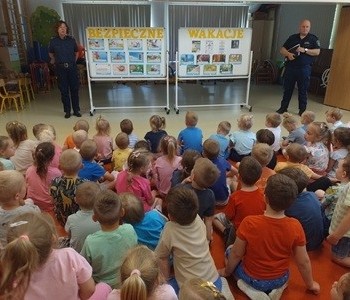 Wakacje zbliżają się wielkimi krokami. W związku z tym, wszystkie dzieci w przedszkolu wzięły udział w zajęciach przeprowadzonych przez przedstawicieli Straży Miejskiej na temat bezpieczeństwa podczas wakacji.
