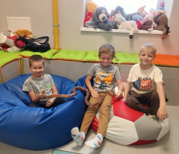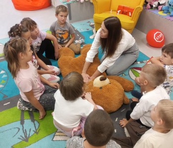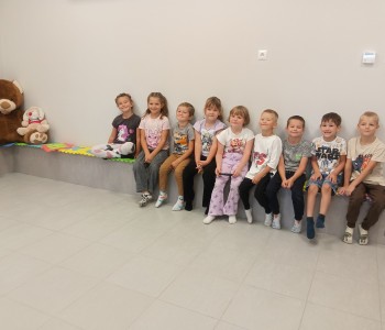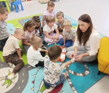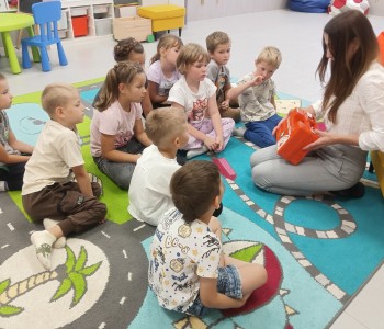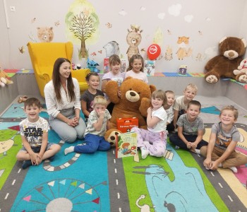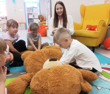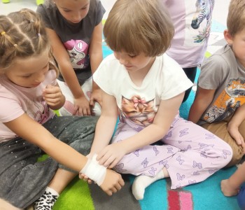 Głównym tematem wizyty było udzielanie pierwszej pomocy w sytuacji zagrażającej zdrowiu i życiu drugiej osoby. Dzieci z wielkim zainteresowaniem wysłuchały opowiadania pt.: „Łukasz ratuje Misia, czyli jak udzielić pierwszej pomocy”- Izabeli Michta, dzięki któremu w przystępny sposób dowiedziały się, jak należy udzielać pomocy osobom poszkodowanym zanim przyjedzie pogotowie ratunkowe. Następnie poznały zawartość apteczki pierwszej pomocy i nauczyły się w jakich wypadkach i w jaki sposób jej używać. Miały również okazję w formie zabawy ćwiczyć opatrywanie ran. Głównym punktem spotkania było „ratowanie misia”. Każdy przedszkolak z wielkim zaangażowaniem ćwiczył uciski klatki piersiowej oraz sztuczne oddychanie. Dzięki temu przedszkolaki mogły poczuć się małymi ratownikami i przekonać się, że każdy, nawet dziecko może pomóc drugiej osobie. Na zakończenie spotkania nie zabrakło również radosnych i bezpiecznych zabaw w Strefie Dziecka. Spotkanie miało na celu kształtowanie pozytywnych i bezpiecznych postaw oraz zapoznanie przedszkolaków z podstawowymi czynnościami ratowniczymi w przypadku nieobecności osób dorosłych. Była to doskonała lekcja – połączenie zabawy z przekazywaniem jakże istotnej wiedzy, która może przynieść nieoceniony efekt – ratowanie życia. Serdecznie dziękujemy Pani Kamili za bardzo ważne spotkanie, uczące dzieci odpowiedzialności, odwagi i empatii.