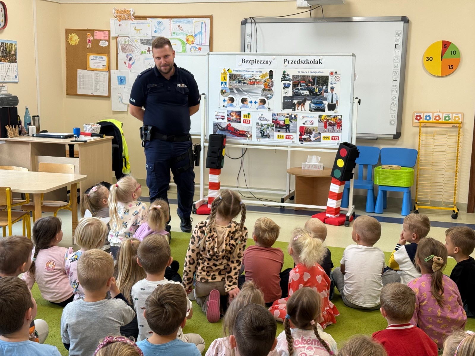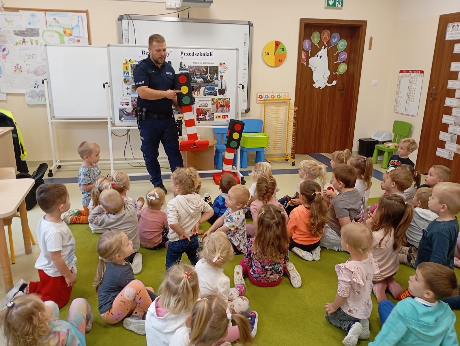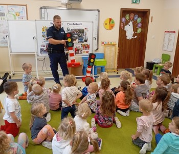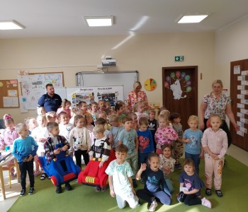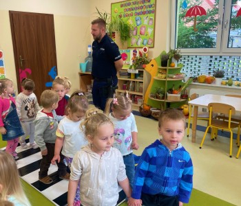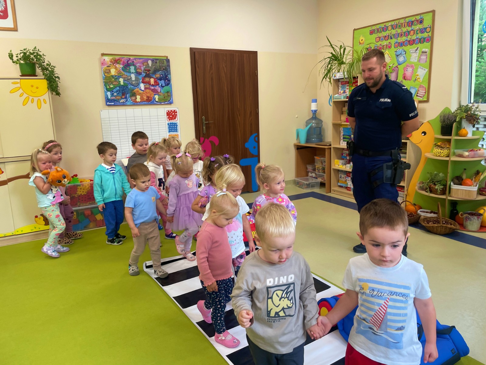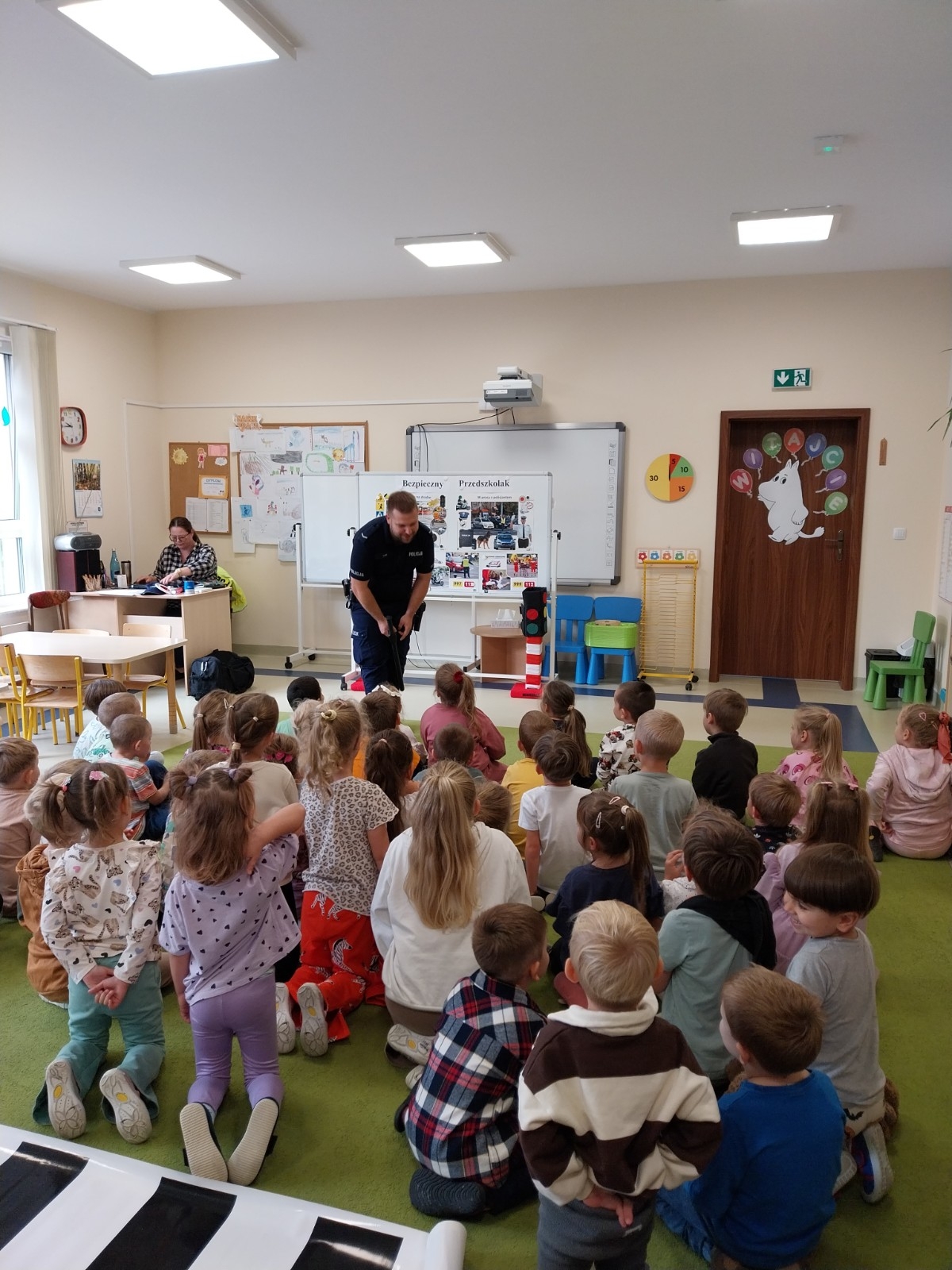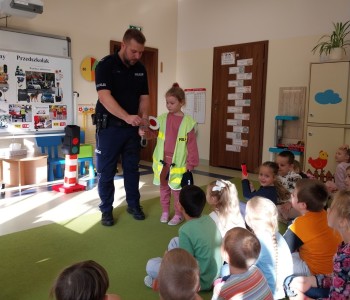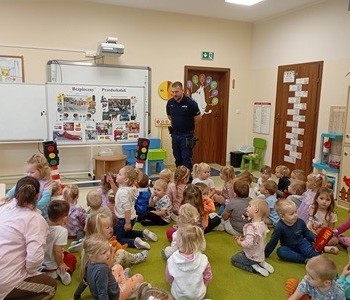 W środę 1 października nasze przedszkole gościło policjanta pana Rafała Makowskiego. Podczas spotkania omówiono zasady bezpiecznego poruszania się w ruchu drogowym a także przypomniano o podstawowych zasadach bezpieczeństwa w domu i przedszkolu.