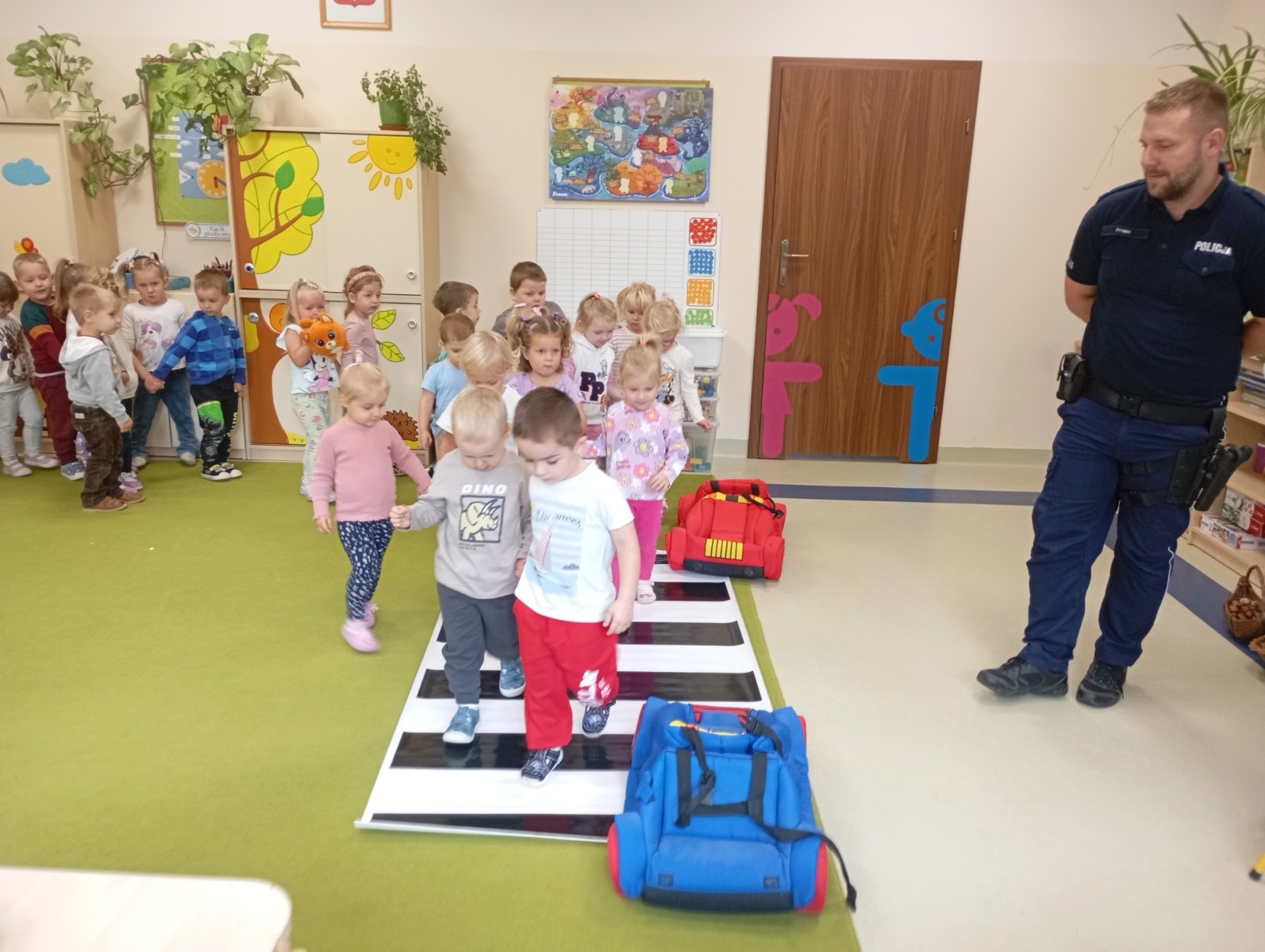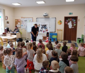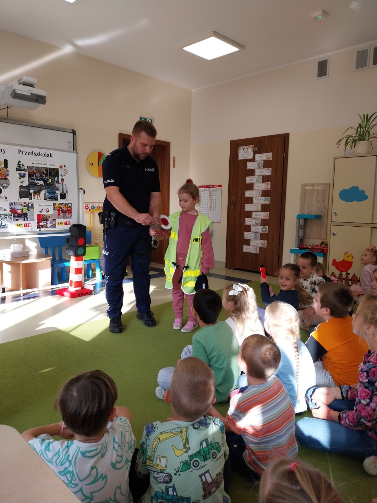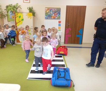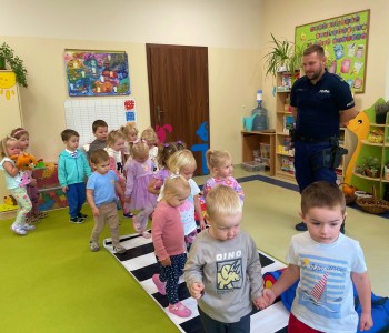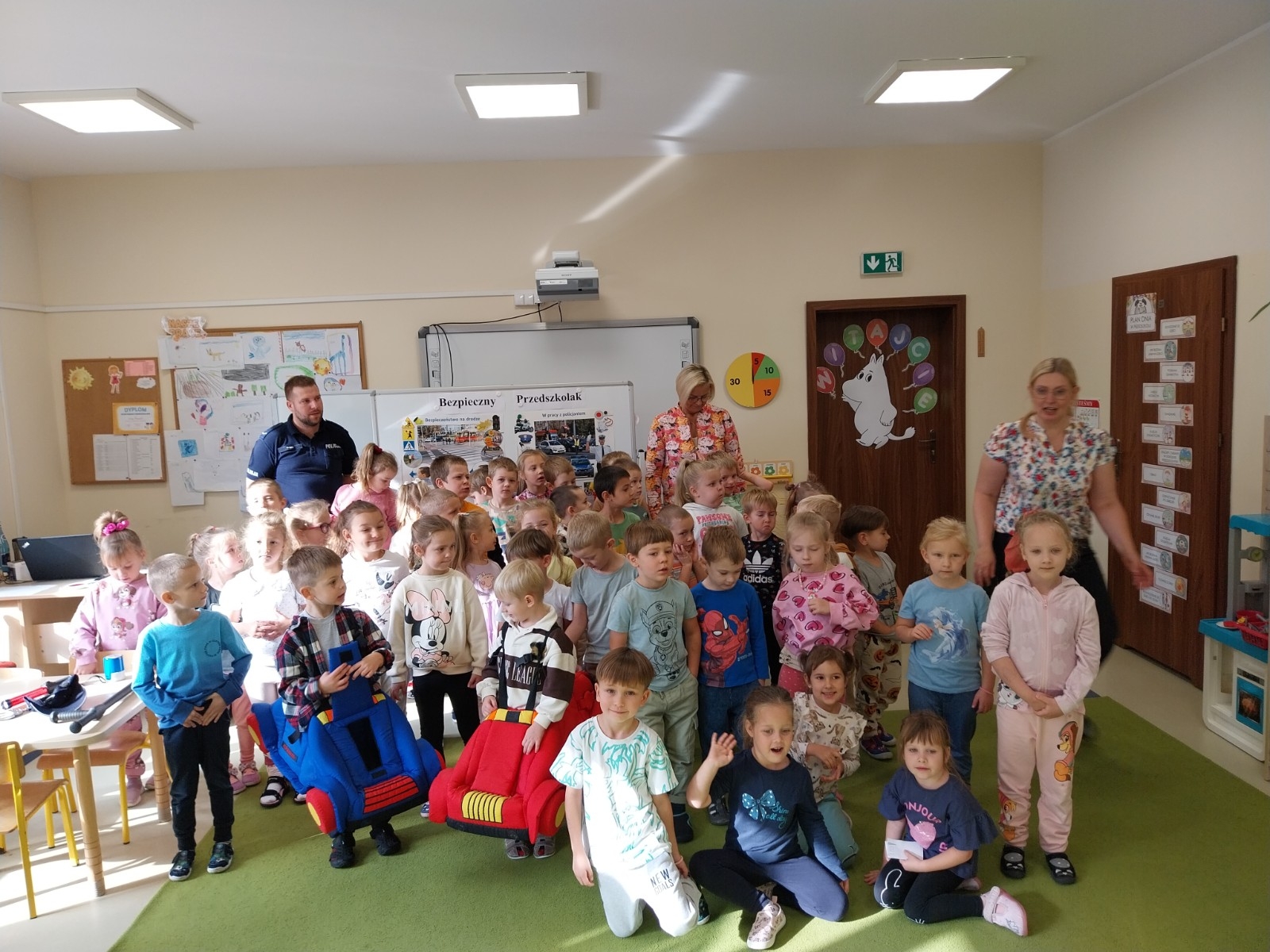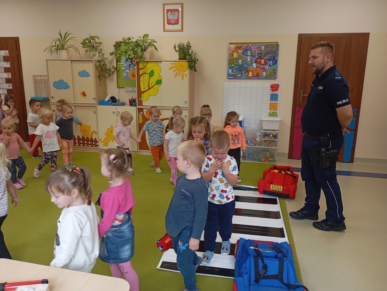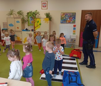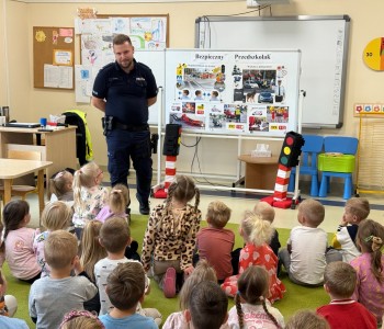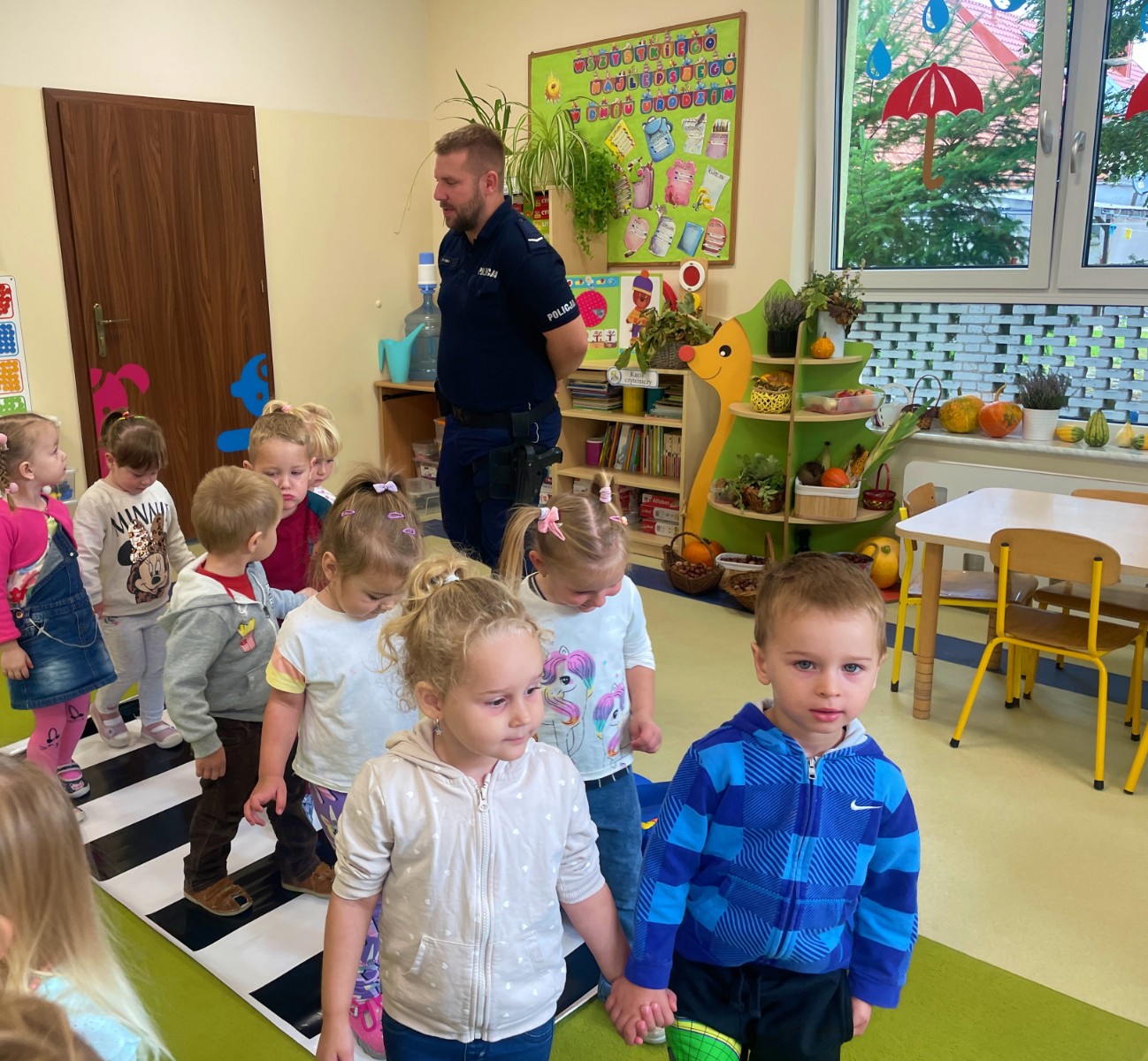 W środę 1 października nasze przedszkole gościło policjanta pana Rafała Makowskiego. Podczas spotkania omówiono zasady bezpiecznego poruszania się w ruchu drogowym a także przypomniano o podstawowych zasadach bezpieczeństwa w domu i przedszkolu.