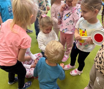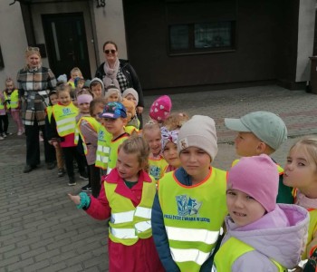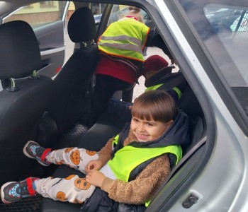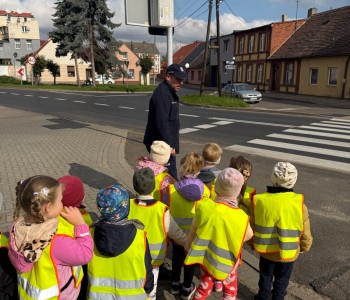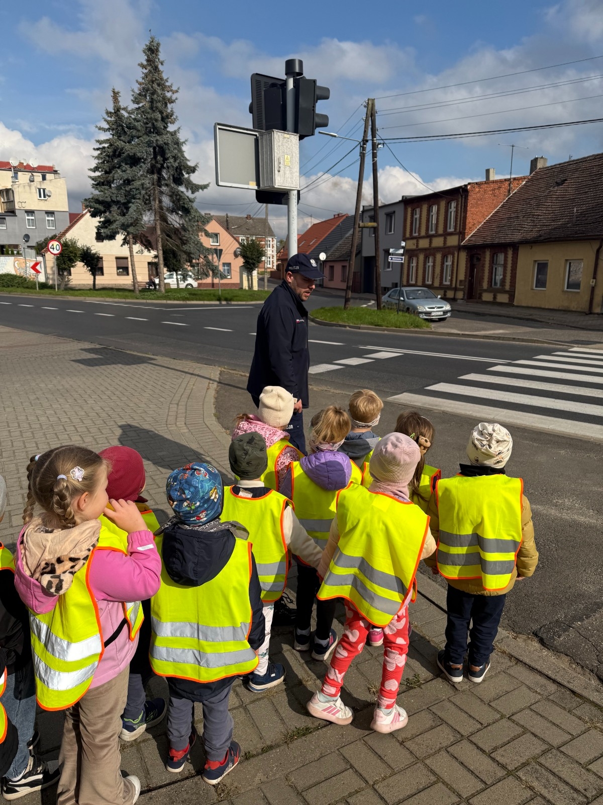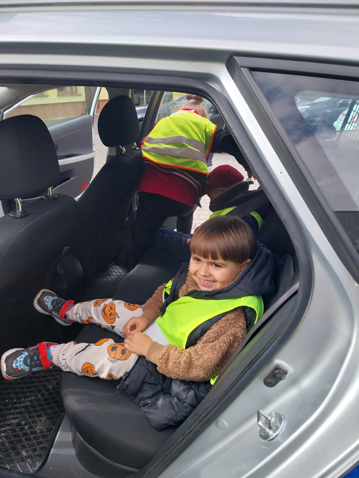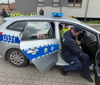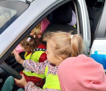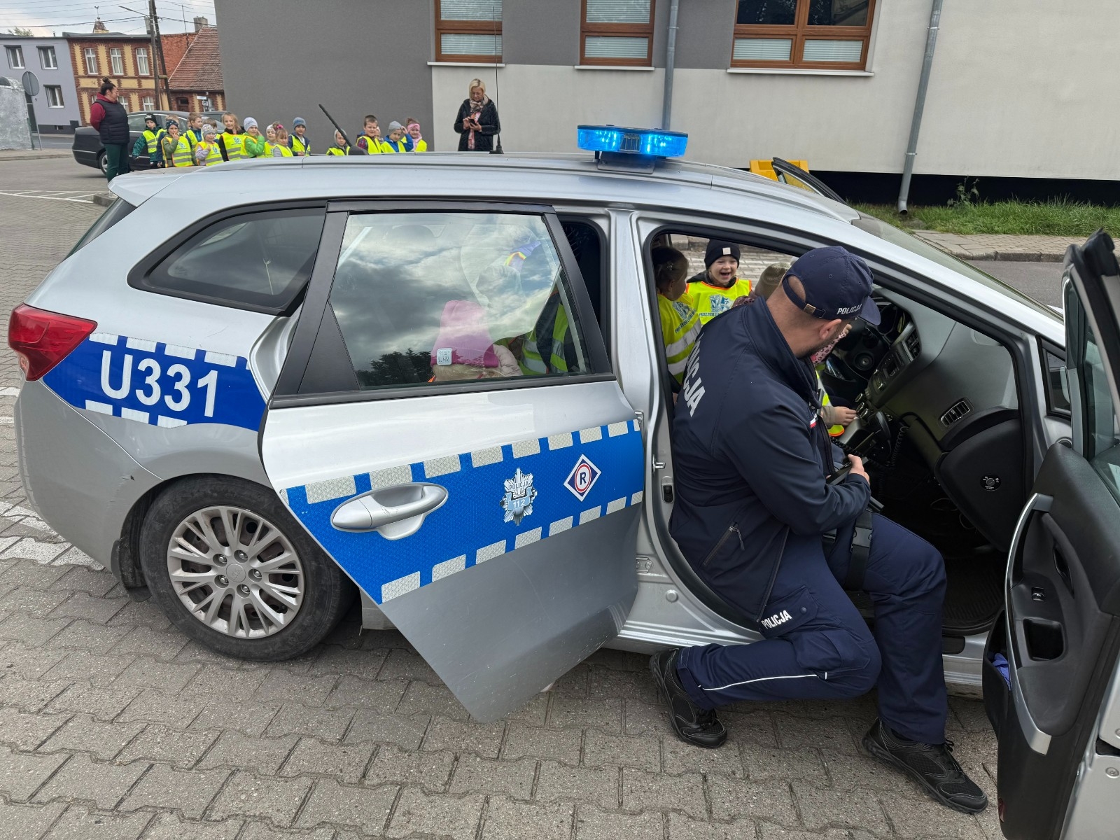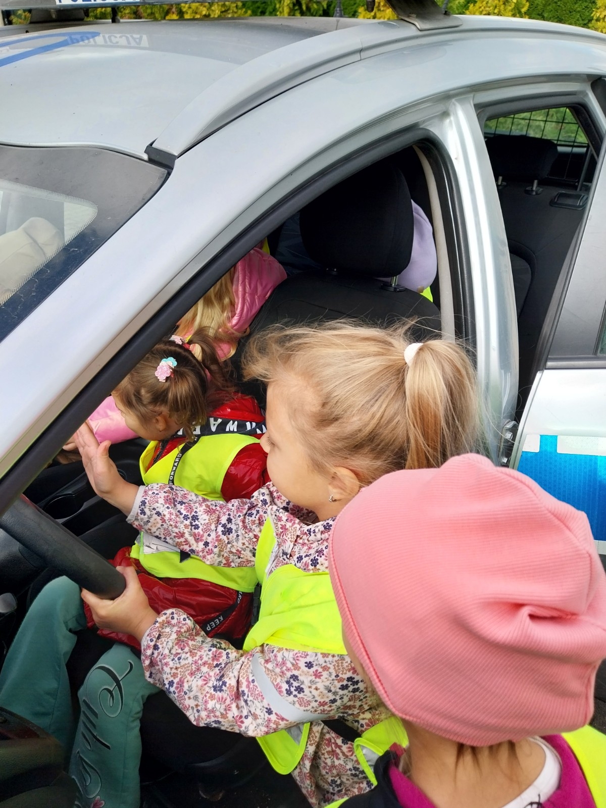 Dzieci miały także okazję poznać, jak wygląda praca policjanta i jakim posługuje się on wyposażeniem. Najmłodszym szczególną frajdę sprawiła możliwość obejrzenia policyjnego radiowozu od środka – wielu z nich zasiadło nawet za kierownicą. Dziękujemy za cenne spotkanie i ważną lekcję bezpieczeństwa.