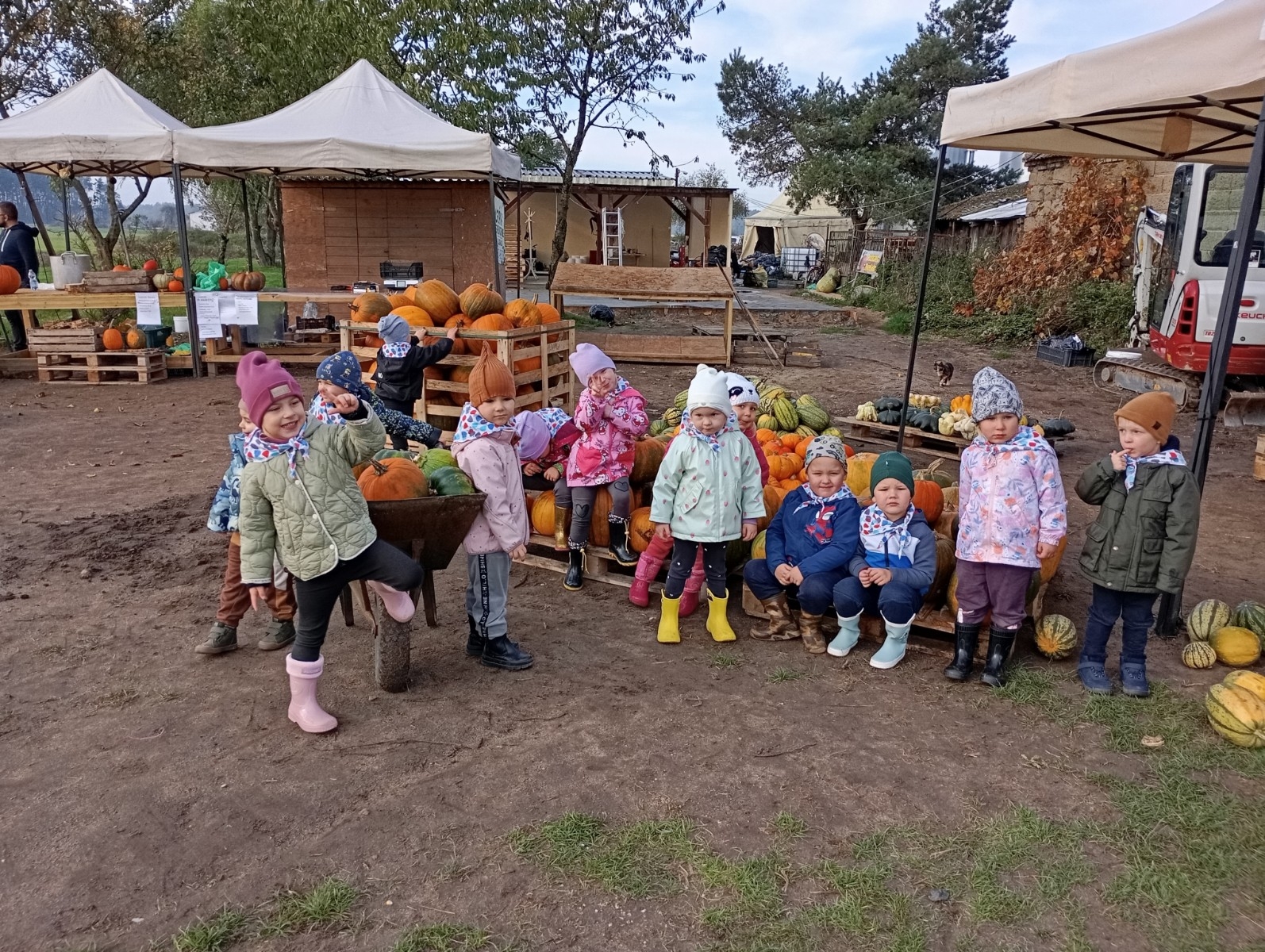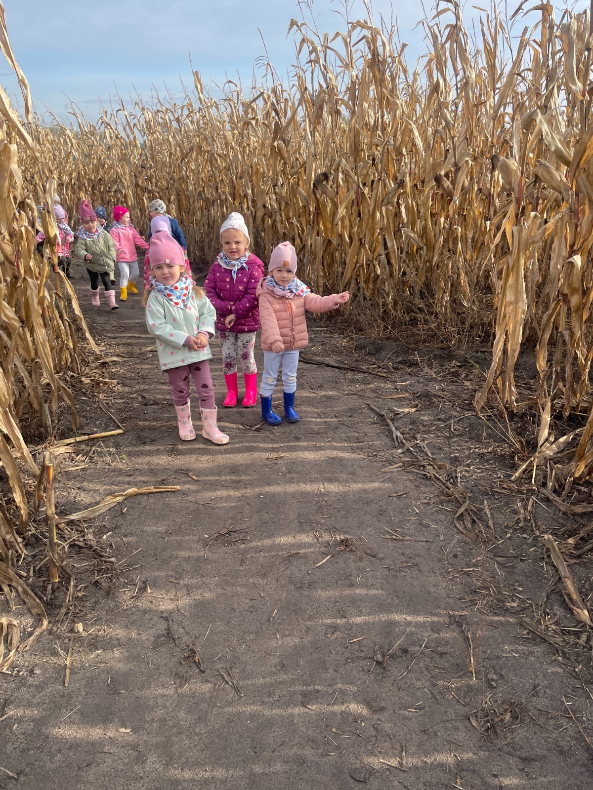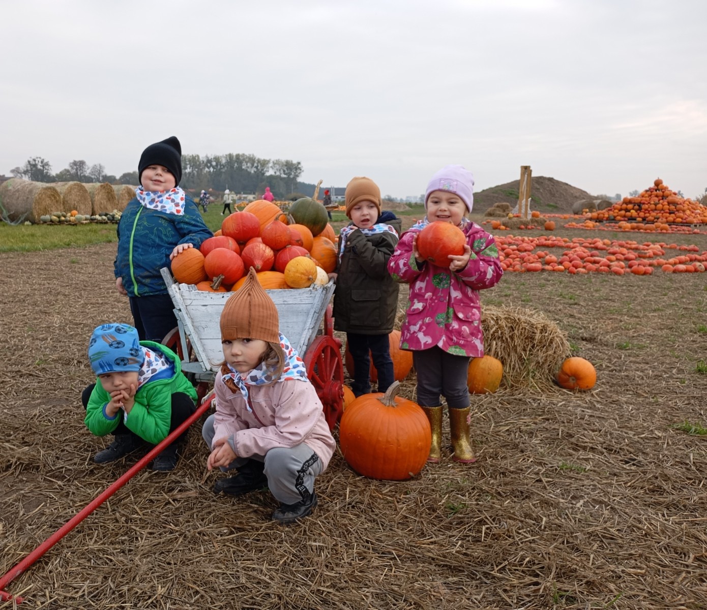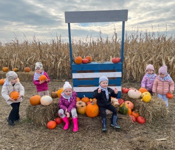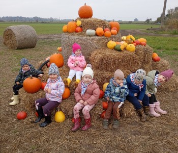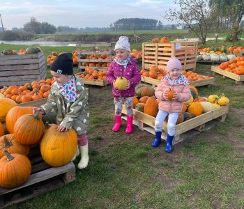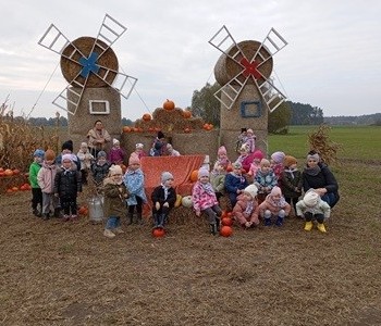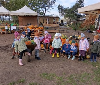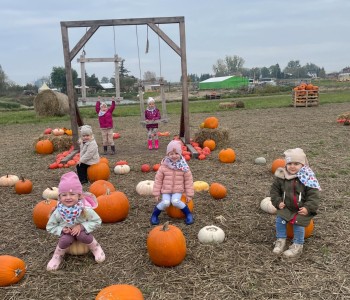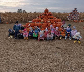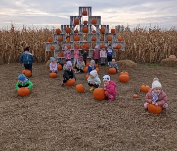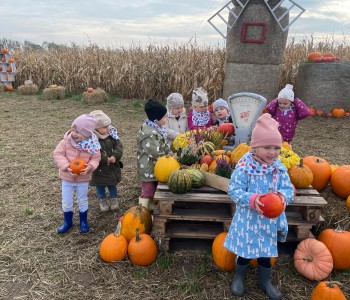 Krasnal Hałabała siedział dumnie w pierwszym rzędzie, trzymając swój czerwony kapelusz, żeby nie odleciał, gdy autobus przyspieszał. Gdy tylko dotarli na miejsce, wszyscy oniemieli z zachwytu! Przed nami rozciągało się prawdziwe dyniowe królestwo, ogromne pomarańczowe kule, zielone tykwy, maleńkie ozdobne dynie oraz te wielkie jak smerfne domki! Pani Przewodniczka opowiedziała dzieciom, jak rosną dynie i pokazała różne odmiany. Krasnal Hałabała z powagą przytaknął i szepnął Smerfom: widzicie, moi mali przyjaciele, dynie to piękny, jesienny skarb natury! Po krótkiej pogadance nadszedł czas na przygody w Dyniowej Farmie. Smerfy i Krasnale ruszyli do labiryntu z kukurydzy. Z początku wszystko szło dobrze, dopóki Ciamajda nie skręcił w lewo zamiast w prawo. Na szczęście Papa Smerf z pomocą Hałabały szybko wszystkich odnaleźli. Na koniec labiryntu czekała nagroda – wielki kosz pełen dyniowych skarbów! Następnie przedszkolaki odwiedziły zagrodę ze zwierzętami i z radością karmiły króliczki. Na zakończenie naszej wyprawy wszyscy poszli na odpoczynek i degustowali piknikowe przysmaki. Hałabała częstował pieczonymi ziemniakami, a Smerfetka przyniosła ciepłą herbatkę. Dzieci śpiewały jesienne piosenki, a wiatr cichutko szeptał: to był naprawdę magiczny dzień! Zmęczeni, ale szczęśliwi Smerfy i Krasnale wrócili do przedszkola z koszami pełnymi dyń i sercami przepełnionymi wrażeniami i radością. Dyniowa przygoda pełna śmiechu, przyjaźni oraz jesiennego czaru na długo pozostanie w naszych wspomnieniach!