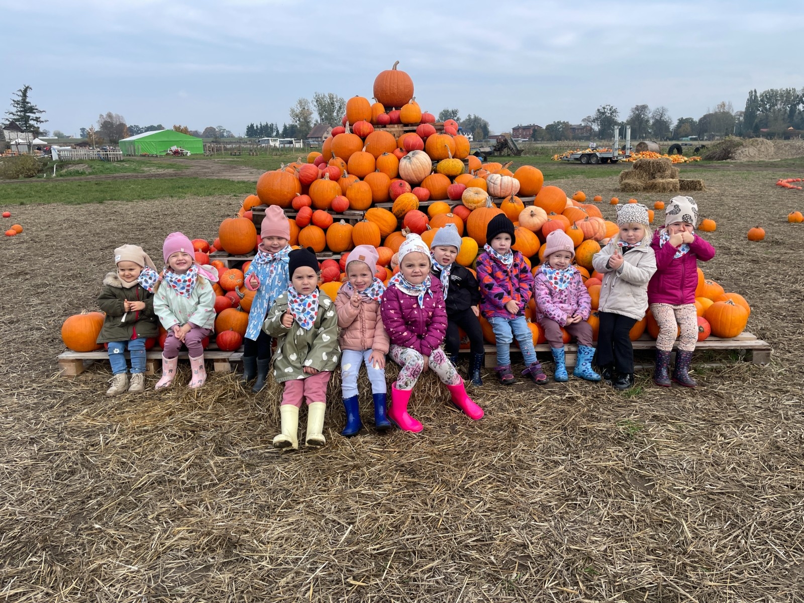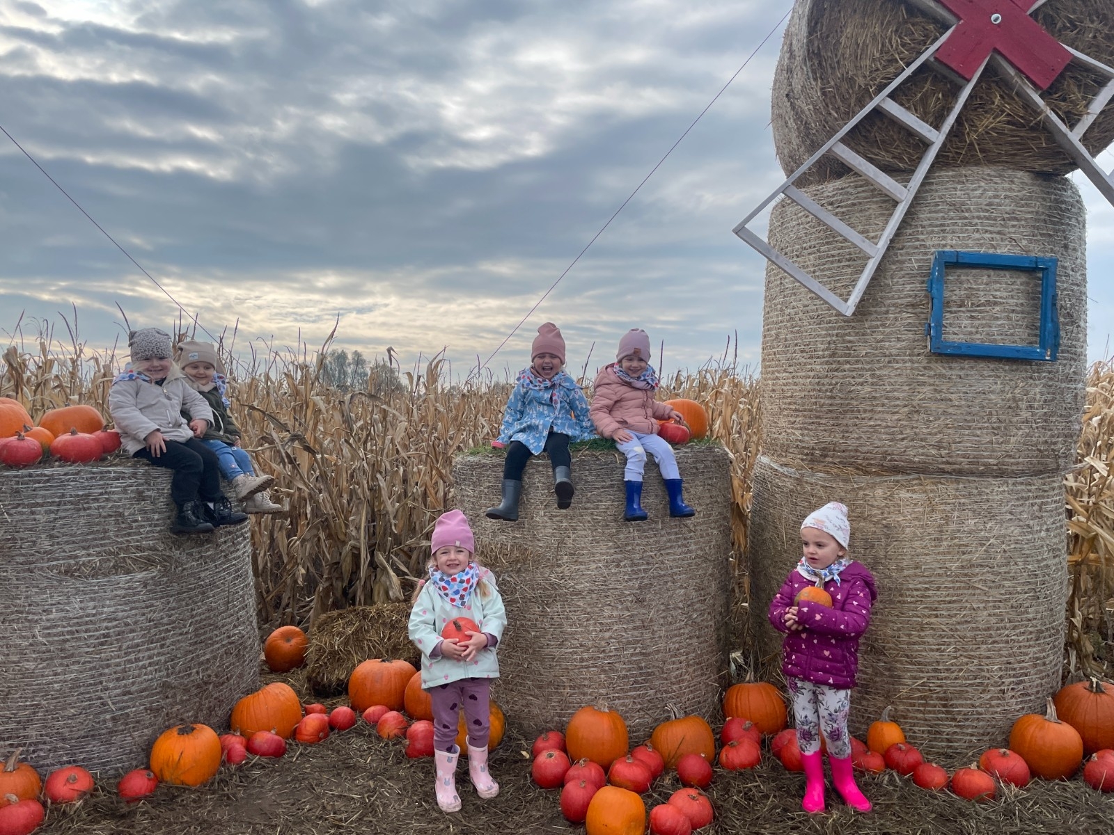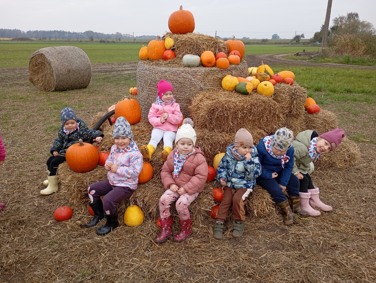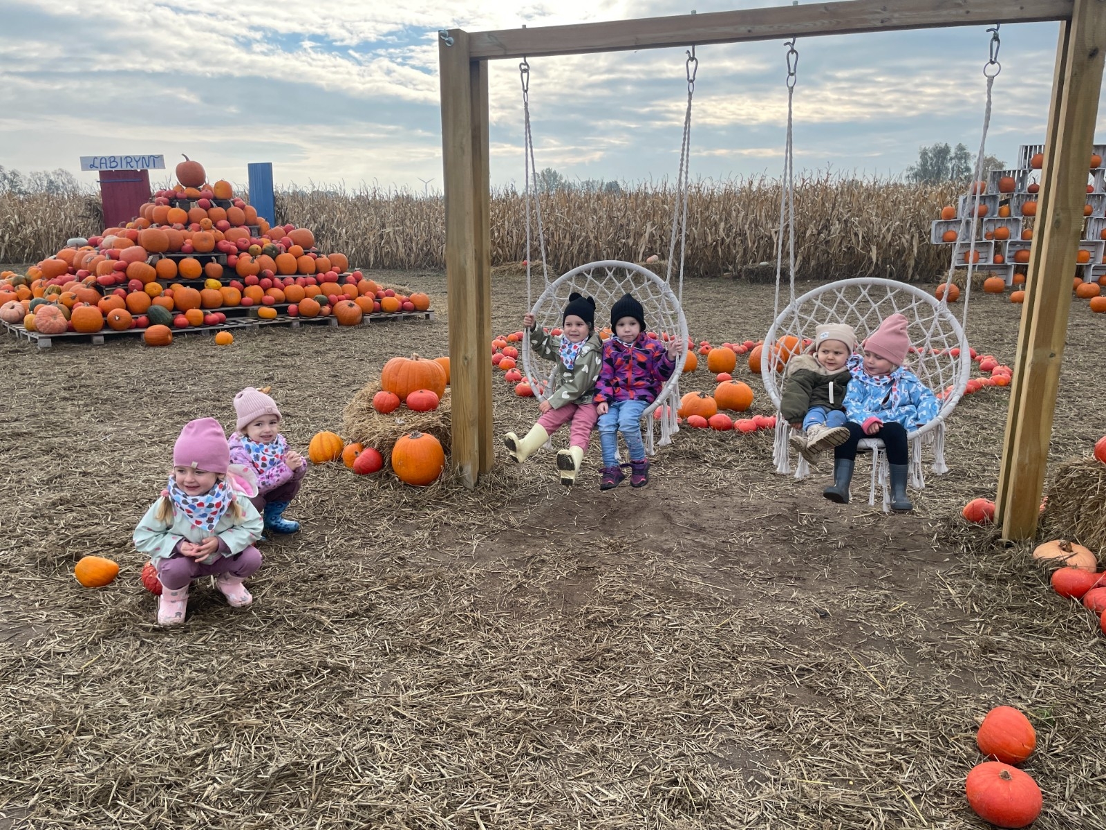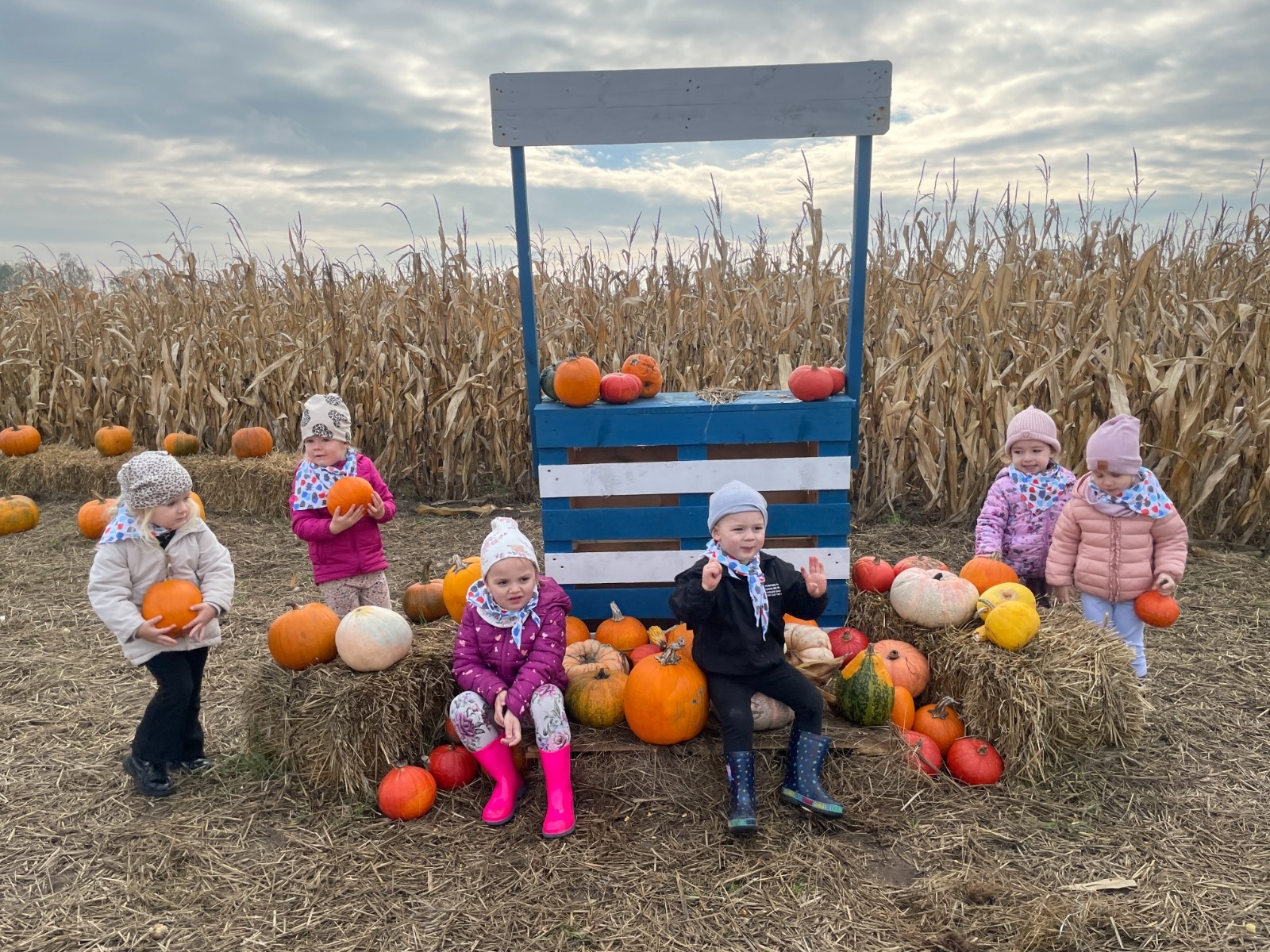 Krasnal Hałabała siedział dumnie w pierwszym rzędzie, trzymając swój czerwony kapelusz, żeby nie odleciał, gdy autobus przyspieszał. Gdy tylko dotarli na miejsce, wszyscy oniemieli z zachwytu! Przed nami rozciągało się prawdziwe dyniowe królestwo, ogromne pomarańczowe kule, zielone tykwy, maleńkie ozdobne dynie oraz te wielkie jak smerfne domki! Pani Przewodniczka opowiedziała dzieciom, jak rosną dynie i pokazała różne odmiany. Krasnal Hałabała z powagą przytaknął i szepnął Smerfom: widzicie, moi mali przyjaciele, dynie to piękny, jesienny skarb natury! Po krótkiej pogadance nadszedł czas na przygody w Dyniowej Farmie. Smerfy i Krasnale ruszyli do labiryntu z kukurydzy. Z początku wszystko szło dobrze, dopóki Ciamajda nie skręcił w lewo zamiast w prawo. Na szczęście Papa Smerf z pomocą Hałabały szybko wszystkich odnaleźli. Na koniec labiryntu czekała nagroda – wielki kosz pełen dyniowych skarbów! Następnie przedszkolaki odwiedziły zagrodę ze zwierzętami i z radością karmiły króliczki. Na zakończenie naszej wyprawy wszyscy poszli na odpoczynek i degustowali piknikowe przysmaki. Hałabała częstował pieczonymi ziemniakami, a Smerfetka przyniosła ciepłą herbatkę. Dzieci śpiewały jesienne piosenki, a wiatr cichutko szeptał: to był naprawdę magiczny dzień! Zmęczeni, ale szczęśliwi Smerfy i Krasnale wrócili do przedszkola z koszami pełnymi dyń i sercami przepełnionymi wrażeniami i radością. Dyniowa przygoda pełna śmiechu, przyjaźni oraz jesiennego czaru na długo pozostanie w naszych wspomnieniach!