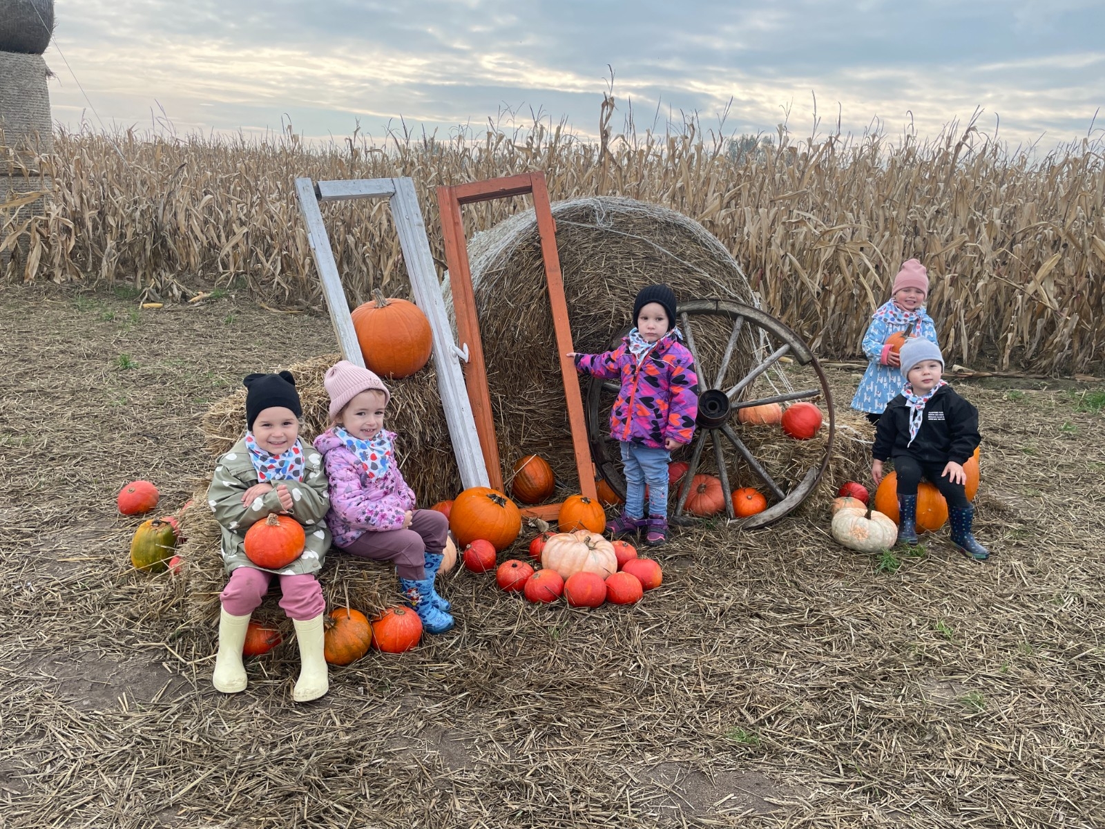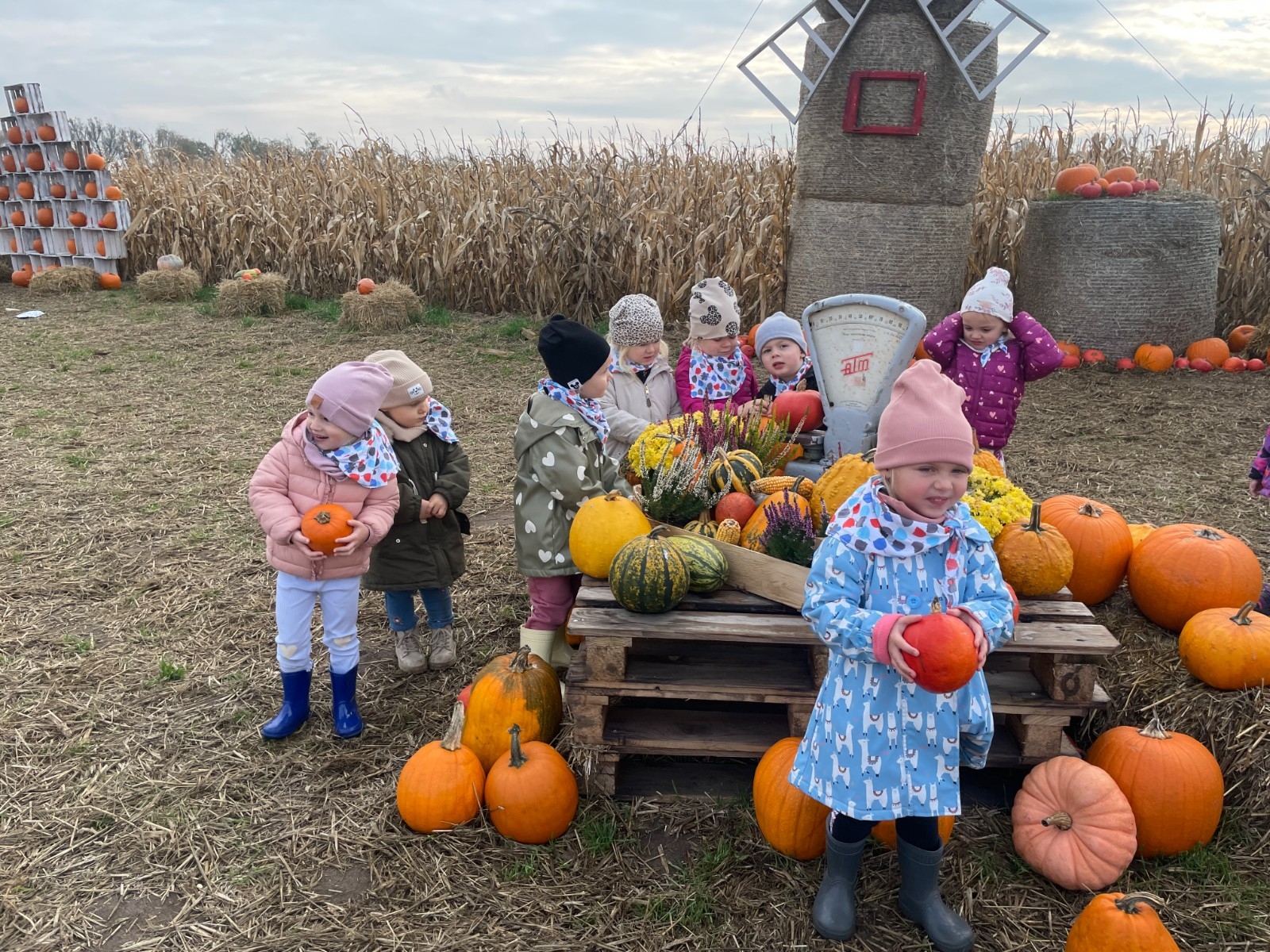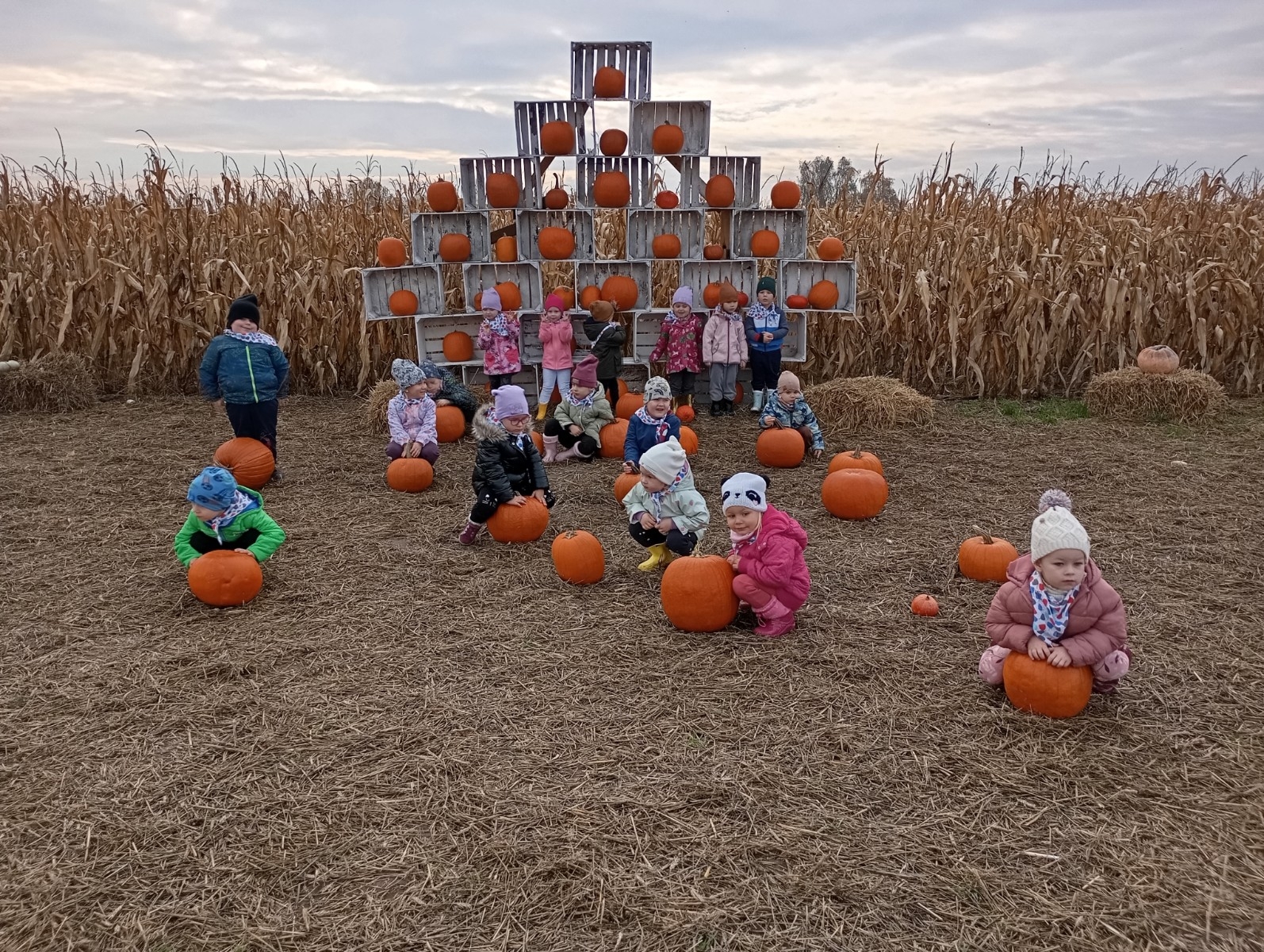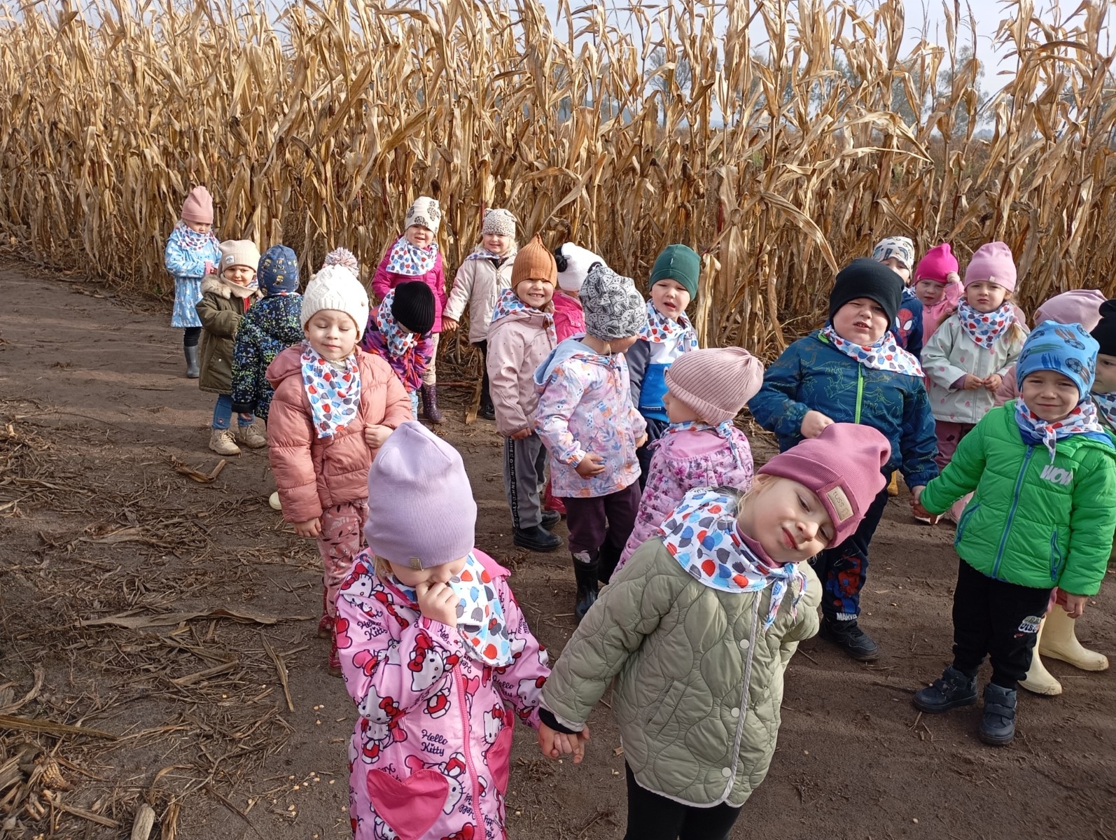 Krasnal Hałabała siedział dumnie w pierwszym rzędzie, trzymając swój czerwony kapelusz, żeby nie odleciał, gdy autobus przyspieszał. Gdy tylko dotarli na miejsce, wszyscy oniemieli z zachwytu! Przed nami rozciągało się prawdziwe dyniowe królestwo, ogromne pomarańczowe kule, zielone tykwy, maleńkie ozdobne dynie oraz te wielkie jak smerfne domki! Pani Przewodniczka opowiedziała dzieciom, jak rosną dynie i pokazała różne odmiany. Krasnal Hałabała z powagą przytaknął i szepnął Smerfom: widzicie, moi mali przyjaciele, dynie to piękny, jesienny skarb natury! Po krótkiej pogadance nadszedł czas na przygody w Dyniowej Farmie. Smerfy i Krasnale ruszyli do labiryntu z kukurydzy. Z początku wszystko szło dobrze, dopóki Ciamajda nie skręcił w lewo zamiast w prawo. Na szczęście Papa Smerf z pomocą Hałabały szybko wszystkich odnaleźli. Na koniec labiryntu czekała nagroda – wielki kosz pełen dyniowych skarbów! Następnie przedszkolaki odwiedziły zagrodę ze zwierzętami i z radością karmiły króliczki. Na zakończenie naszej wyprawy wszyscy poszli na odpoczynek i degustowali piknikowe przysmaki. Hałabała częstował pieczonymi ziemniakami, a Smerfetka przyniosła ciepłą herbatkę. Dzieci śpiewały jesienne piosenki, a wiatr cichutko szeptał: to był naprawdę magiczny dzień! Zmęczeni, ale szczęśliwi Smerfy i Krasnale wrócili do przedszkola z koszami pełnymi dyń i sercami przepełnionymi wrażeniami i radością. Dyniowa przygoda pełna śmiechu, przyjaźni oraz jesiennego czaru na długo pozostanie w naszych wspomnieniach!