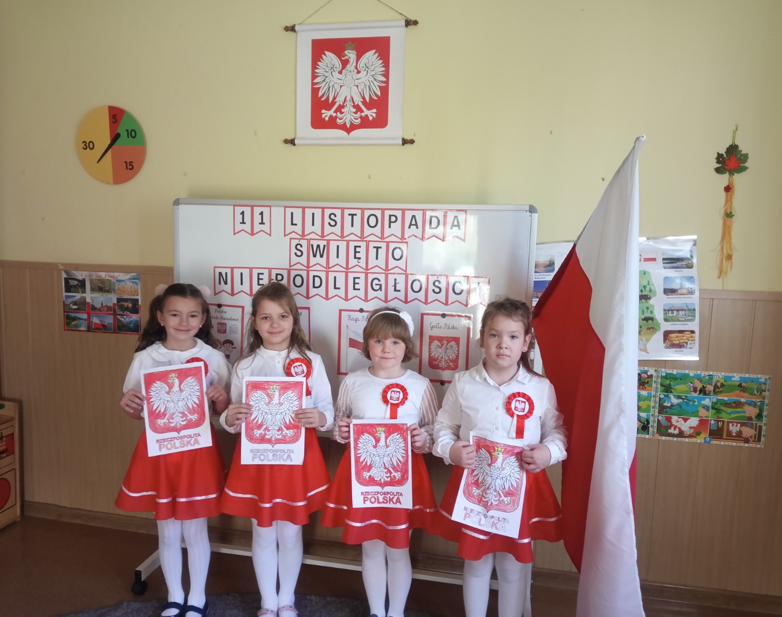 Odśpiewały także hymn państwowy oraz zaśpiewały piosenkę "Jesteśmy Polakami". Dzieci obejrzały w skupieniu film pt.: „11 listopada - Narodowe Święto Niepodległości”, a następnie pokolorowały godło Polski. Na zakończenie uroczystości wspólnie wywiesiliśmy biało – czerwoną flagę na budynku naszego przedszkola. 11 listopada - to wyjątkowy czas dla każdej Polki i Polaka.