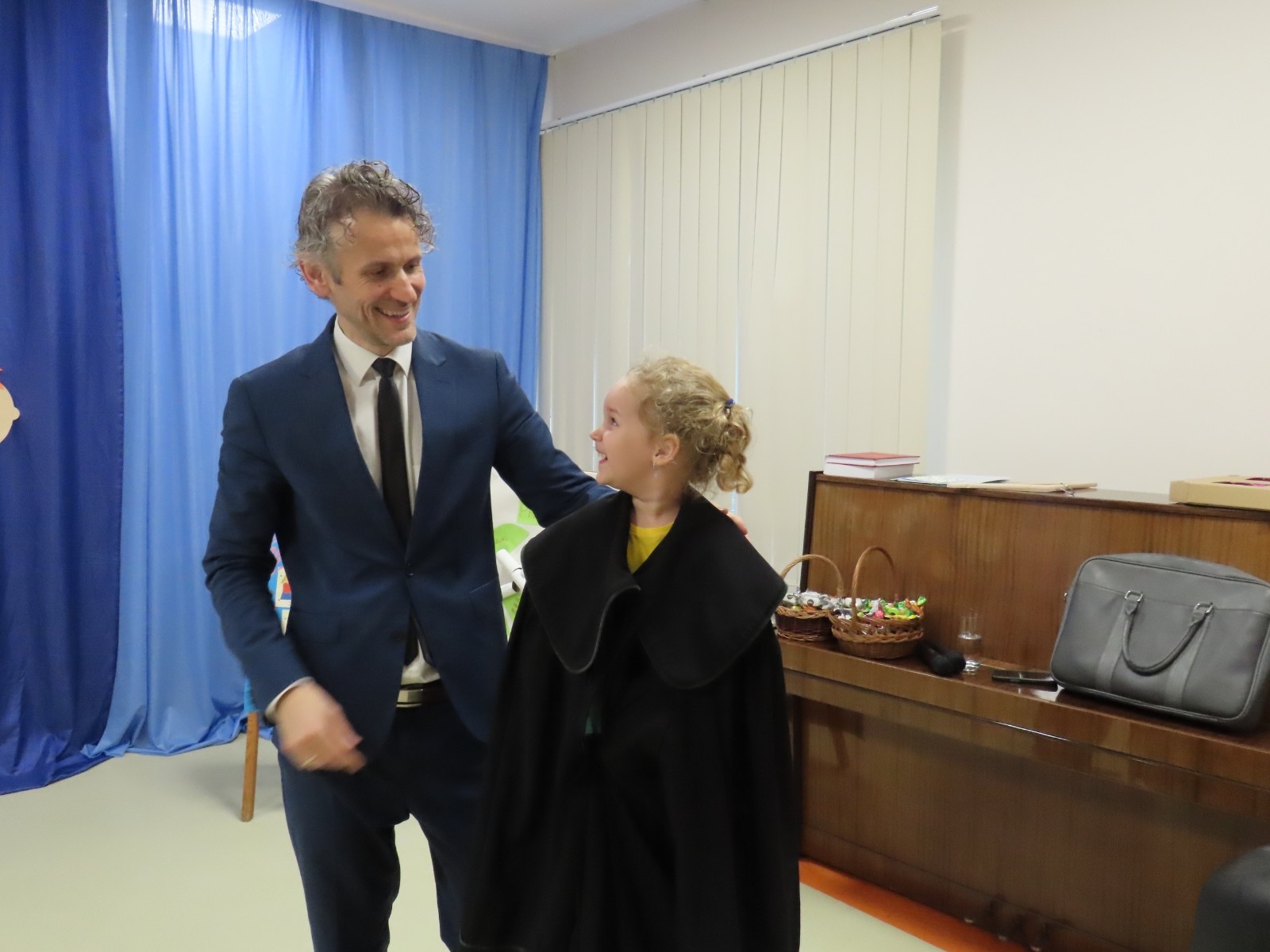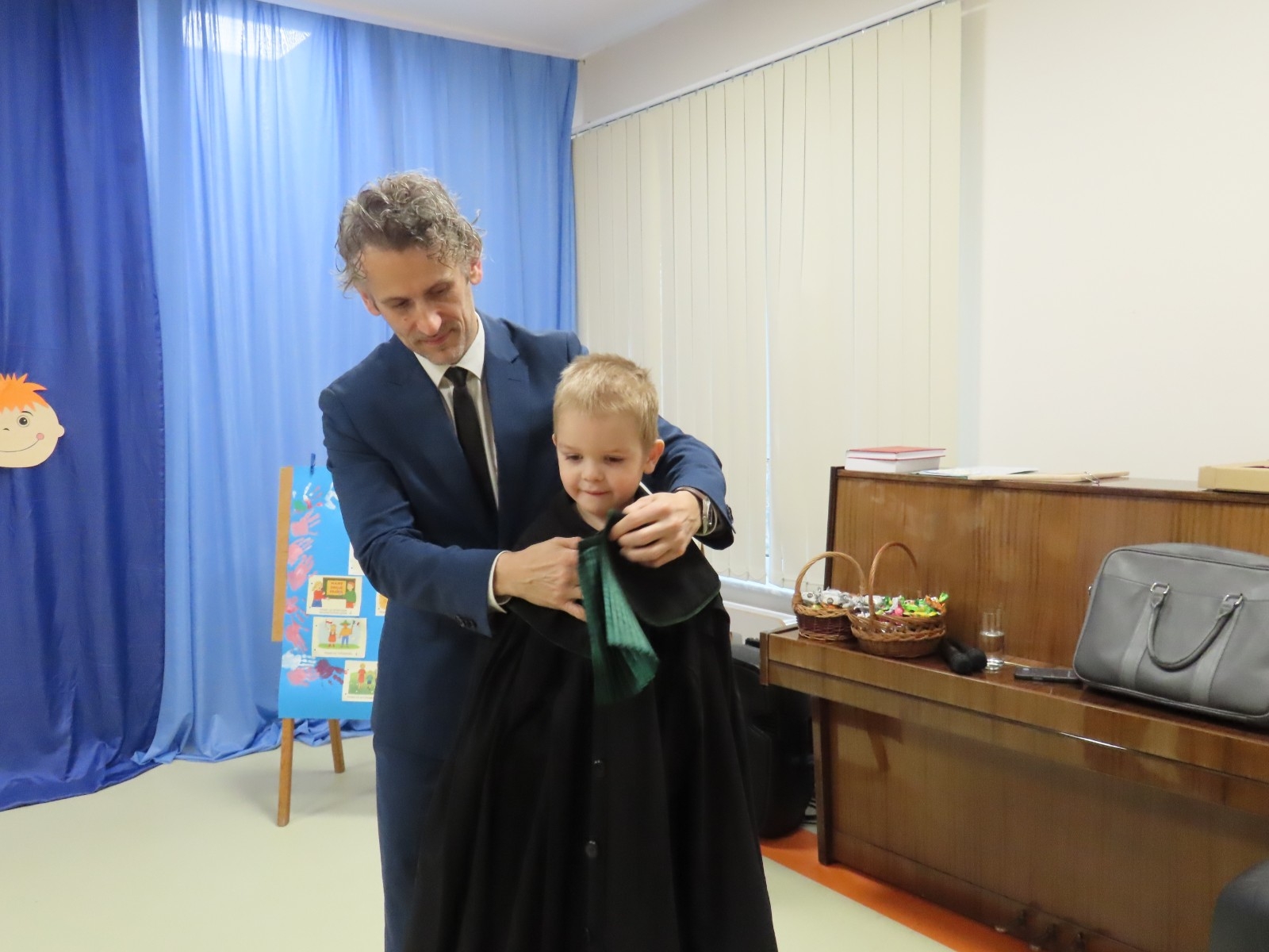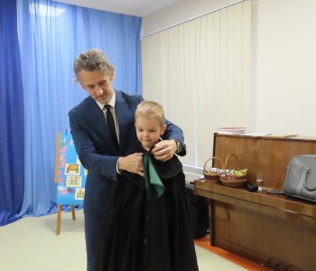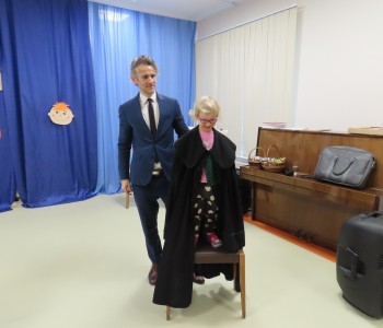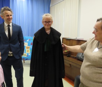 Wyjaśnił również jak wyglądają togi prawników i sędziów. Dużym przeżyciem dla dzieci była możliwość obejrzenia togi z bliska a także przymierzenia stroju adwokata, co wywołało ogromną ciekawość i entuzjazm. Serdecznie dziękujemy panu Maciejowi Moszczeńskiemu za poświęcony czas i przekazanie cennej wiedzy przedszkolakom.