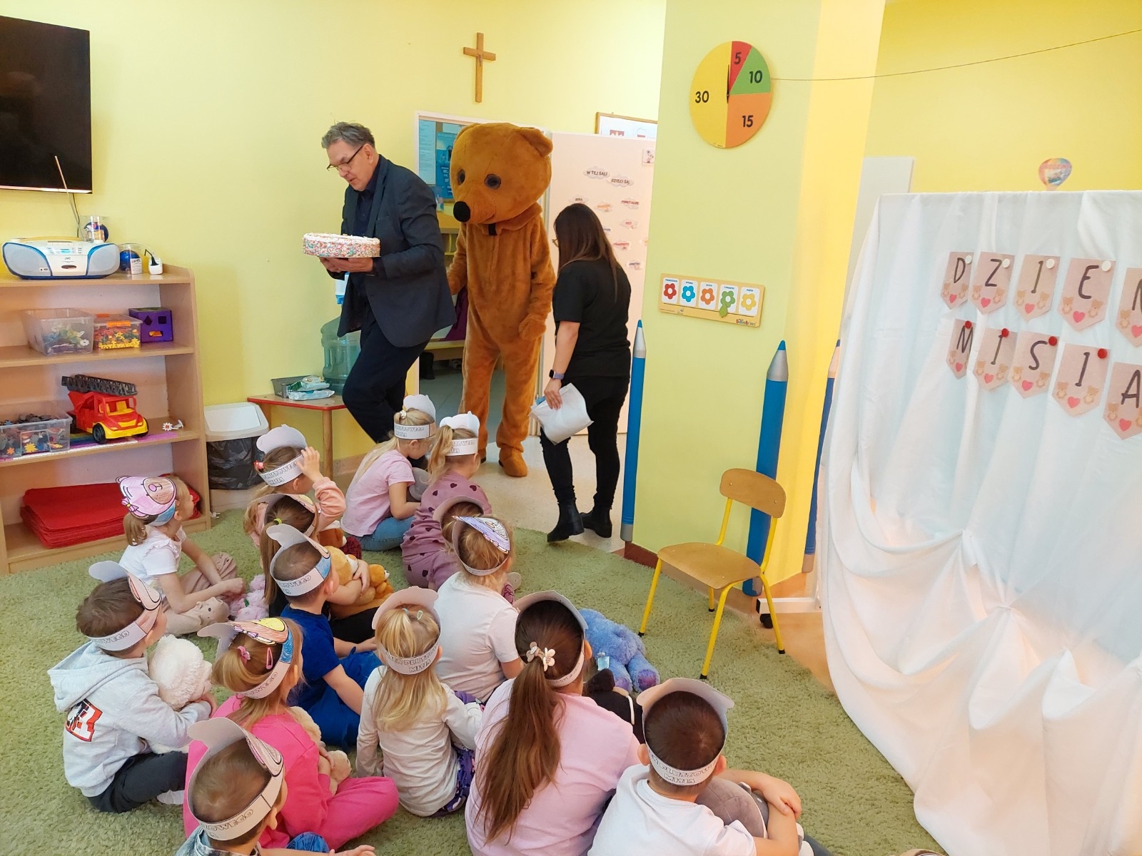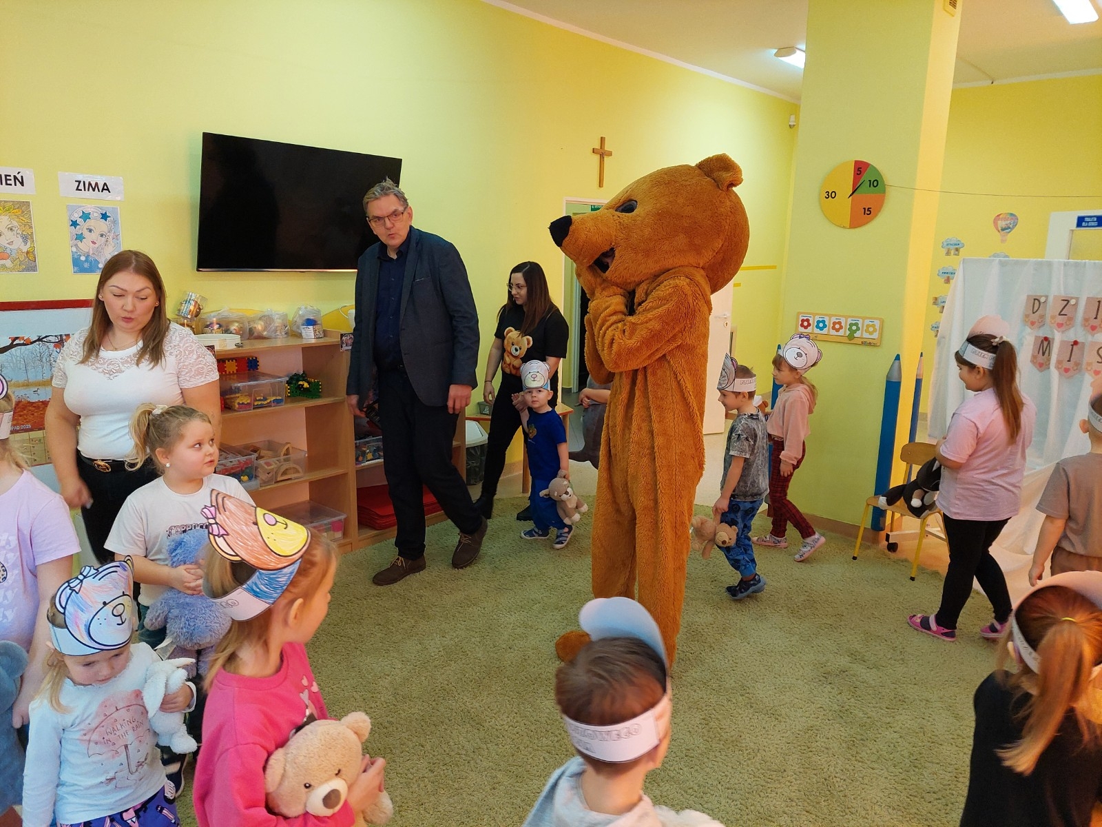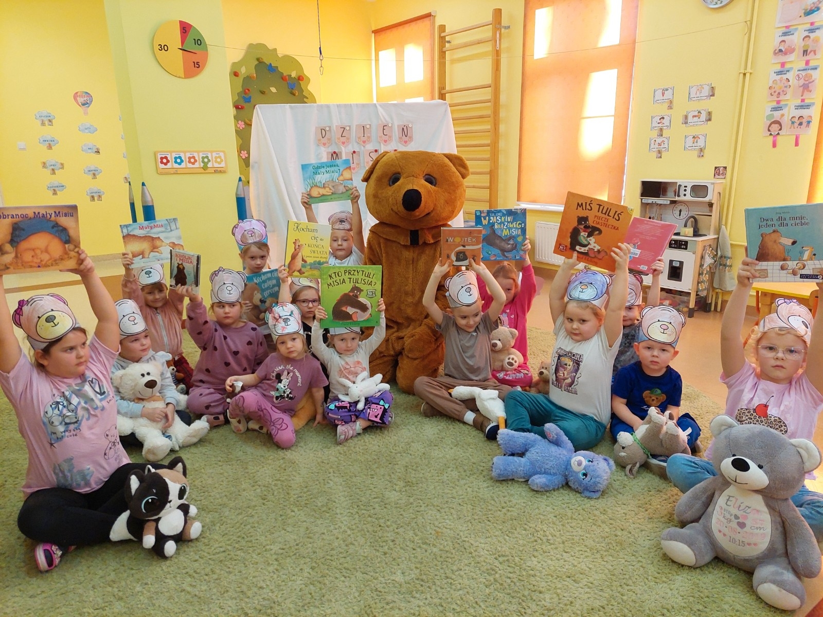 W grupie Koziołka Matołka odbyły się wyjątkowe obchody Dnia Misia. Już od rana w sali panowała radosna atmosfera, którą dodatkowo podkręciła wizyta niezwykłego gościa — żywej maskotki Misia. Dzieci były zachwycone możliwością przytulenia pluszowego przyjaciela i wspólnej zabawy.