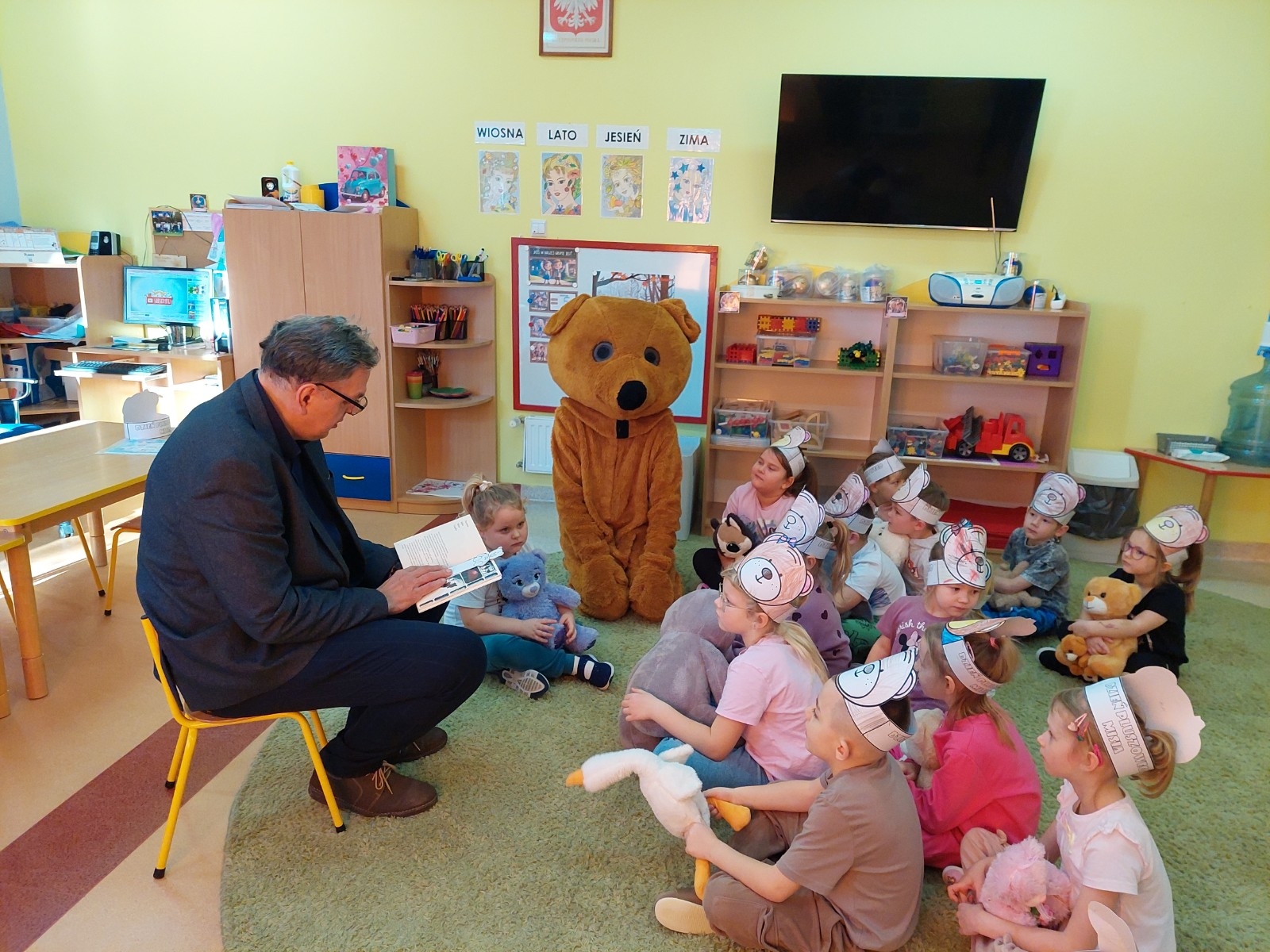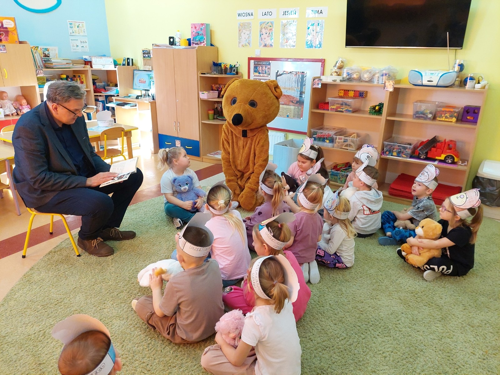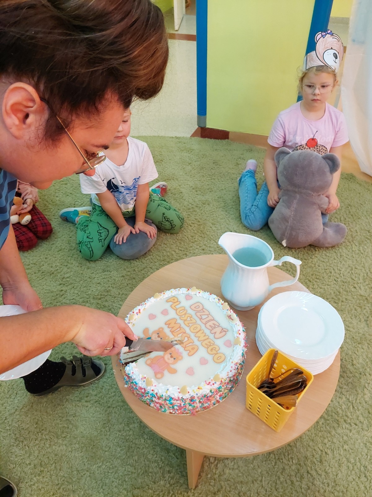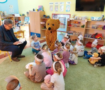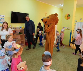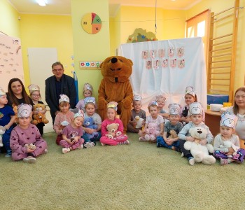 Kolejnym punktem programu było głośne czytanie opowiadania przez radnego Jerzego Staniewskiego. Dzieci z zaciekawieniem słuchały historii o przygodach misiów, angażując się w rozmowę i dzieląc własnymi spostrzeżeniami. Na zakończenie tego pełnego wrażeń dnia na wszystkich czekała słodka niespodzianka — urodzinowy tort, który wspólnie zjedzono przy wesołych rozmowach i śmiechu. To był dzień pełen uśmiechów, ciepła i misiowych przygód, który na długo pozostanie w pamięci najmłodszych.