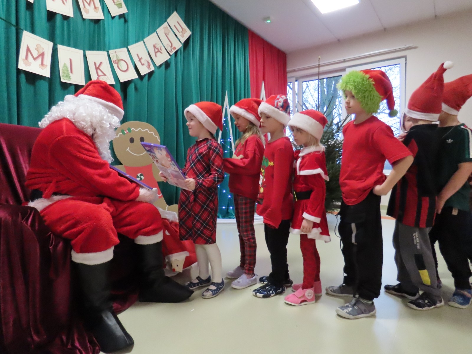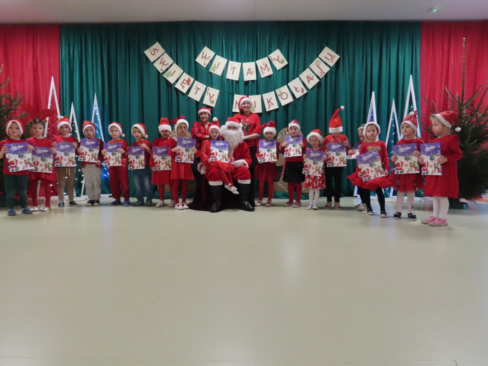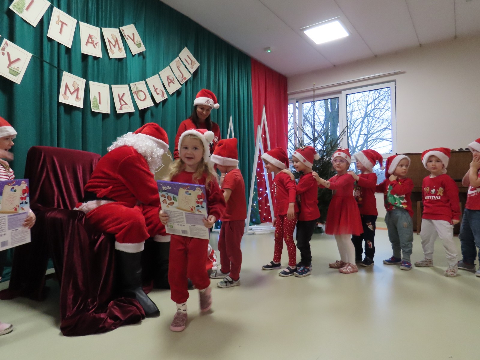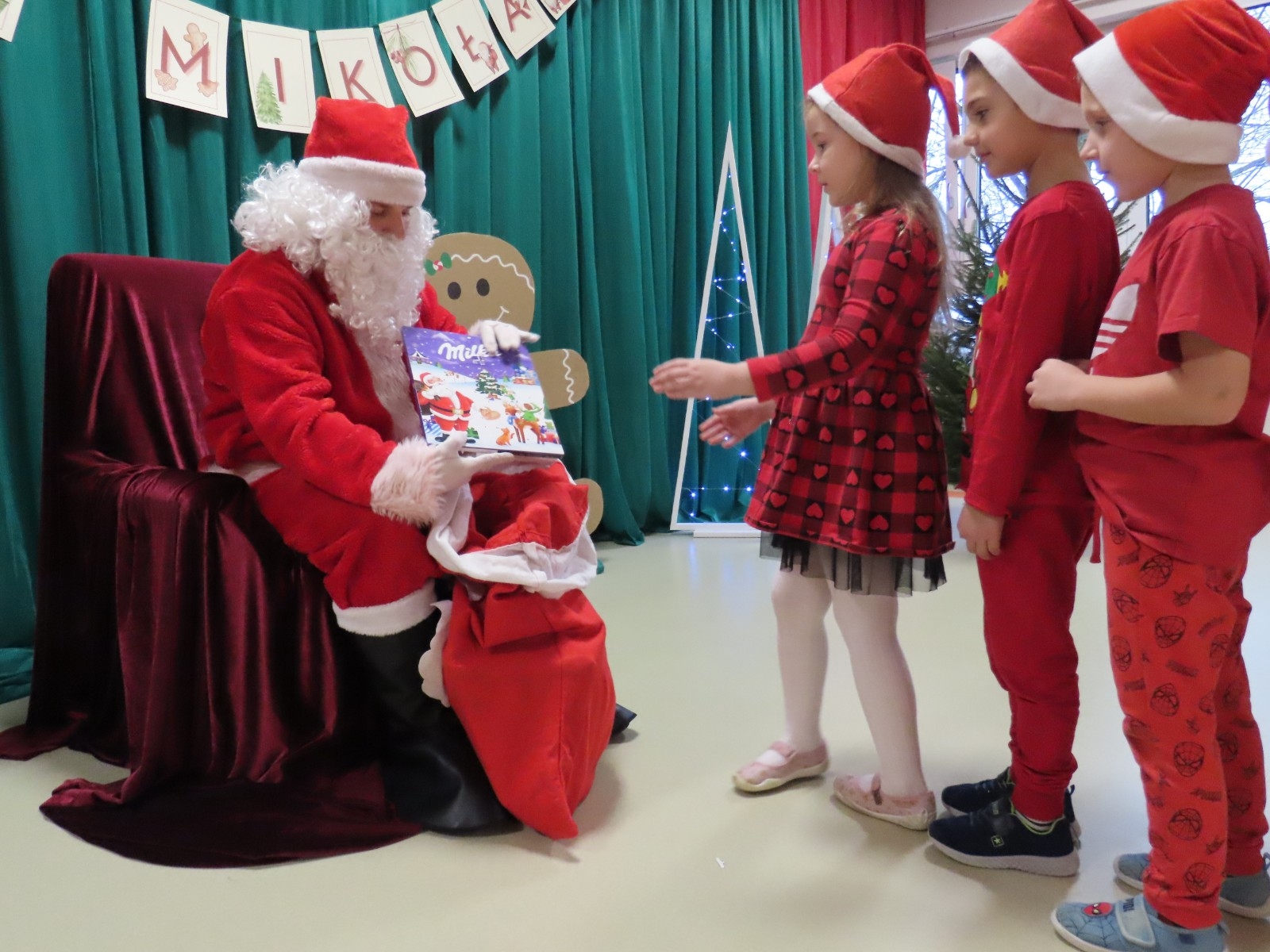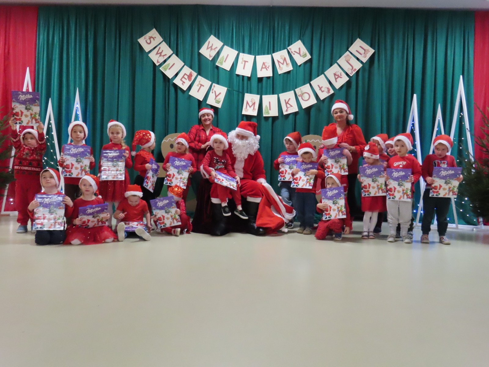 Gdy wszystkie dzieci zebrały się w sali, rozległy się pierwsze dźwięki niezwykłego utworu – „Mikołaje są wśród nas”. Nauczyciele i pracownicy, przebrani w mikołajkowe stroje, wkroczyli na scenę niczym bohaterowie zimowej opowieści. Ich czapki połyskiwały jak gwiazdy, a każdy krok zdawał się rozsypywać niewidzialny pyłek radości. Dzieci patrzyły z szeroko otwartymi oczami, bo nagle okazało się, że wśród nich naprawdę żyją „Mikołaje”– którzy codziennie pomagają, pocieszają, uczą i rozśmieszają. Piosenka wypełniła salę ciepłem, które przypominało przytulny blask kominka, a dzieci klaskały i kołysały się do rytmu. Gdy ostatni dźwięk zniknął jak płatek śniegu na dłoni, pojawił się długo wyczekiwany gość - Święty Mikołaj we własnej osobie! Z długą brodą, wielkim workiem i oczami błyszczącymi tak mocno, jakby znał wszystkie dziecięce marzenia. Rozdał prezenty, wysłuchał życzeń i obiecał, że wróci za rok. Ten dzień był jak bajka, którą chciałoby się czytać bez końca. Bo okazało się, że magia nie żyje tylko w opowieściach, ale mieszka w ludziach, którzy z serca dają uśmiech, piosenkę i chwilę zapomnienia. Właśnie dlatego te Mikołajki zostaną w pamięci dzieci, jak najpiękniejszy świąteczny sen. Serdeczne podziękowania dla Szanownego Gościa, Świętego Mikołaja!!!