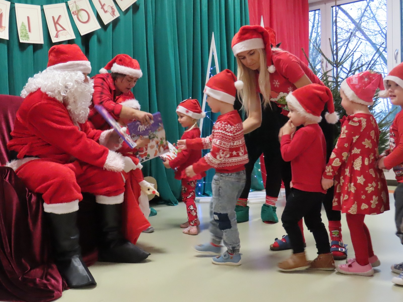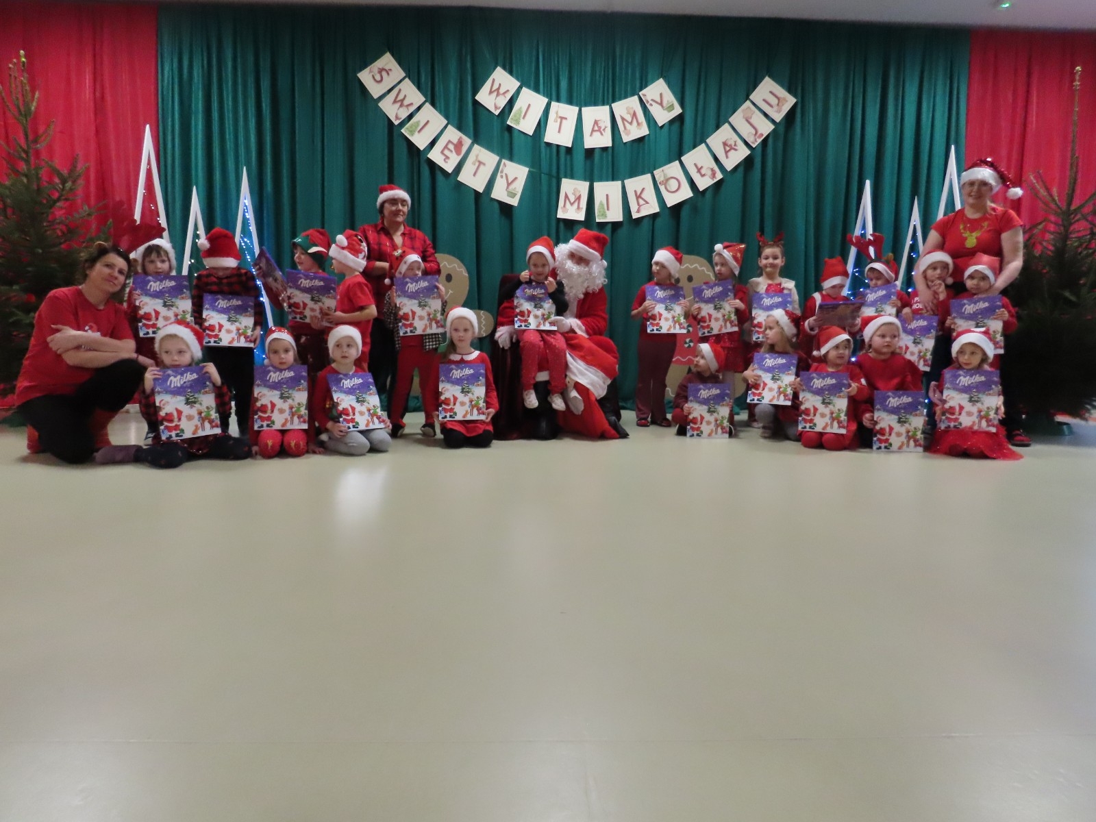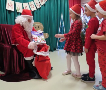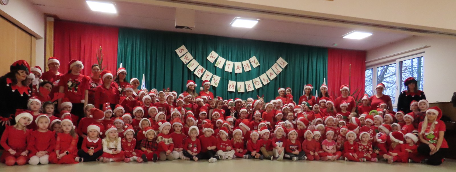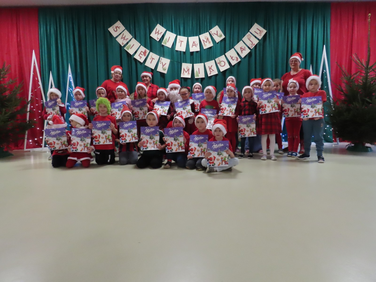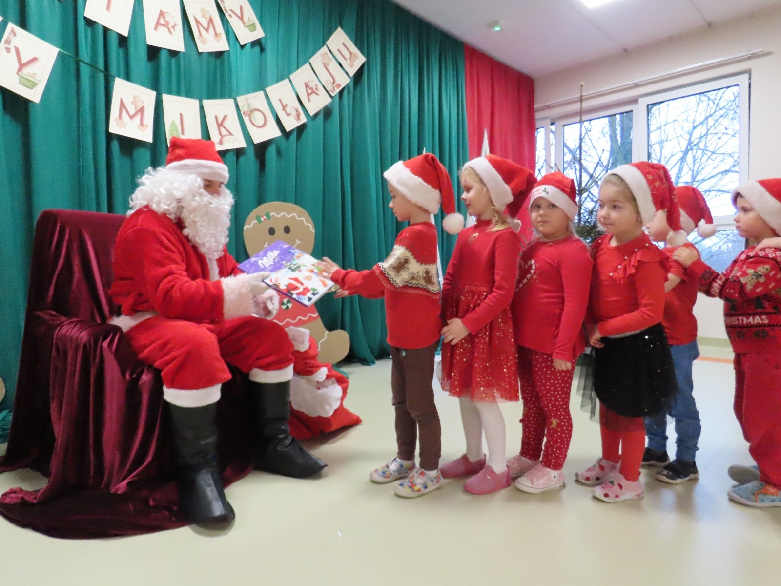 Gdy wszystkie dzieci zebrały się w sali, rozległy się pierwsze dźwięki niezwykłego utworu – „Mikołaje są wśród nas”. Nauczyciele i pracownicy, przebrani w mikołajkowe stroje, wkroczyli na scenę niczym bohaterowie zimowej opowieści. Ich czapki połyskiwały jak gwiazdy, a każdy krok zdawał się rozsypywać niewidzialny pyłek radości. Dzieci patrzyły z szeroko otwartymi oczami, bo nagle okazało się, że wśród nich naprawdę żyją „Mikołaje”– którzy codziennie pomagają, pocieszają, uczą i rozśmieszają. Piosenka wypełniła salę ciepłem, które przypominało przytulny blask kominka, a dzieci klaskały i kołysały się do rytmu. Gdy ostatni dźwięk zniknął jak płatek śniegu na dłoni, pojawił się długo wyczekiwany gość - Święty Mikołaj we własnej osobie! Z długą brodą, wielkim workiem i oczami błyszczącymi tak mocno, jakby znał wszystkie dziecięce marzenia. Rozdał prezenty, wysłuchał życzeń i obiecał, że wróci za rok. Ten dzień był jak bajka, którą chciałoby się czytać bez końca. Bo okazało się, że magia nie żyje tylko w opowieściach, ale mieszka w ludziach, którzy z serca dają uśmiech, piosenkę i chwilę zapomnienia. Właśnie dlatego te Mikołajki zostaną w pamięci dzieci, jak najpiękniejszy świąteczny sen. Serdeczne podziękowania dla Szanownego Gościa, Świętego Mikołaja!!!