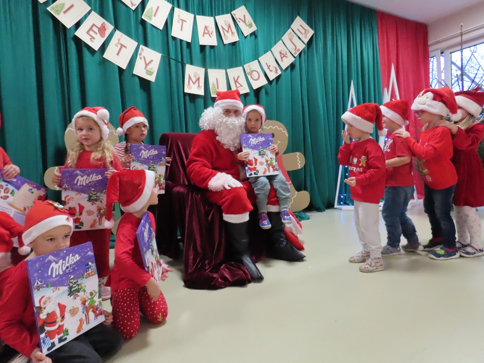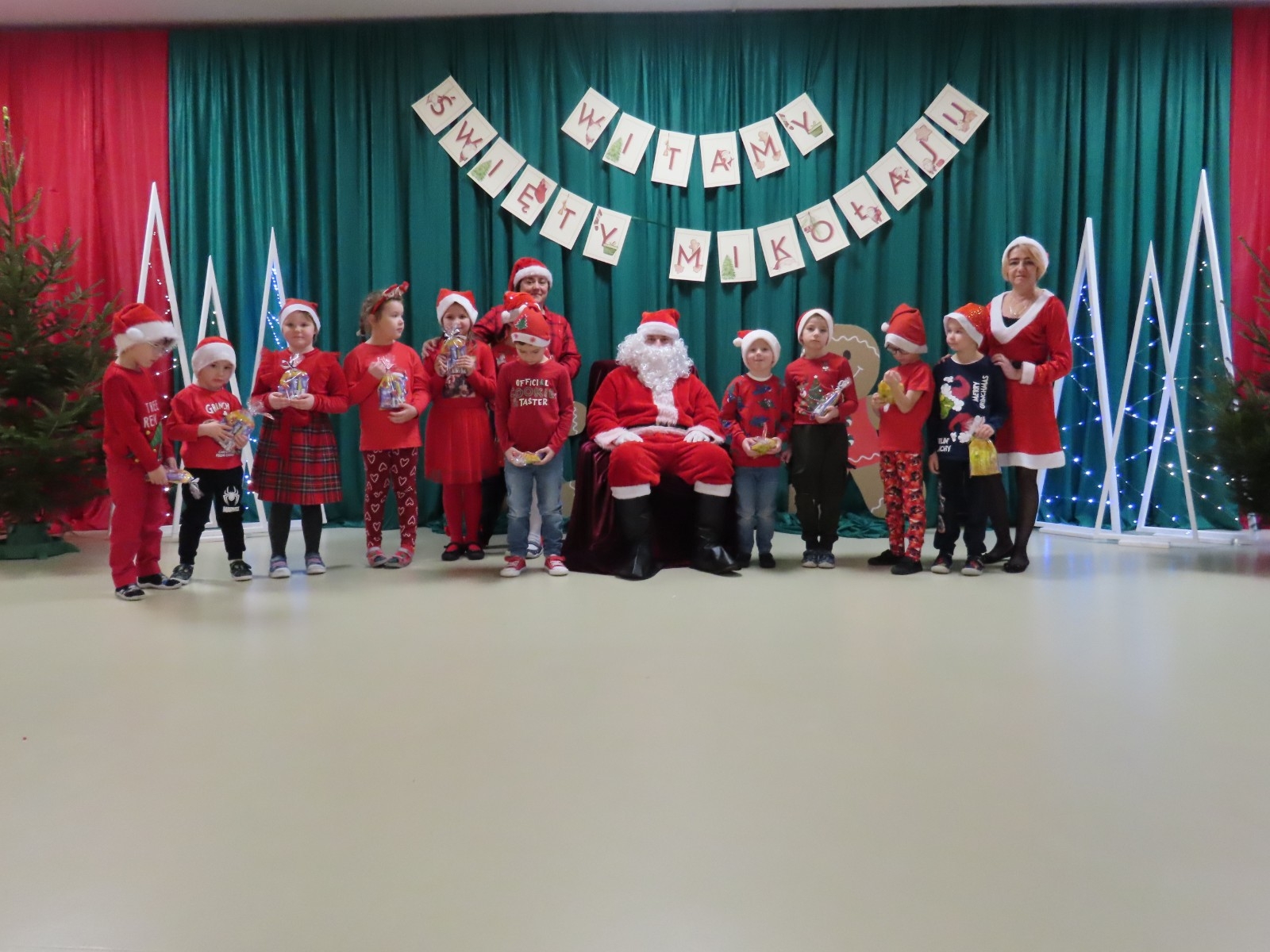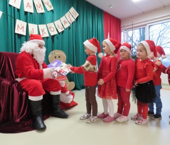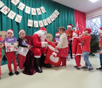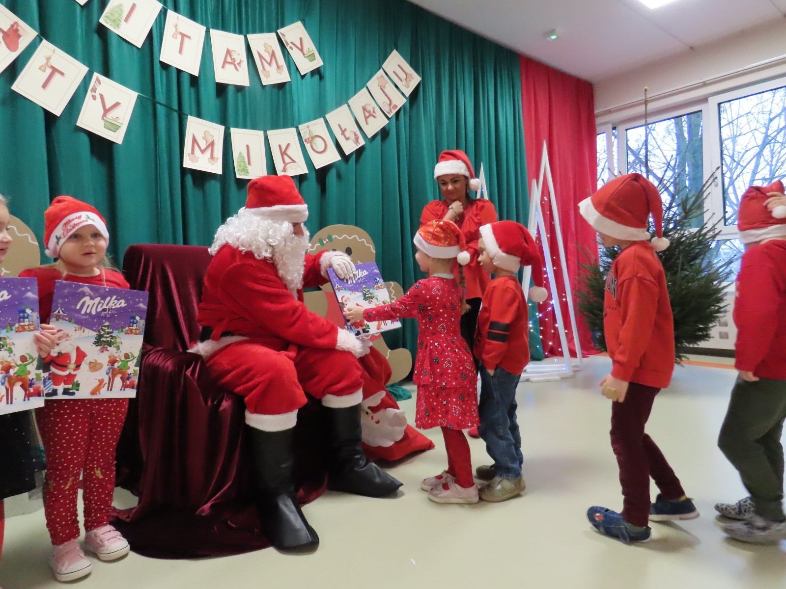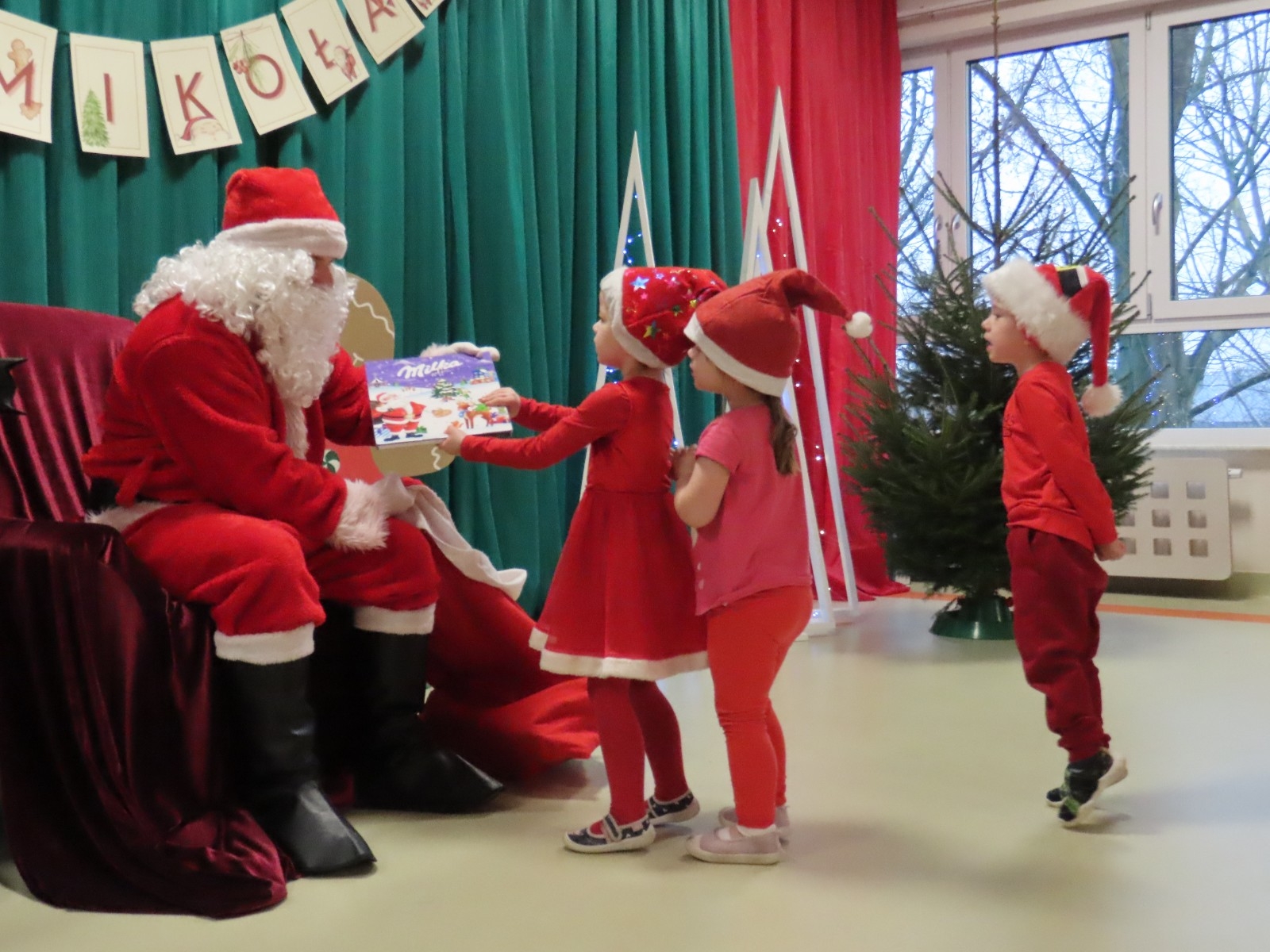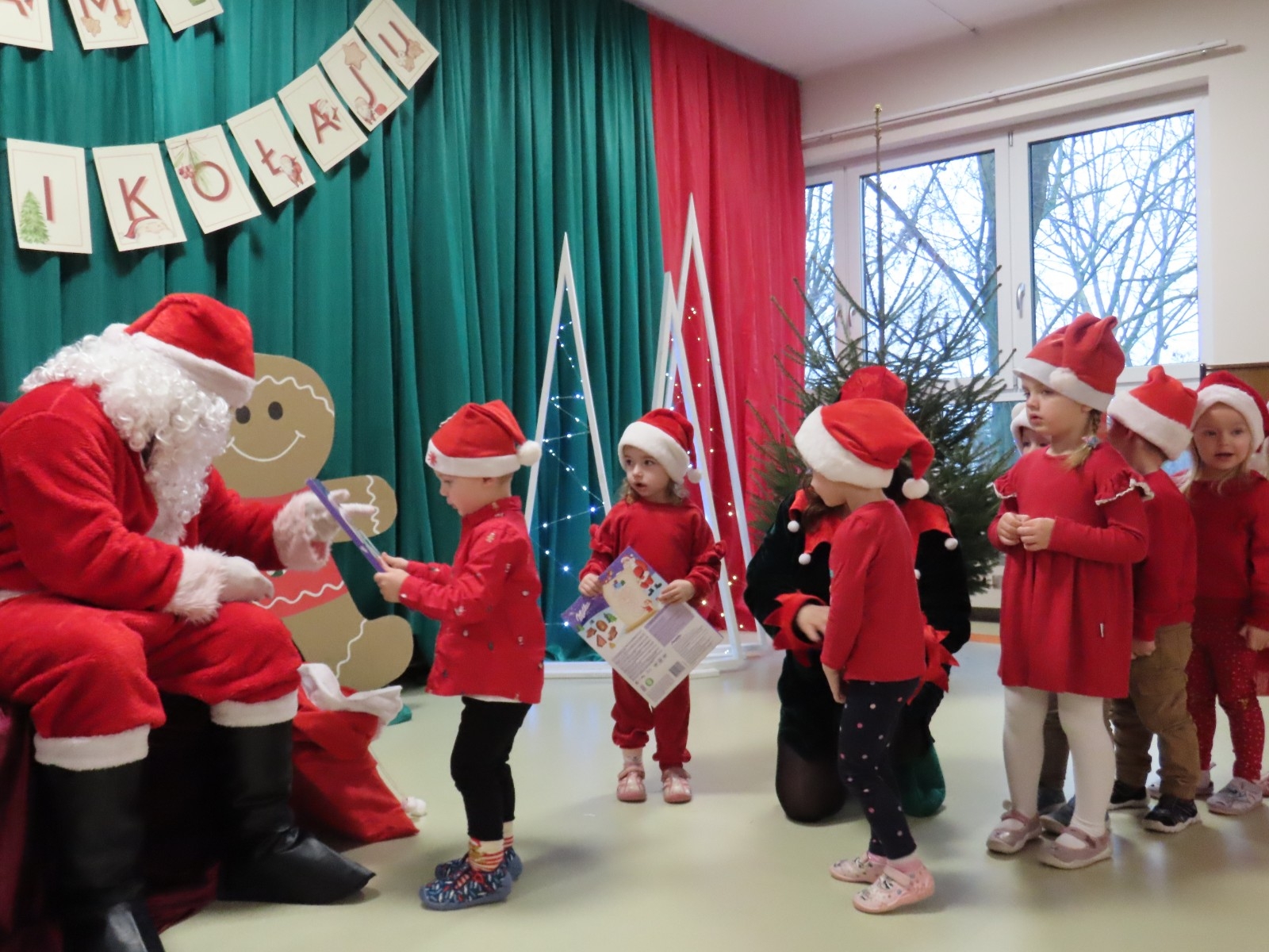 Gdy wszystkie dzieci zebrały się w sali, rozległy się pierwsze dźwięki niezwykłego utworu – „Mikołaje są wśród nas”. Nauczyciele i pracownicy, przebrani w mikołajkowe stroje, wkroczyli na scenę niczym bohaterowie zimowej opowieści. Ich czapki połyskiwały jak gwiazdy, a każdy krok zdawał się rozsypywać niewidzialny pyłek radości. Dzieci patrzyły z szeroko otwartymi oczami, bo nagle okazało się, że wśród nich naprawdę żyją „Mikołaje”– którzy codziennie pomagają, pocieszają, uczą i rozśmieszają. Piosenka wypełniła salę ciepłem, które przypominało przytulny blask kominka, a dzieci klaskały i kołysały się do rytmu. Gdy ostatni dźwięk zniknął jak płatek śniegu na dłoni, pojawił się długo wyczekiwany gość - Święty Mikołaj we własnej osobie! Z długą brodą, wielkim workiem i oczami błyszczącymi tak mocno, jakby znał wszystkie dziecięce marzenia. Rozdał prezenty, wysłuchał życzeń i obiecał, że wróci za rok. Ten dzień był jak bajka, którą chciałoby się czytać bez końca. Bo okazało się, że magia nie żyje tylko w opowieściach, ale mieszka w ludziach, którzy z serca dają uśmiech, piosenkę i chwilę zapomnienia. Właśnie dlatego te Mikołajki zostaną w pamięci dzieci, jak najpiękniejszy świąteczny sen. Serdeczne podziękowania dla Szanownego Gościa, Świętego Mikołaja!!!