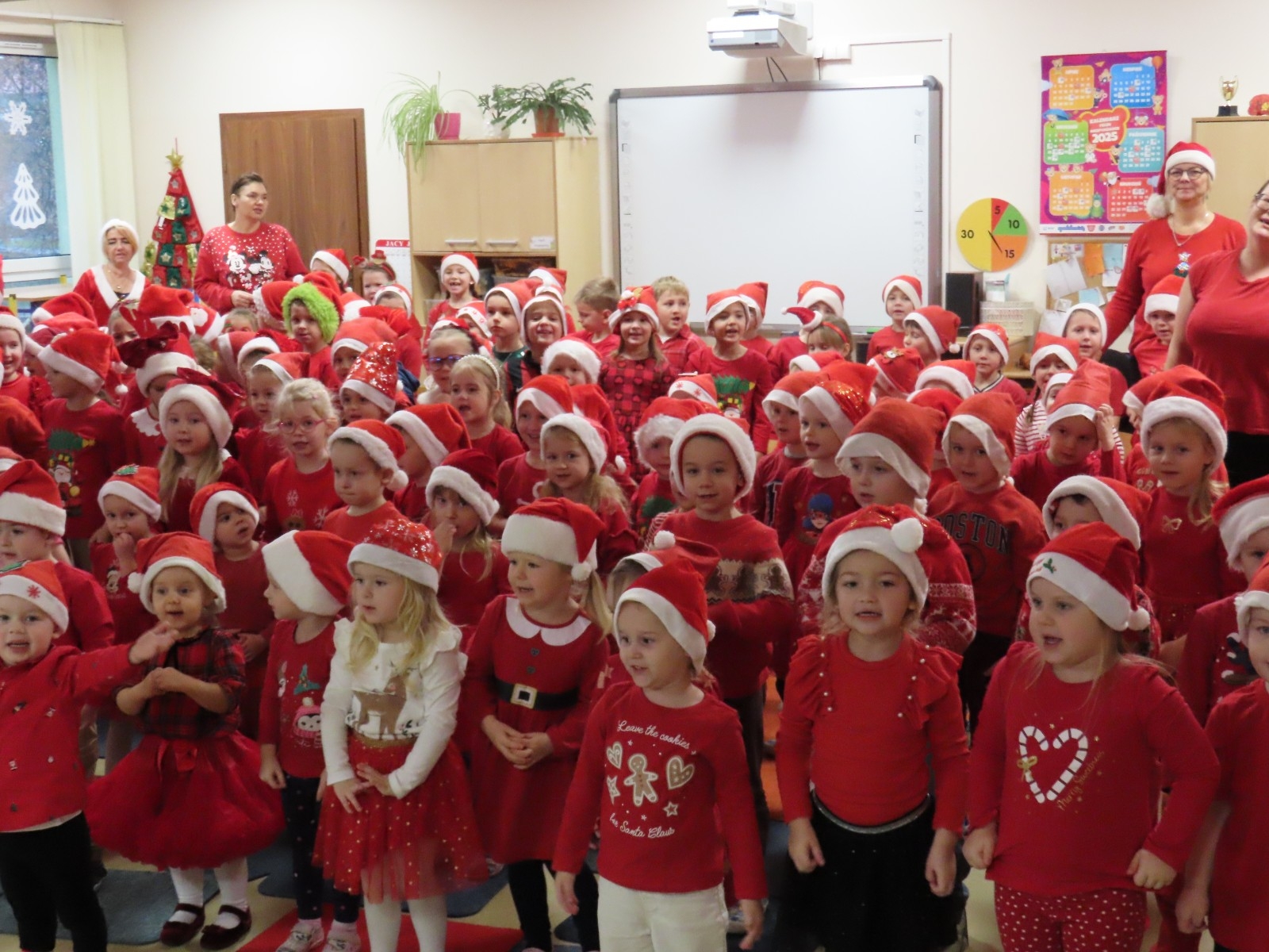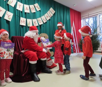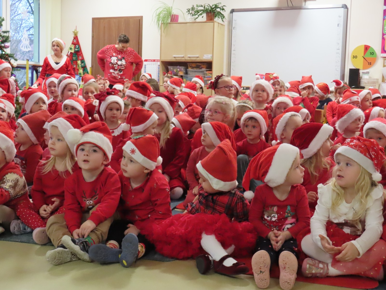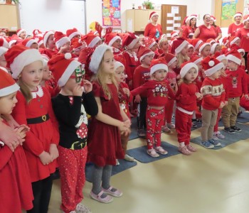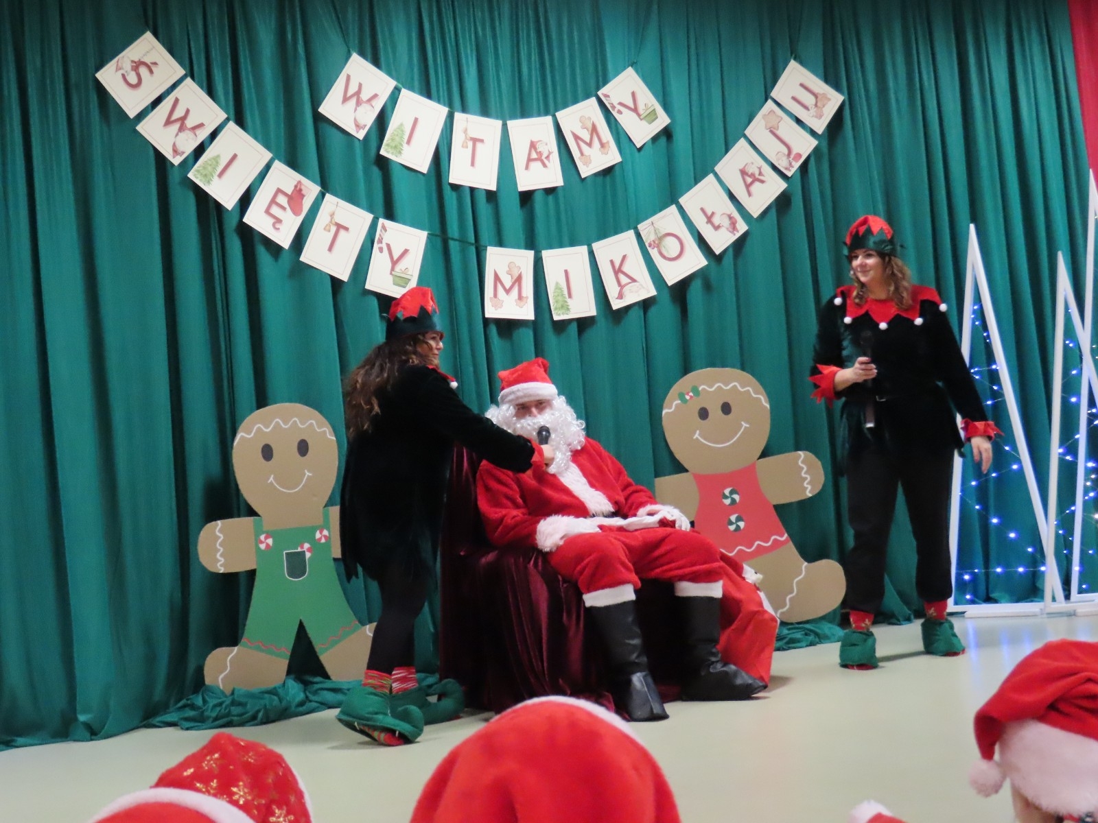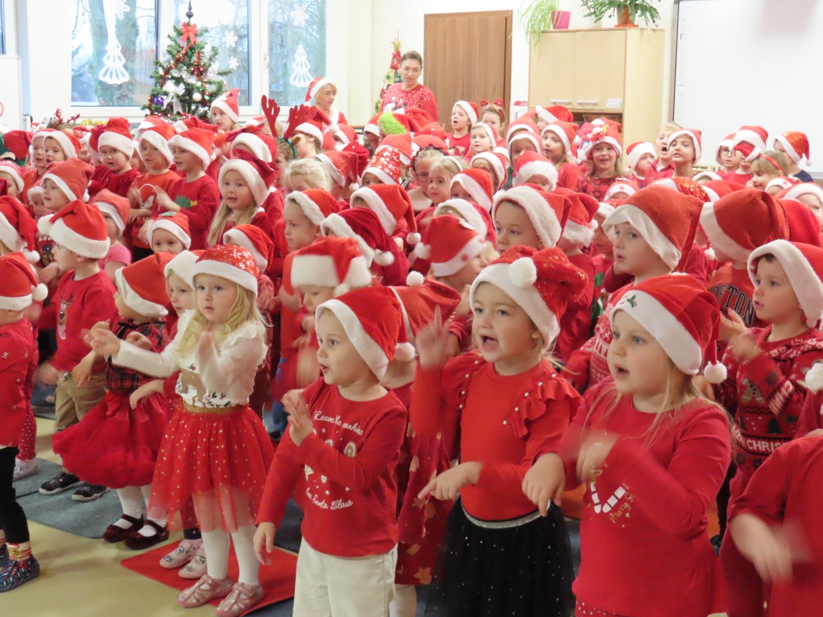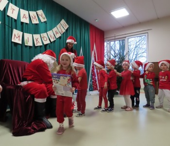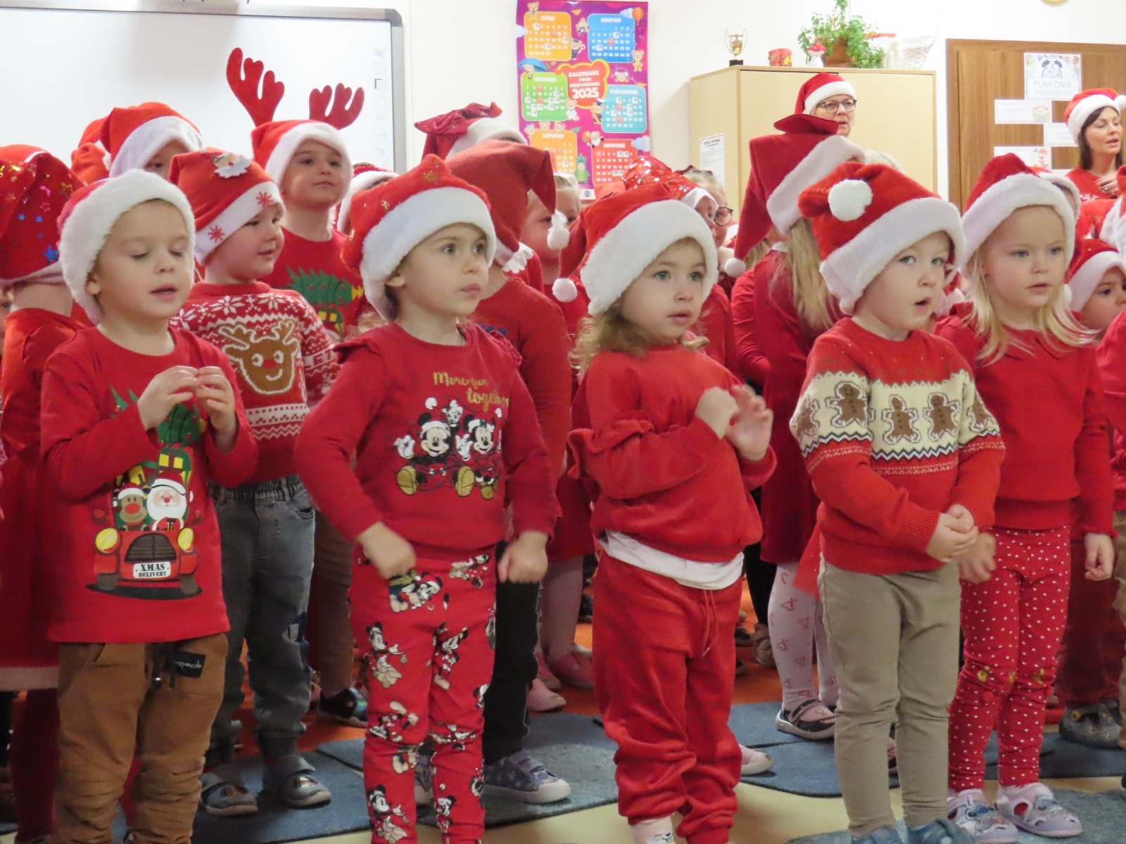 Gdy wszystkie dzieci zebrały się w sali, rozległy się pierwsze dźwięki niezwykłego utworu – „Mikołaje są wśród nas”. Nauczyciele i pracownicy, przebrani w mikołajkowe stroje, wkroczyli na scenę niczym bohaterowie zimowej opowieści. Ich czapki połyskiwały jak gwiazdy, a każdy krok zdawał się rozsypywać niewidzialny pyłek radości. Dzieci patrzyły z szeroko otwartymi oczami, bo nagle okazało się, że wśród nich naprawdę żyją „Mikołaje”– którzy codziennie pomagają, pocieszają, uczą i rozśmieszają. Piosenka wypełniła salę ciepłem, które przypominało przytulny blask kominka, a dzieci klaskały i kołysały się do rytmu. Gdy ostatni dźwięk zniknął jak płatek śniegu na dłoni, pojawił się długo wyczekiwany gość - Święty Mikołaj we własnej osobie! Z długą brodą, wielkim workiem i oczami błyszczącymi tak mocno, jakby znał wszystkie dziecięce marzenia. Rozdał prezenty, wysłuchał życzeń i obiecał, że wróci za rok. Ten dzień był jak bajka, którą chciałoby się czytać bez końca. Bo okazało się, że magia nie żyje tylko w opowieściach, ale mieszka w ludziach, którzy z serca dają uśmiech, piosenkę i chwilę zapomnienia. Właśnie dlatego te Mikołajki zostaną w pamięci dzieci, jak najpiękniejszy świąteczny sen. Serdeczne podziękowania dla Szanownego Gościa, Świętego Mikołaja!!!