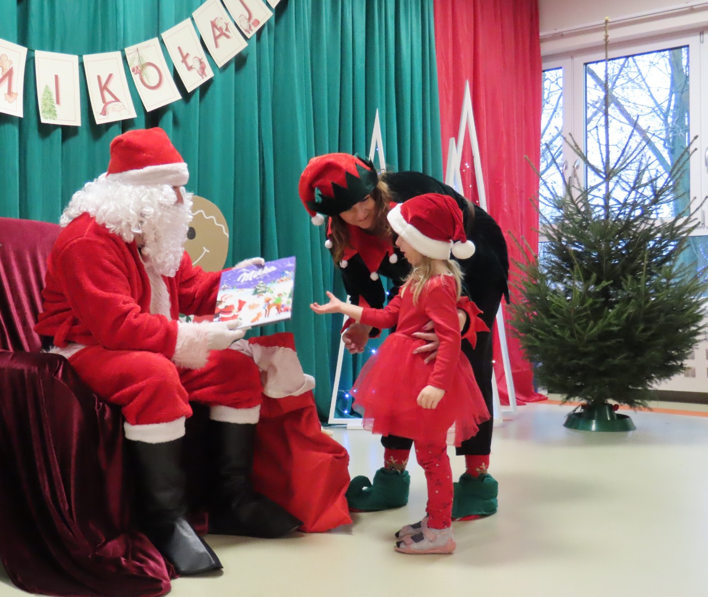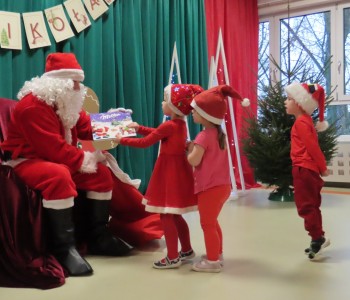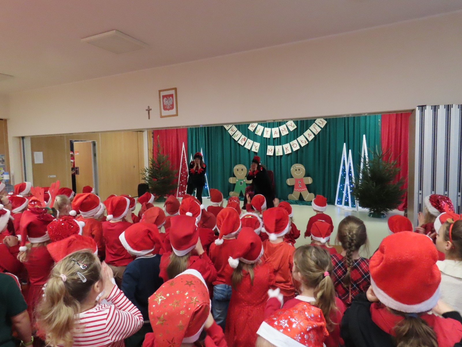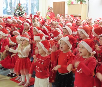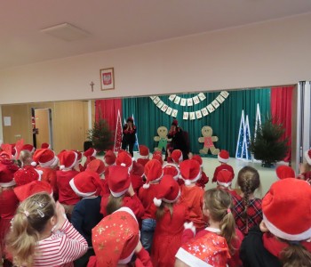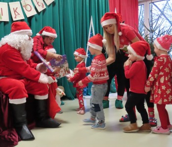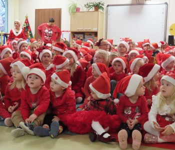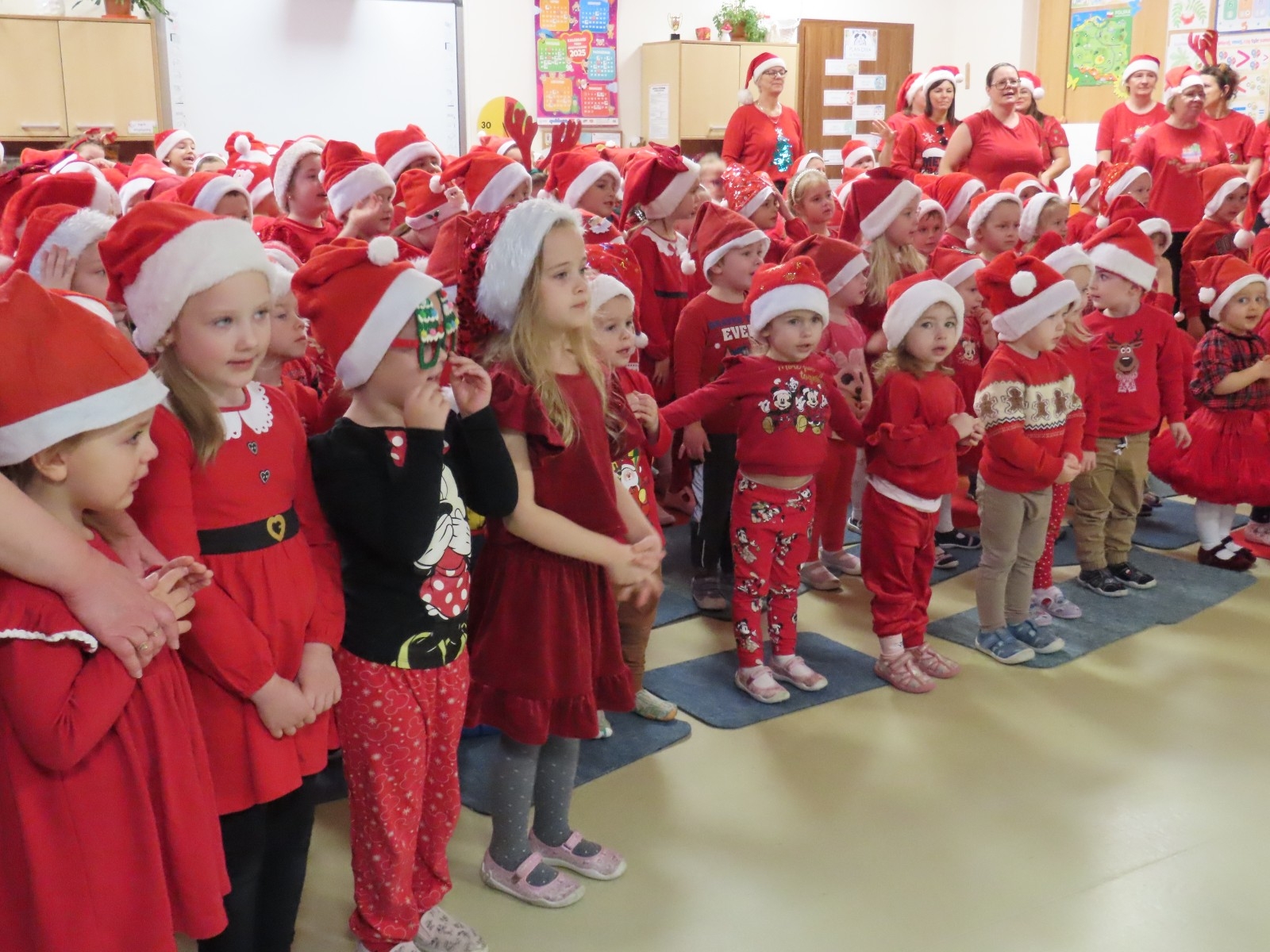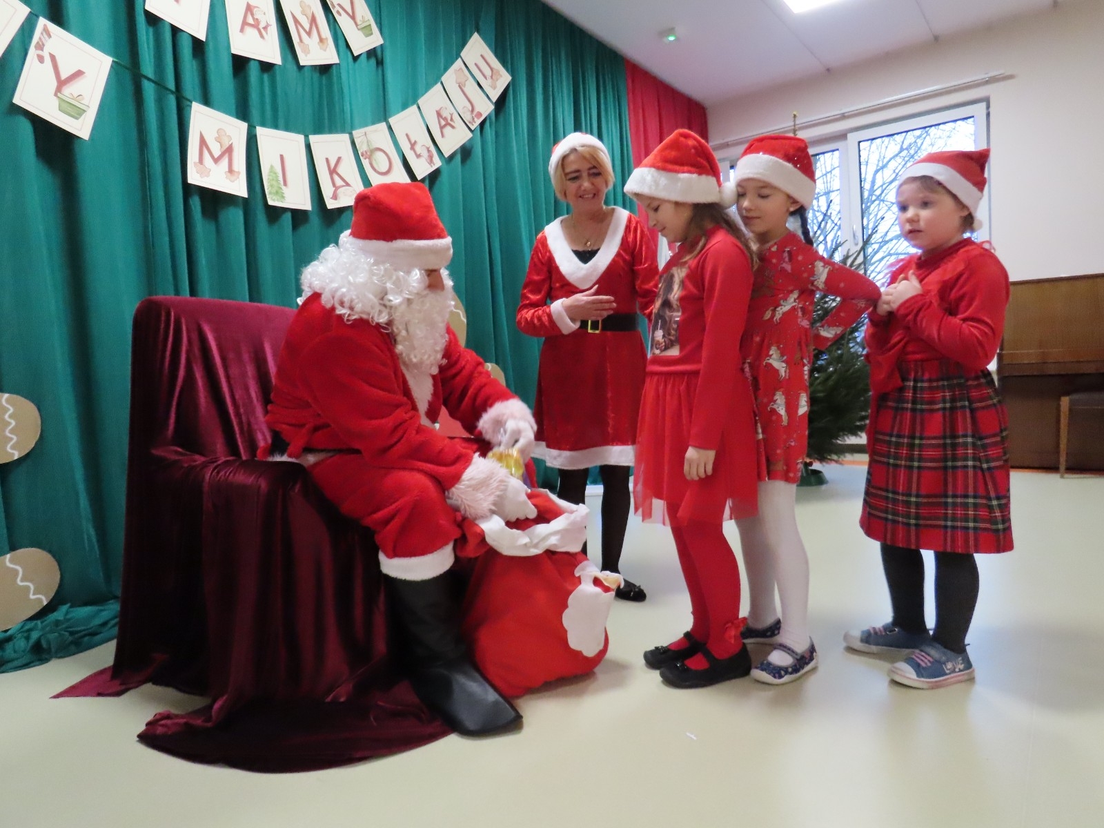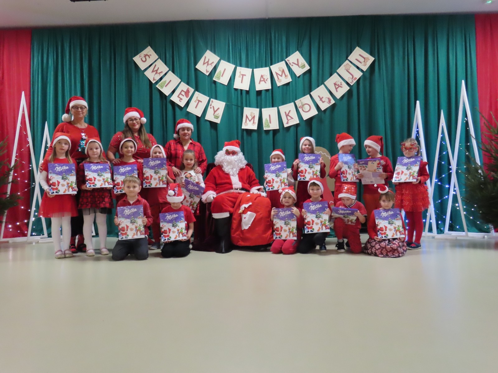 Gdy wszystkie dzieci zebrały się w sali, rozległy się pierwsze dźwięki niezwykłego utworu – „Mikołaje są wśród nas”. Nauczyciele i pracownicy, przebrani w mikołajkowe stroje, wkroczyli na scenę niczym bohaterowie zimowej opowieści. Ich czapki połyskiwały jak gwiazdy, a każdy krok zdawał się rozsypywać niewidzialny pyłek radości. Dzieci patrzyły z szeroko otwartymi oczami, bo nagle okazało się, że wśród nich naprawdę żyją „Mikołaje”– którzy codziennie pomagają, pocieszają, uczą i rozśmieszają. Piosenka wypełniła salę ciepłem, które przypominało przytulny blask kominka, a dzieci klaskały i kołysały się do rytmu. Gdy ostatni dźwięk zniknął jak płatek śniegu na dłoni, pojawił się długo wyczekiwany gość - Święty Mikołaj we własnej osobie! Z długą brodą, wielkim workiem i oczami błyszczącymi tak mocno, jakby znał wszystkie dziecięce marzenia. Rozdał prezenty, wysłuchał życzeń i obiecał, że wróci za rok. Ten dzień był jak bajka, którą chciałoby się czytać bez końca. Bo okazało się, że magia nie żyje tylko w opowieściach, ale mieszka w ludziach, którzy z serca dają uśmiech, piosenkę i chwilę zapomnienia. Właśnie dlatego te Mikołajki zostaną w pamięci dzieci, jak najpiękniejszy świąteczny sen. Serdeczne podziękowania dla Szanownego Gościa, Świętego Mikołaja!!!