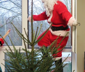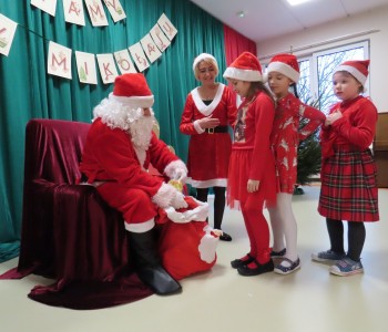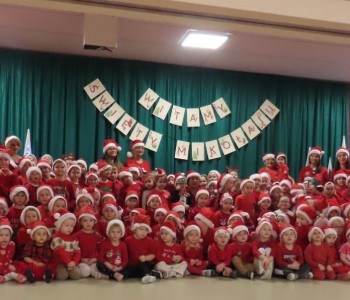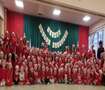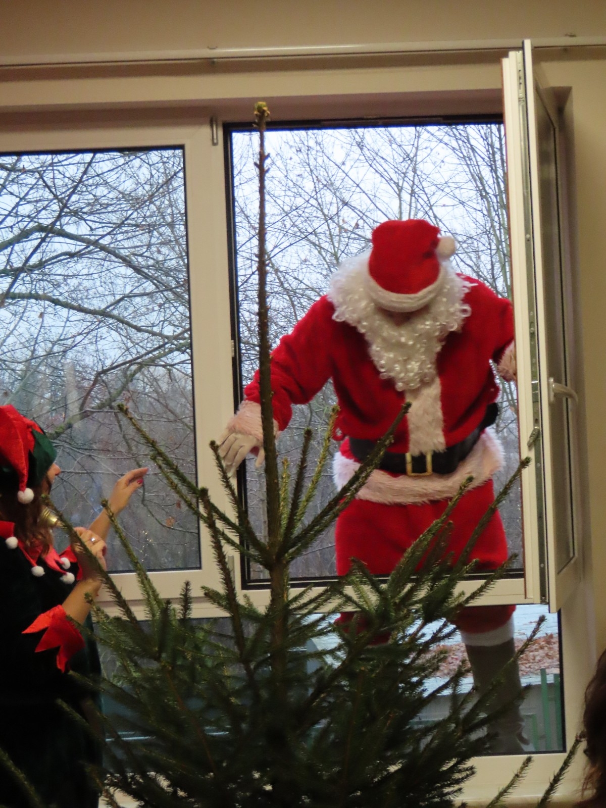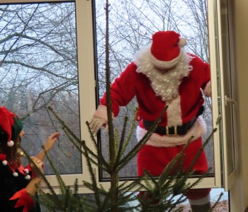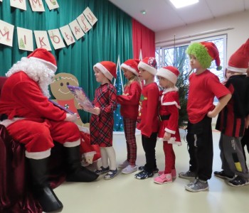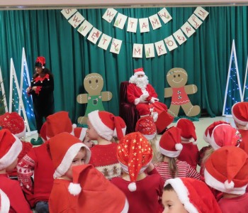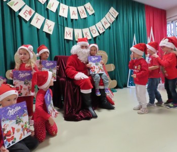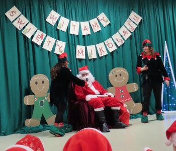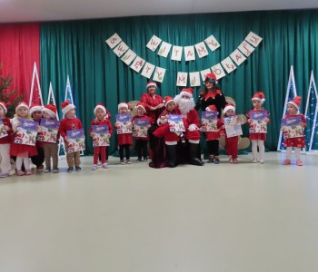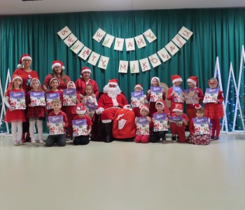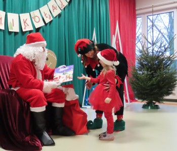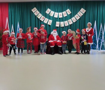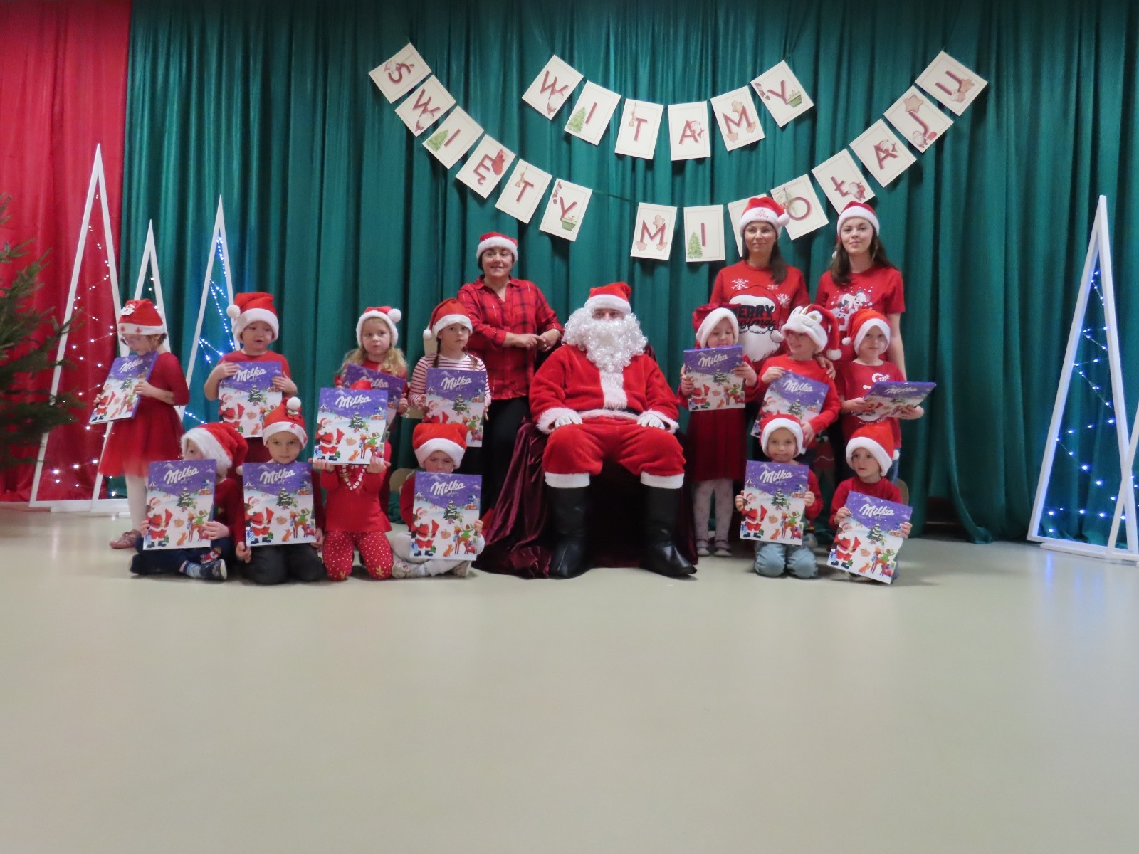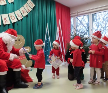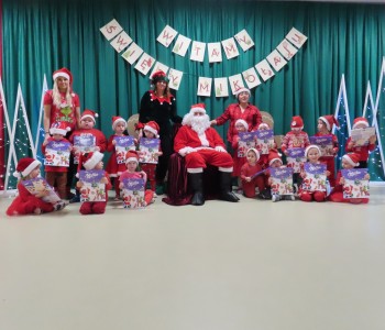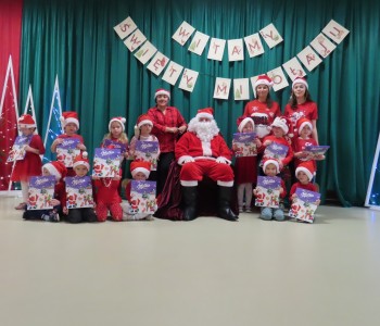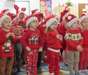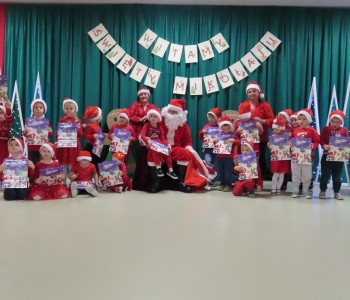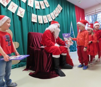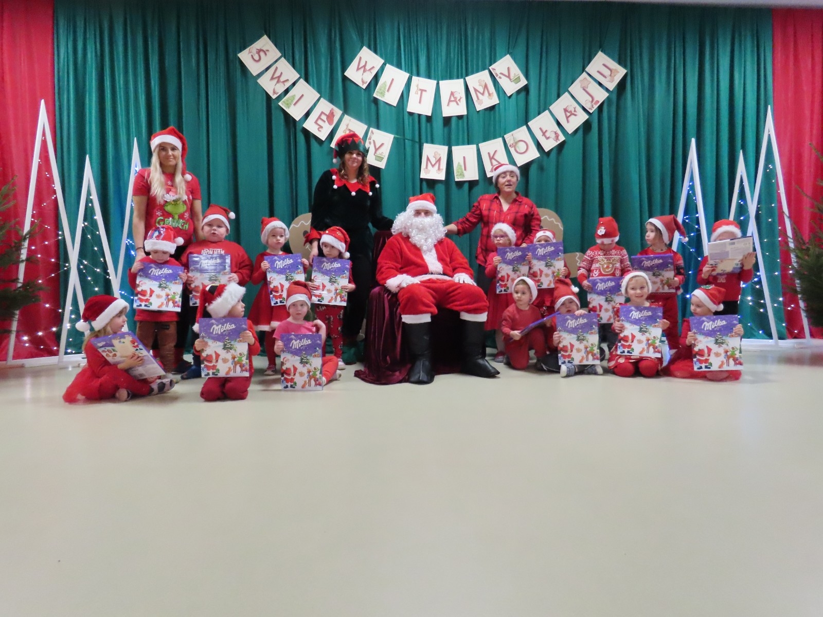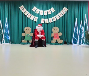 Gdy wszystkie dzieci zebrały się w sali, rozległy się pierwsze dźwięki niezwykłego utworu – „Mikołaje są wśród nas”. Nauczyciele i pracownicy, przebrani w mikołajkowe stroje, wkroczyli na scenę niczym bohaterowie zimowej opowieści. Ich czapki połyskiwały jak gwiazdy, a każdy krok zdawał się rozsypywać niewidzialny pyłek radości. Dzieci patrzyły z szeroko otwartymi oczami, bo nagle okazało się, że wśród nich naprawdę żyją „Mikołaje”– którzy codziennie pomagają, pocieszają, uczą i rozśmieszają. Piosenka wypełniła salę ciepłem, które przypominało przytulny blask kominka, a dzieci klaskały i kołysały się do rytmu. Gdy ostatni dźwięk zniknął jak płatek śniegu na dłoni, pojawił się długo wyczekiwany gość - Święty Mikołaj we własnej osobie! Z długą brodą, wielkim workiem i oczami błyszczącymi tak mocno, jakby znał wszystkie dziecięce marzenia. Rozdał prezenty, wysłuchał życzeń i obiecał, że wróci za rok. Ten dzień był jak bajka, którą chciałoby się czytać bez końca. Bo okazało się, że magia nie żyje tylko w opowieściach, ale mieszka w ludziach, którzy z serca dają uśmiech, piosenkę i chwilę zapomnienia. Właśnie dlatego te Mikołajki zostaną w pamięci dzieci, jak najpiękniejszy świąteczny sen. Serdeczne podziękowania dla Szanownego Gościa, Świętego Mikołaja!!!