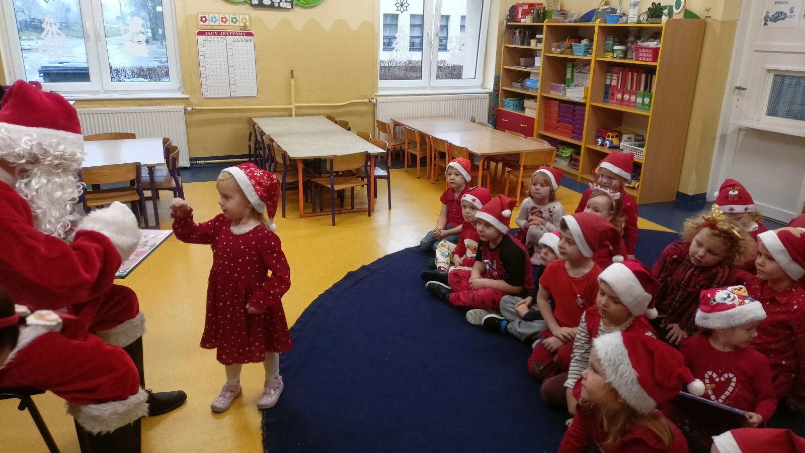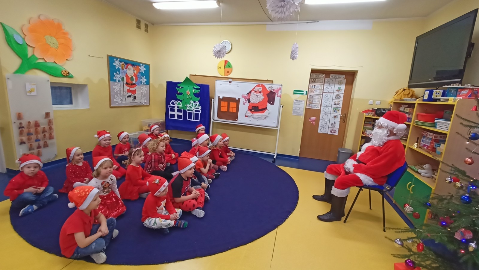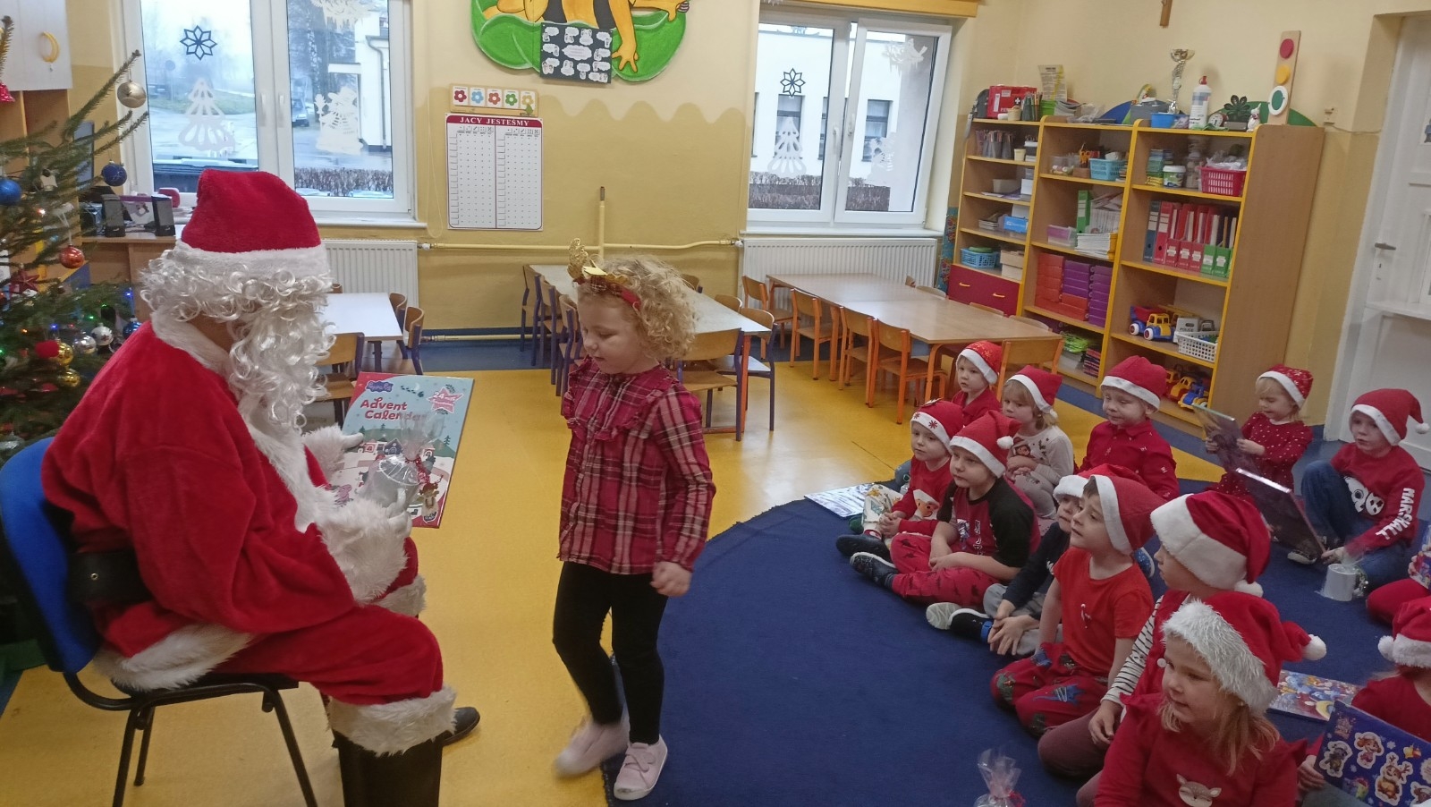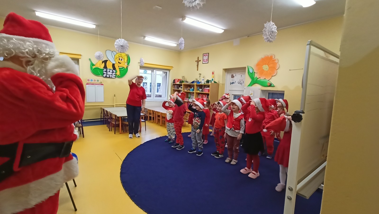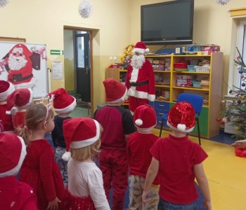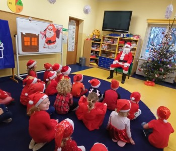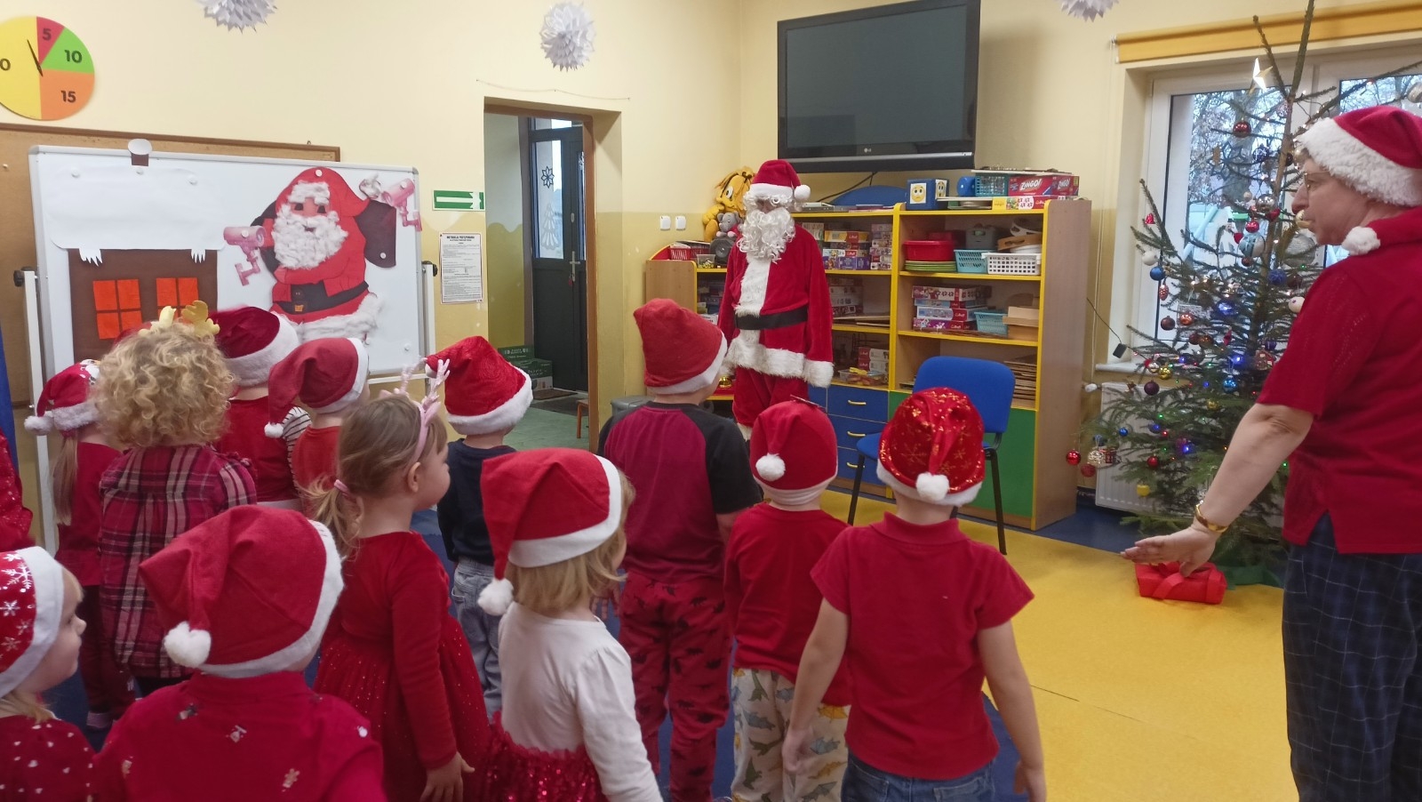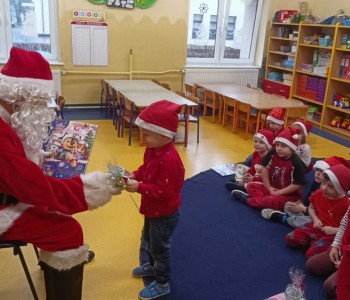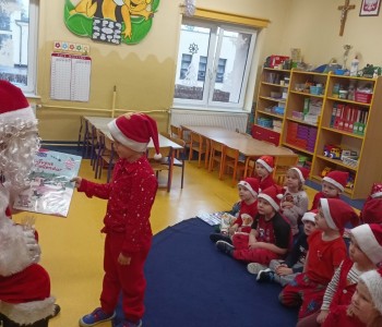 W piątek 5 grudnia w przedszkolu od samego rana wielkie zamieszanie, ponieważ w tym dniu ma odwiedzić dzieci Mikołaj. Dzieci ubrane w piękne świąteczne stroje, w czerwonych mikołajowych czapkach na głowach od samego rana z wielką niecierpliwością czekały na przyjście ważnego dla nich gościa. Aż wreszcie usłyszały dźwięk dzwonka, a to oznaczało, że Mikołaj się zbliża.