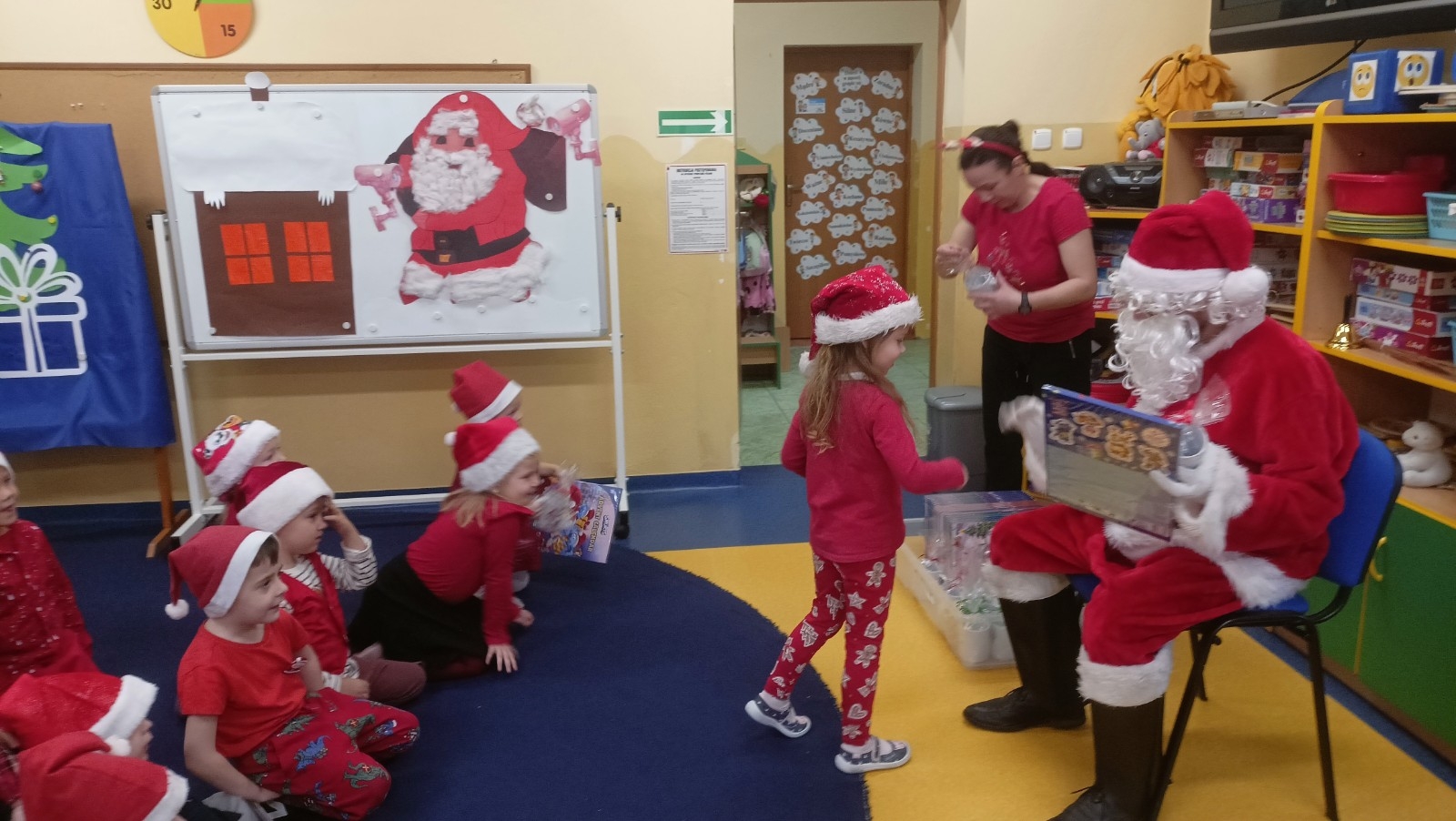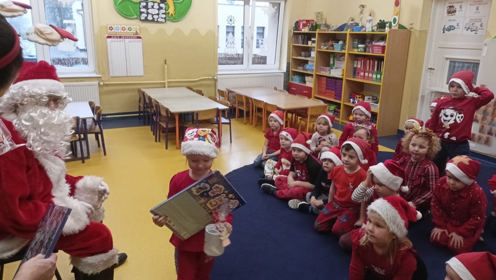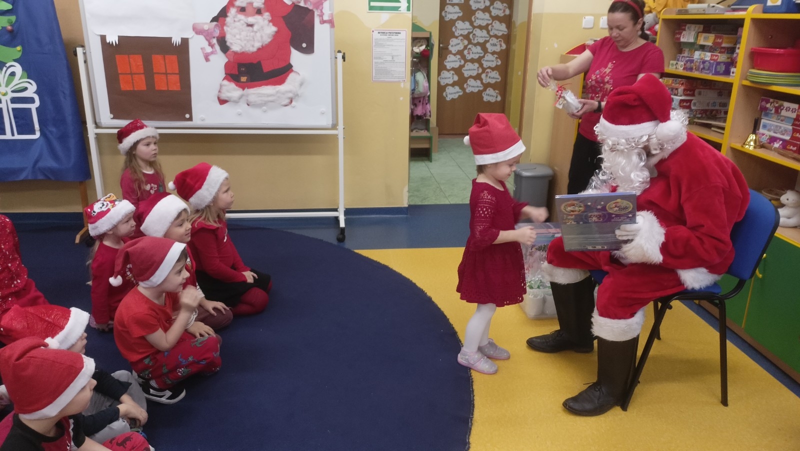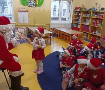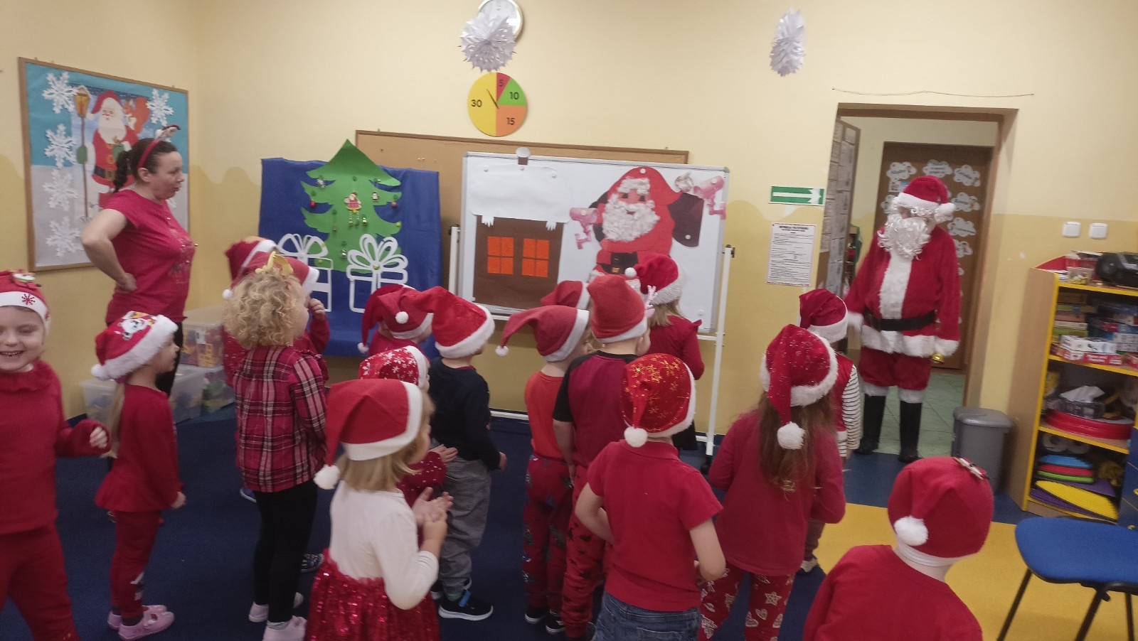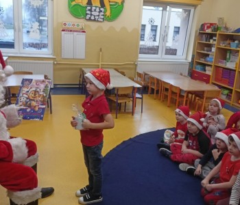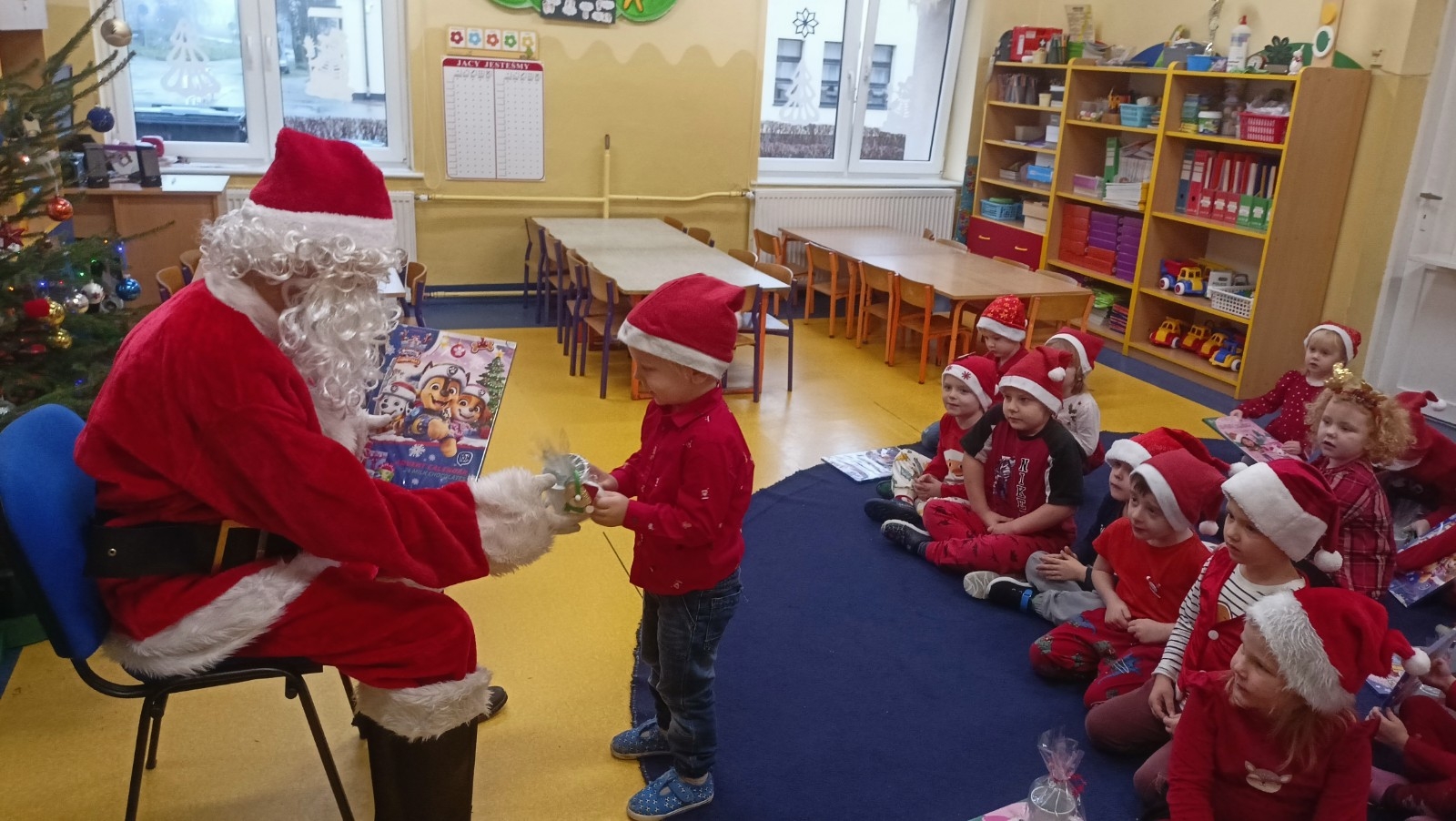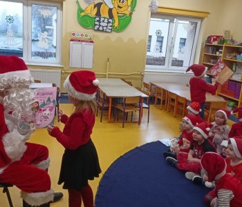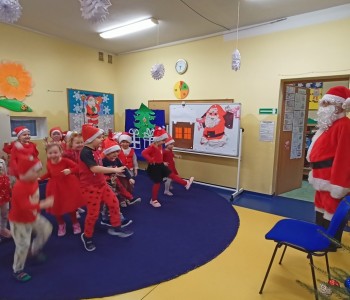 W piątek 5 grudnia w przedszkolu od samego rana wielkie zamieszanie, ponieważ w tym dniu ma odwiedzić dzieci Mikołaj. Dzieci ubrane w piękne świąteczne stroje, w czerwonych mikołajowych czapkach na głowach od samego rana z wielką niecierpliwością czekały na przyjście ważnego dla nich gościa. Aż wreszcie usłyszały dźwięk dzwonka, a to oznaczało, że Mikołaj się zbliża.
