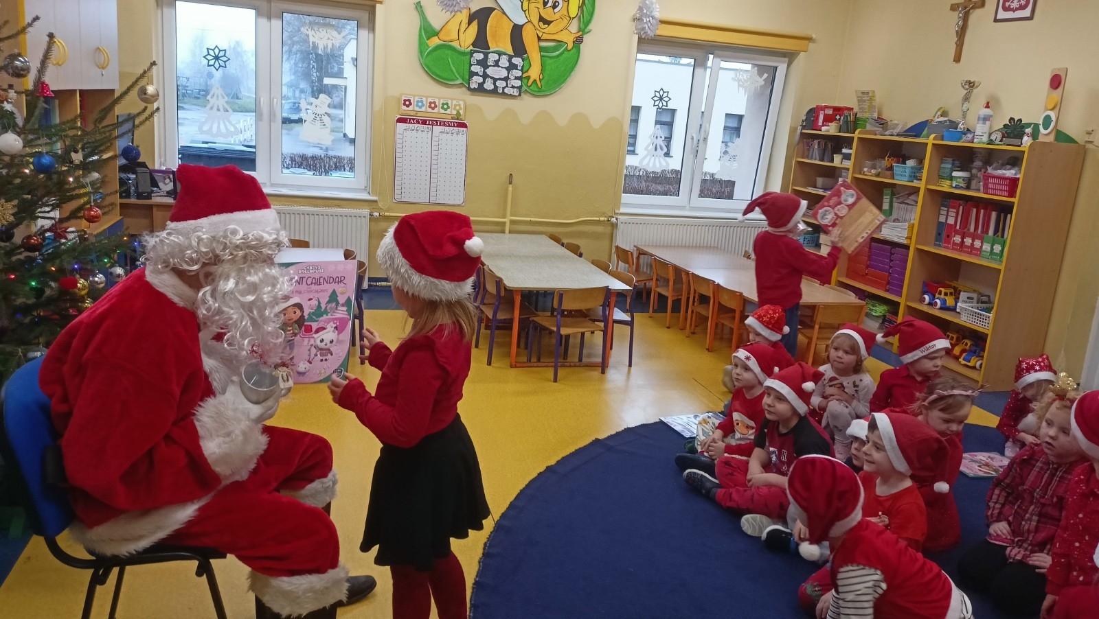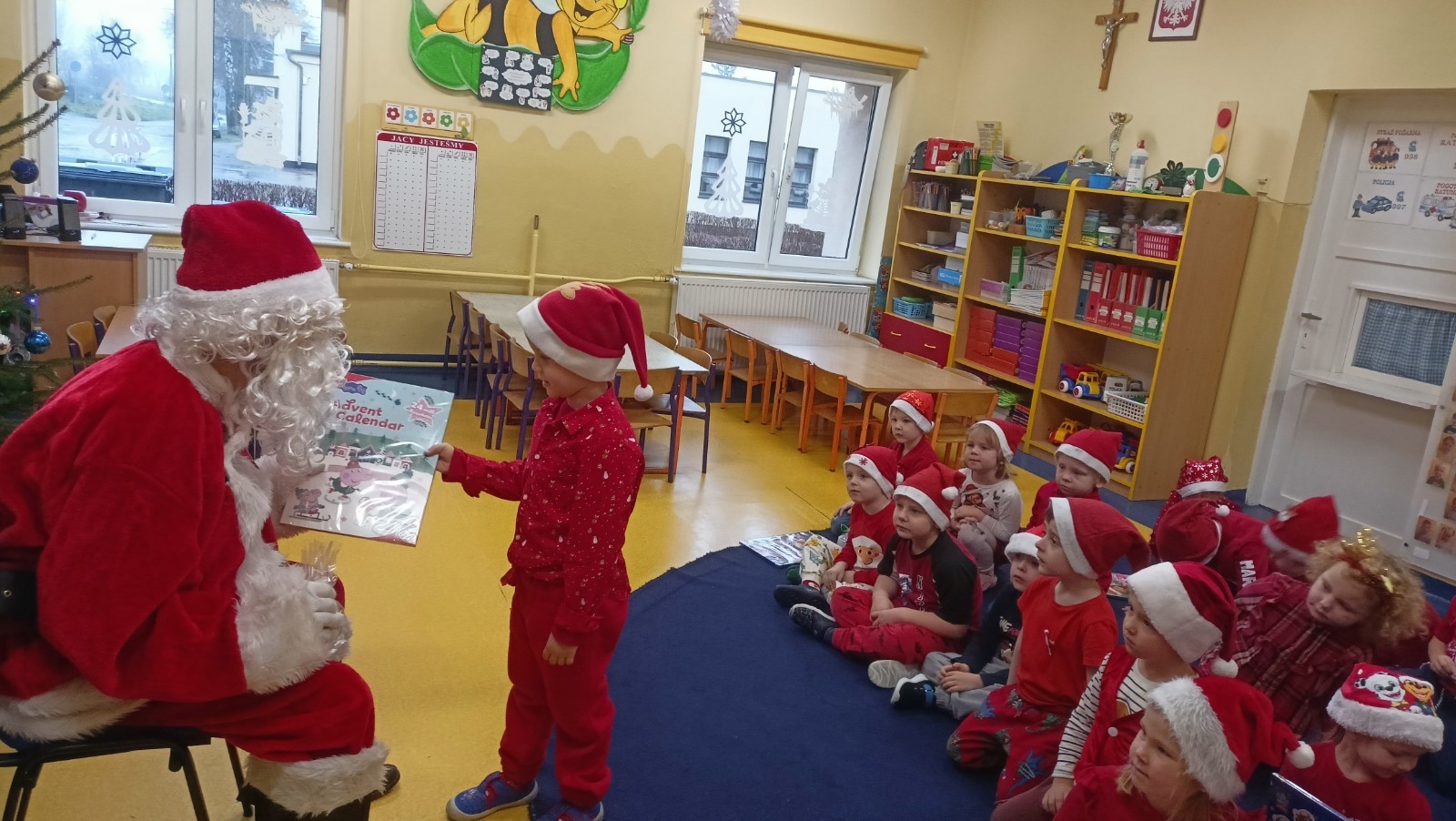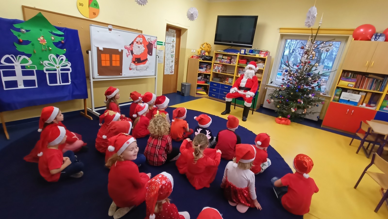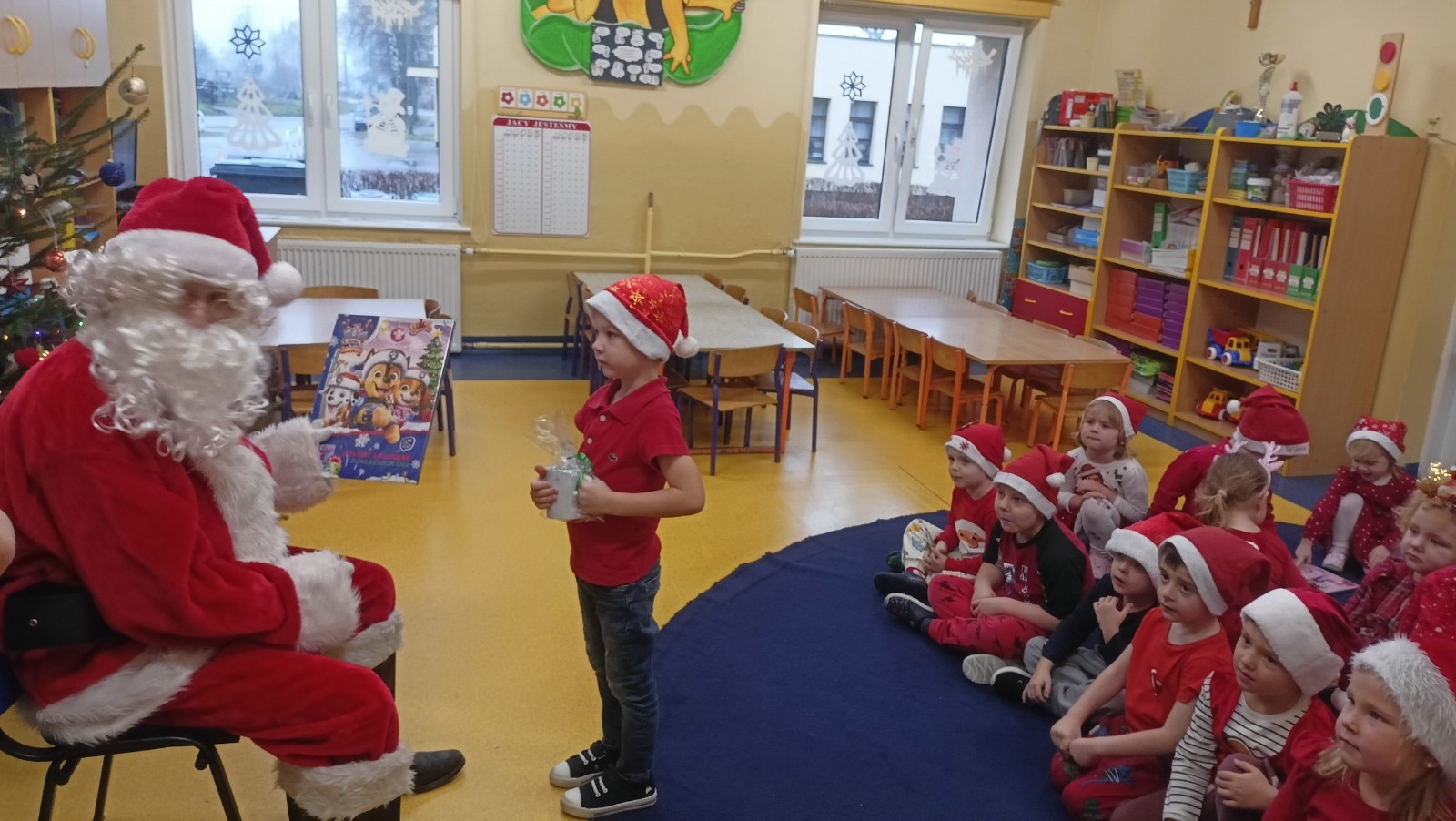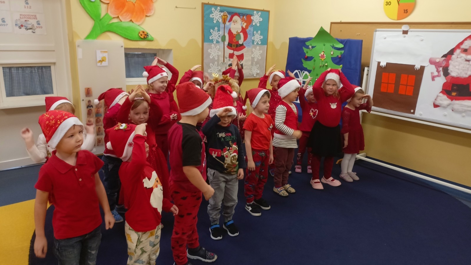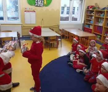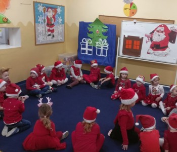 W piątek 5 grudnia w przedszkolu od samego rana wielkie zamieszanie, ponieważ w tym dniu ma odwiedzić dzieci Mikołaj. Dzieci ubrane w piękne świąteczne stroje, w czerwonych mikołajowych czapkach na głowach od samego rana z wielką niecierpliwością czekały na przyjście ważnego dla nich gościa. Aż wreszcie usłyszały dźwięk dzwonka, a to oznaczało, że Mikołaj się zbliża.