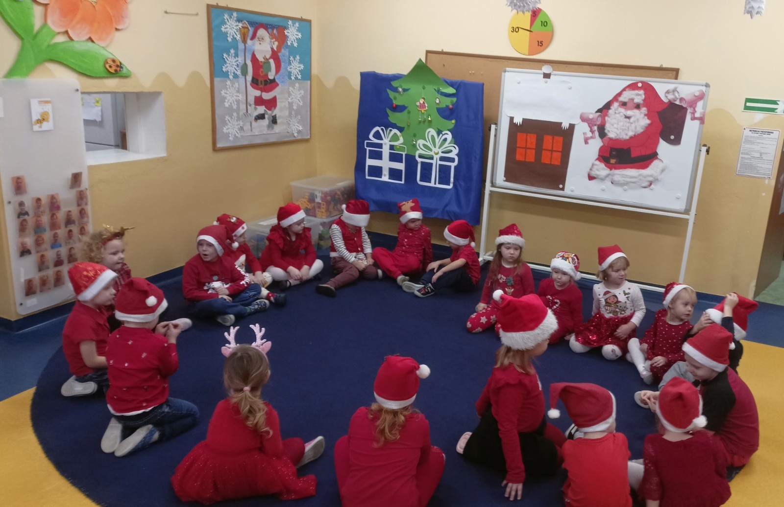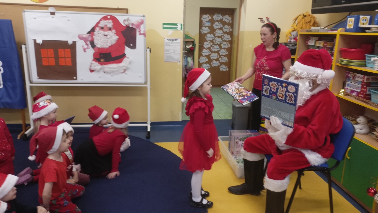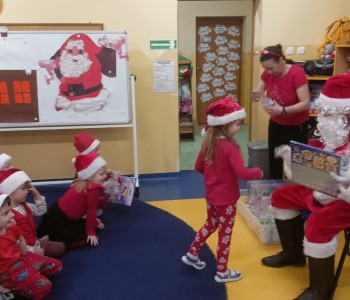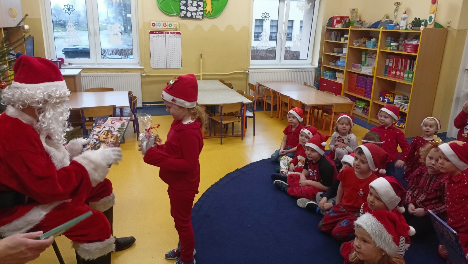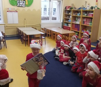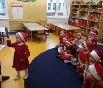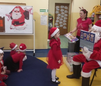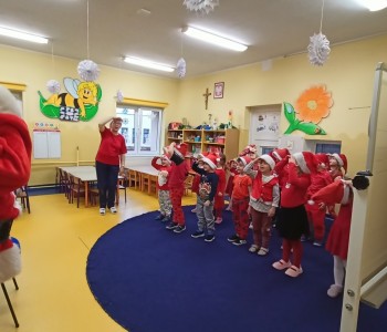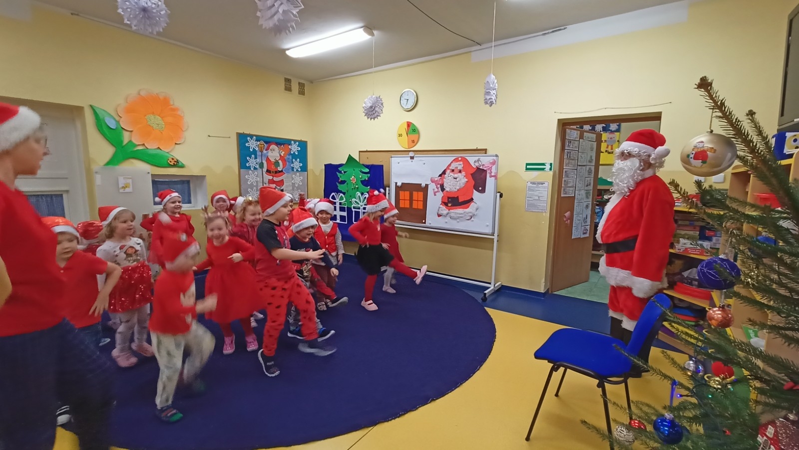 W piątek 5 grudnia w przedszkolu od samego rana wielkie zamieszanie, ponieważ w tym dniu ma odwiedzić dzieci Mikołaj. Dzieci ubrane w piękne świąteczne stroje, w czerwonych mikołajowych czapkach na głowach od samego rana z wielką niecierpliwością czekały na przyjście ważnego dla nich gościa. Aż wreszcie usłyszały dźwięk dzwonka, a to oznaczało, że Mikołaj się zbliża.