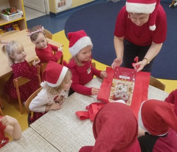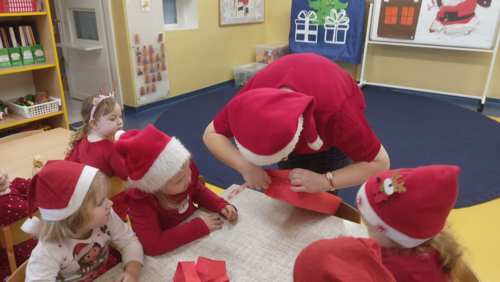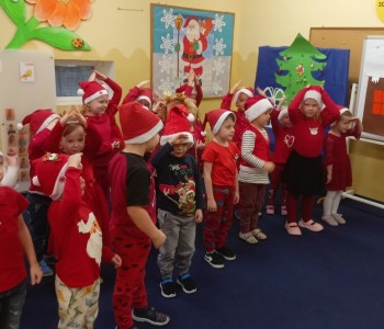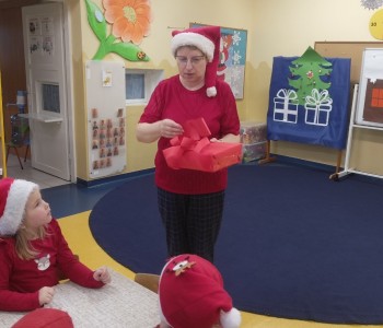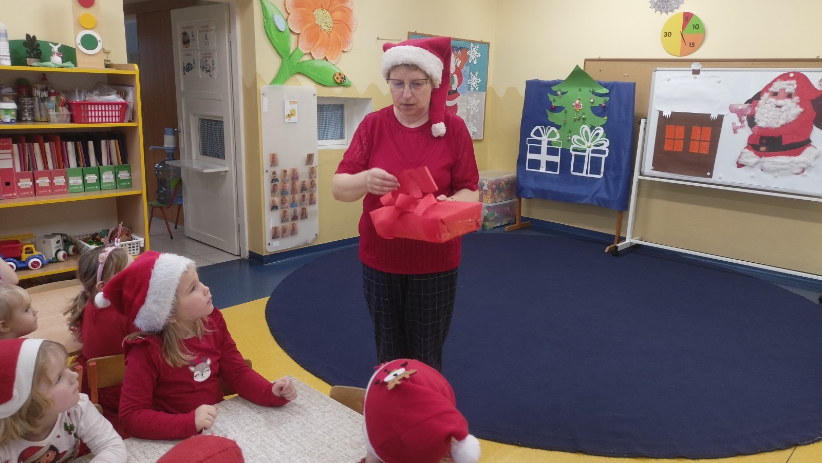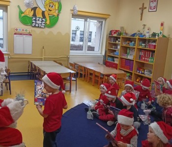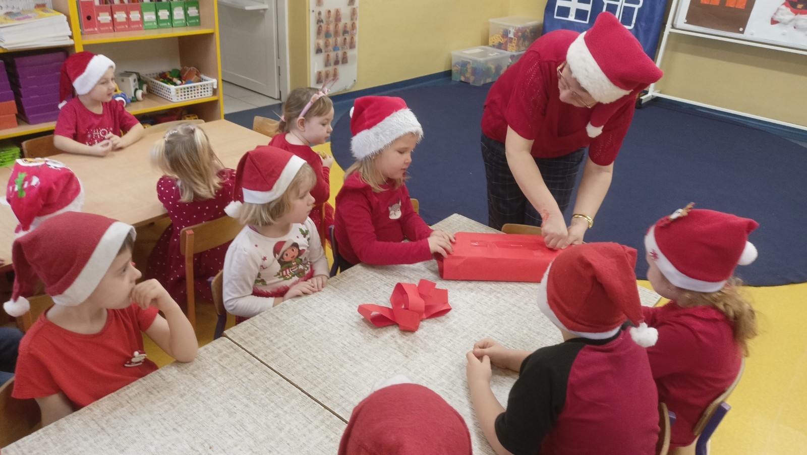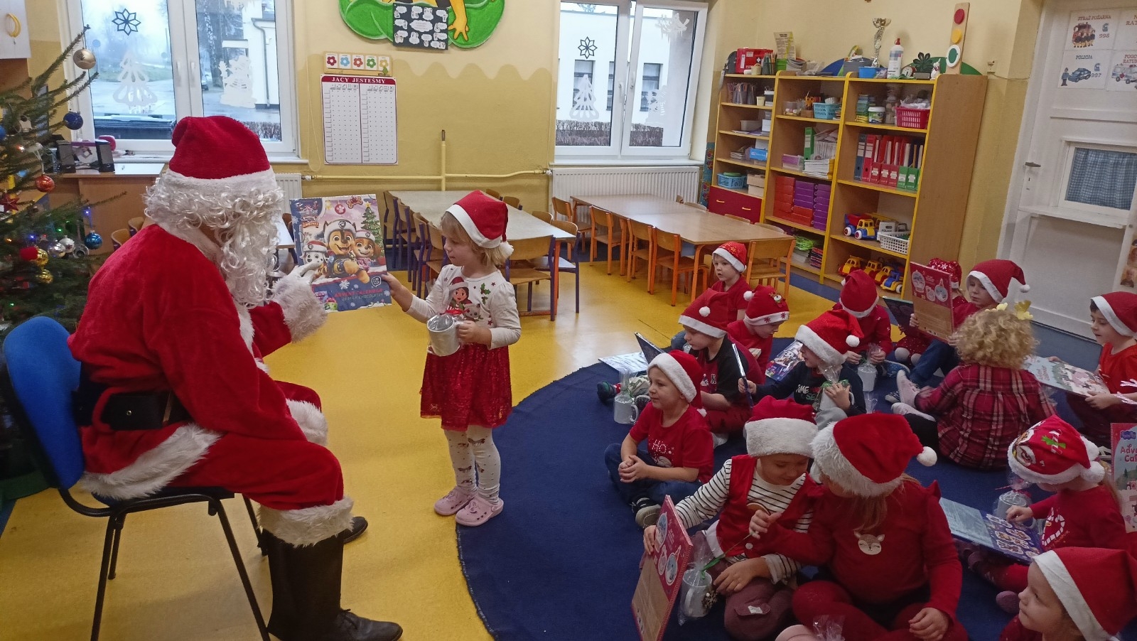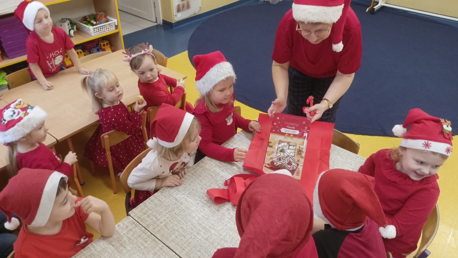 W piątek 5 grudnia w przedszkolu od samego rana wielkie zamieszanie, ponieważ w tym dniu ma odwiedzić dzieci Mikołaj. Dzieci ubrane w piękne świąteczne stroje, w czerwonych mikołajowych czapkach na głowach od samego rana z wielką niecierpliwością czekały na przyjście ważnego dla nich gościa. Aż wreszcie usłyszały dźwięk dzwonka, a to oznaczało, że Mikołaj się zbliża.