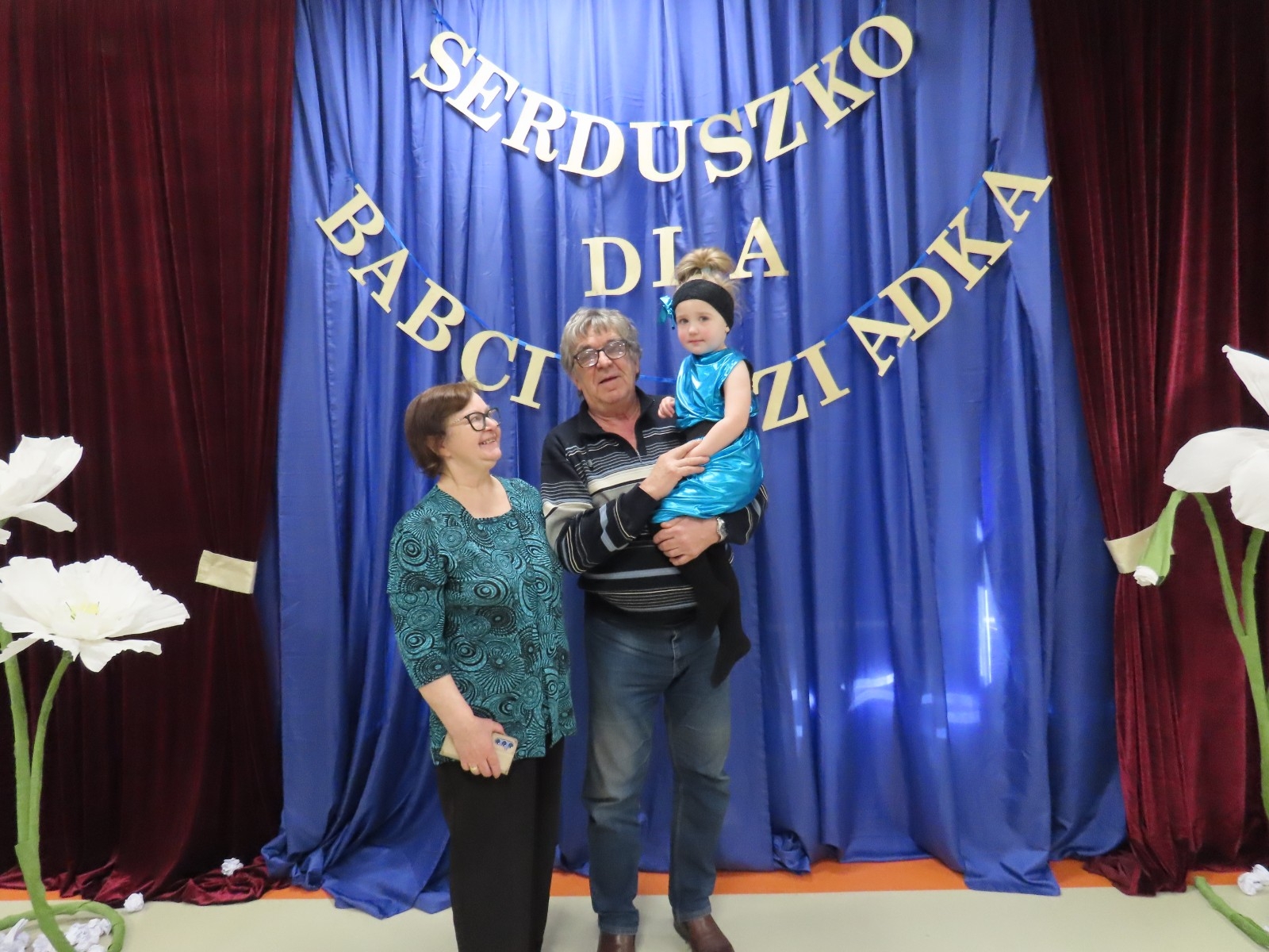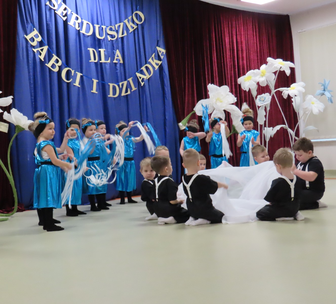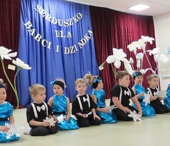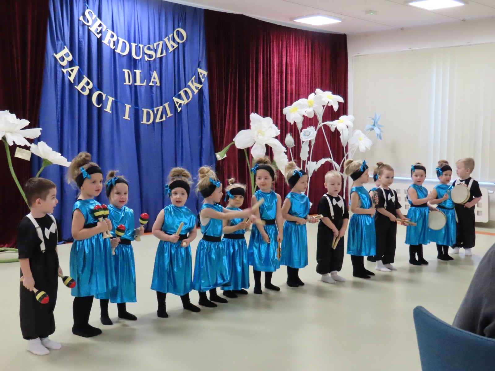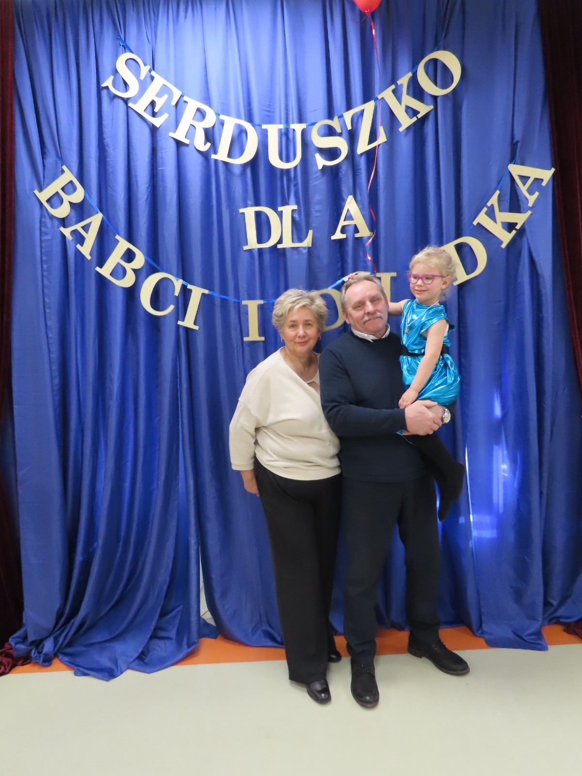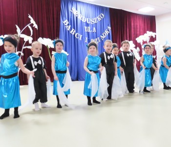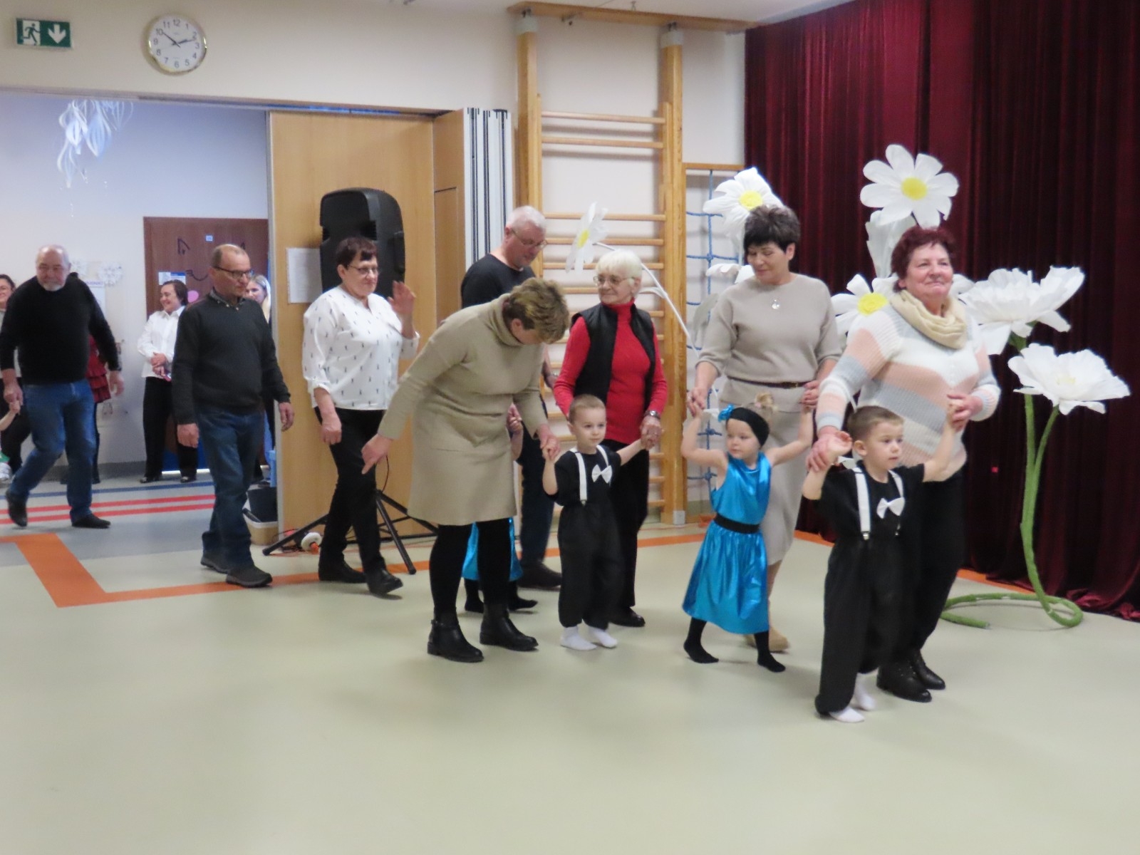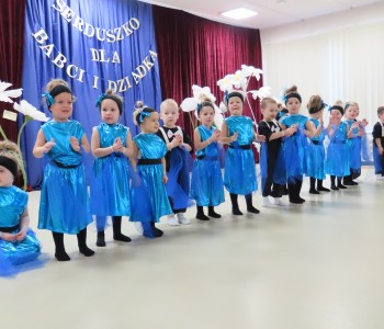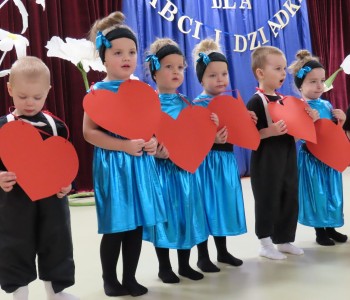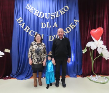 Podczas niezwykłego koncertu: „Serduszko dla Babci i Dziadka” w zaczarowanej sali unosiły się ciepłe spojrzenia i iskierki szczęścia. Smerfy i Krasnale, niczym prawdziwi artyści z dumą zaprezentowały piosenki i tańce. Każde słowo płynęło prosto z dziecięcych serduszek. Dla Babć i Dziadków był to czas pełen wzruszeń, niejedna łza radości zakręciła się w oku. Dzieci zaprosiły również swoich gości do wspólnej przygody ruchowej – ćwiczeń według metody Weroniki Sherborne. Babcie i Dziadkowie razem z wnukami zamienili się w wesołych podróżników: turlali się po śniegu, kołysali jak drzewa na wietrze i tworzyły magiczny kulig, współpracowali niczym najlepsi przyjaciele. Było mnóstwo śmiechu, bliskości oraz radosnego bycia razem; najważniejsza była miłość i wspólne przeżywanie chwil. Na zakończenie każdy Dziadek i każda Babcia otrzymali prezenciki, jako znak wdzięczności, czułości i ogromnej miłości, jaką dzieci noszą w swoich małych, ale jakże wielkich sercach!