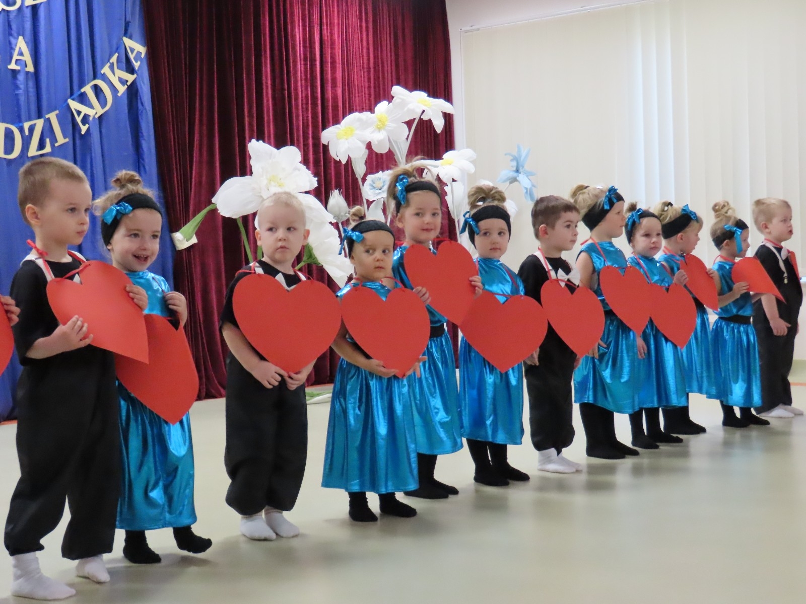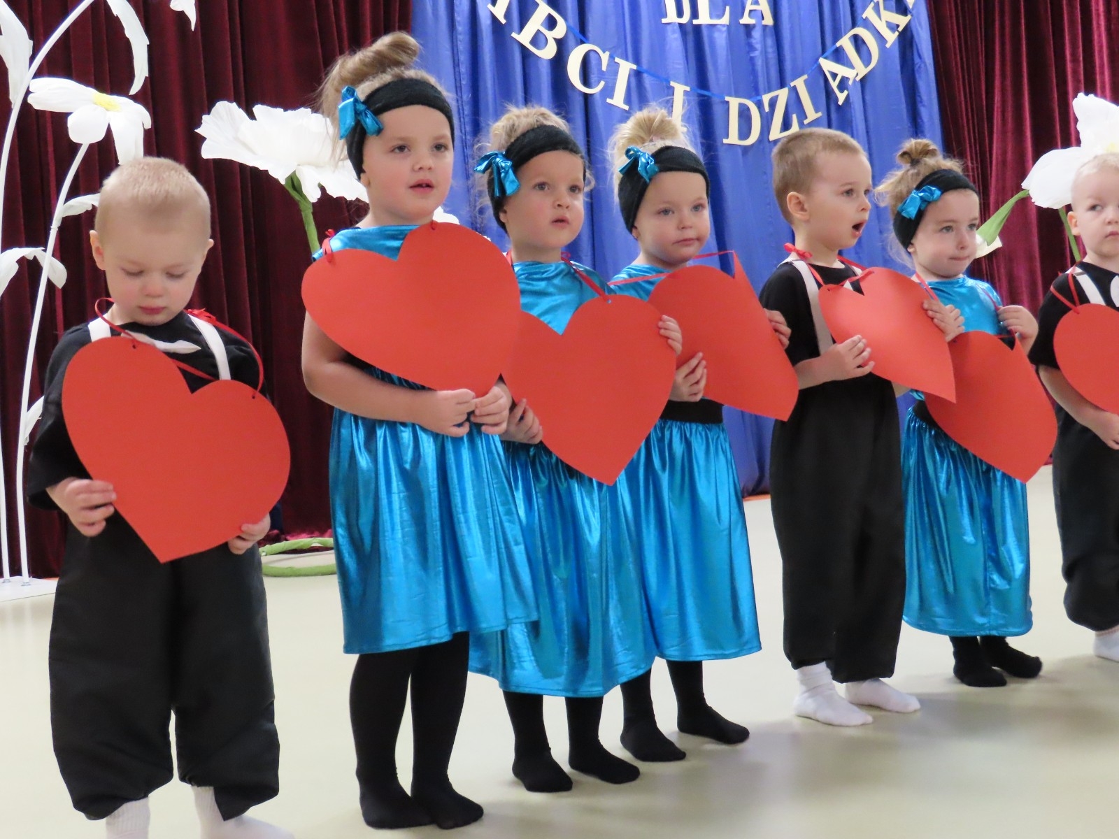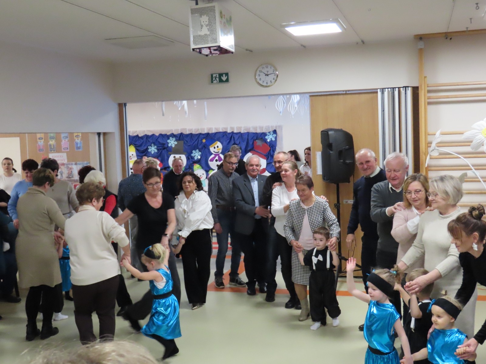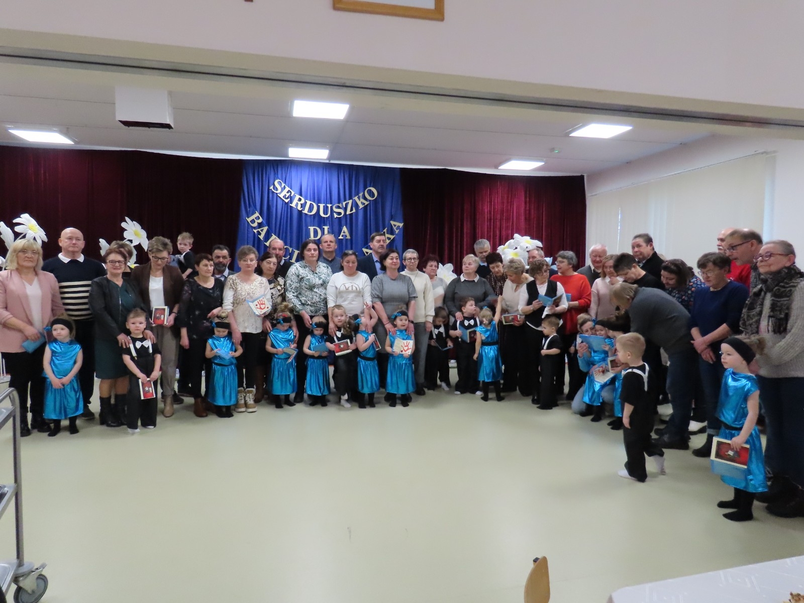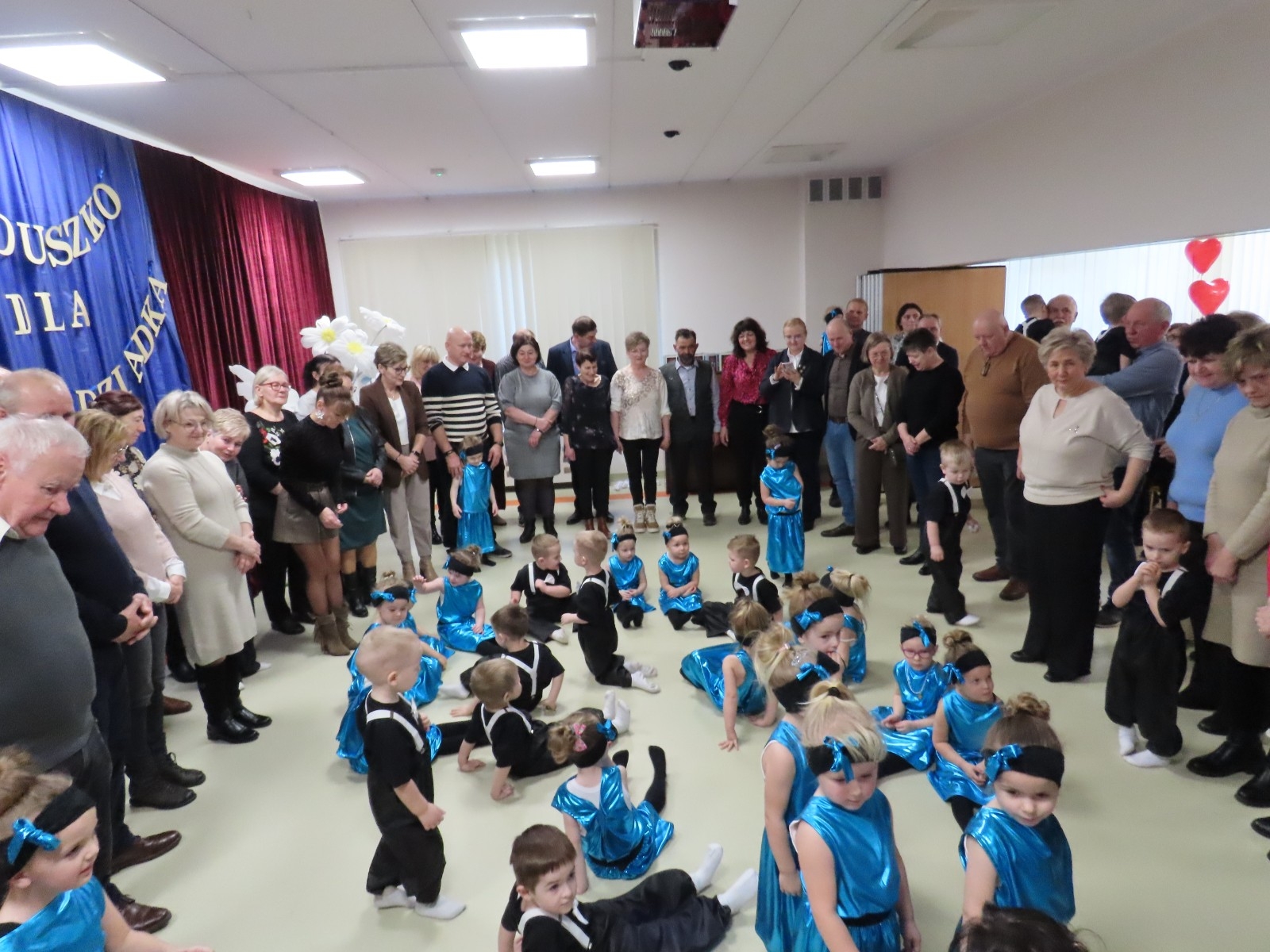 Podczas niezwykłego koncertu: „Serduszko dla Babci i Dziadka” w zaczarowanej sali unosiły się ciepłe spojrzenia i iskierki szczęścia. Smerfy i Krasnale, niczym prawdziwi artyści z dumą zaprezentowały piosenki i tańce. Każde słowo płynęło prosto z dziecięcych serduszek. Dla Babć i Dziadków był to czas pełen wzruszeń, niejedna łza radości zakręciła się w oku. Dzieci zaprosiły również swoich gości do wspólnej przygody ruchowej – ćwiczeń według metody Weroniki Sherborne. Babcie i Dziadkowie razem z wnukami zamienili się w wesołych podróżników: turlali się po śniegu, kołysali jak drzewa na wietrze i tworzyły magiczny kulig, współpracowali niczym najlepsi przyjaciele. Było mnóstwo śmiechu, bliskości oraz radosnego bycia razem; najważniejsza była miłość i wspólne przeżywanie chwil. Na zakończenie każdy Dziadek i każda Babcia otrzymali prezenciki, jako znak wdzięczności, czułości i ogromnej miłości, jaką dzieci noszą w swoich małych, ale jakże wielkich sercach!