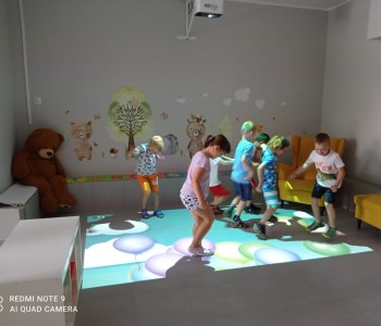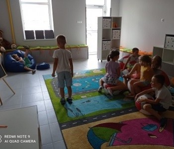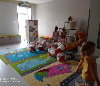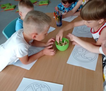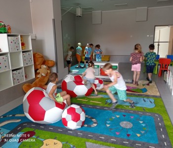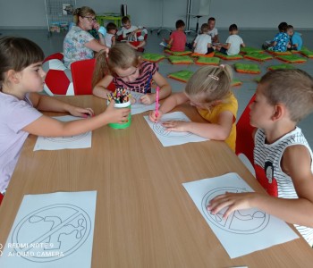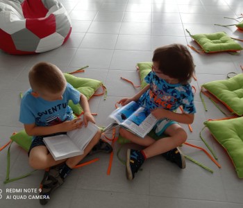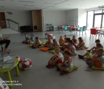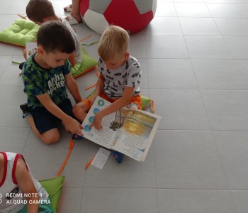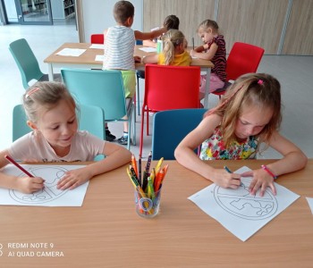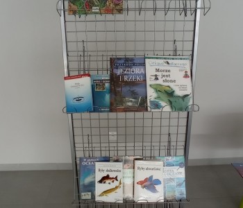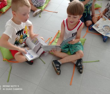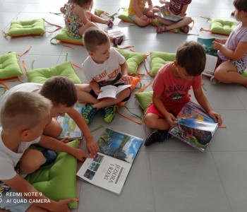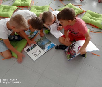 Wizyta w bibliotece - oglądanie wystawy literatury o tematyce morskiej- grupa starsza- koniec trzeciego tygodnia zajęć wakacyjnych.