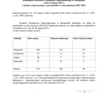 Komunikat Dyrektora Przedszkola Samorządowego w Margoninie dotyczący ilości wolnych miejsc w przedszkolu na rok szkolny 2022/2023.