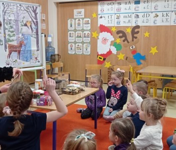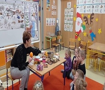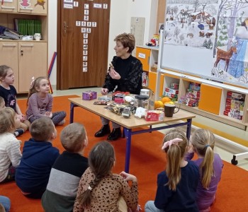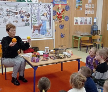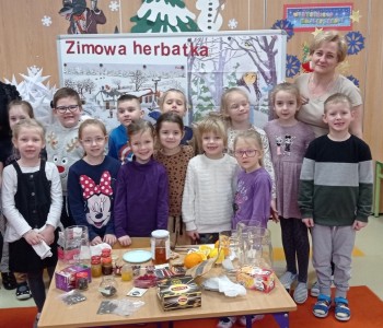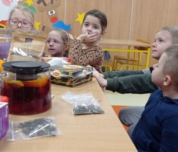 Dzieci z Grupy Czerwonego Kapturka przygotowywały zimową herbatkę. Dowiedzieliśmy się, że w chłodne dni, gdy łatwo o przeziębienie, dobrze jest wzbogacić herbatę różnymi „naturalnymi” dodatkami.