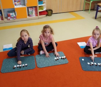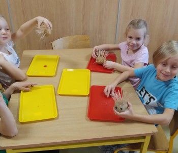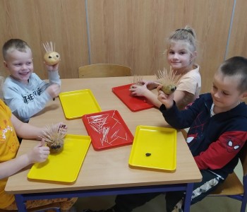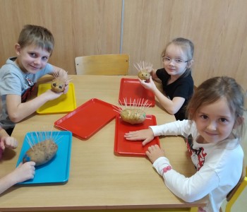 Podczas zabaw matematycznych utrwalały umiejętność posługiwania się znakami matematycznymi z wykorzystaniem darów jesieni jako liczmanów. Utrwaliły wiedzę na temat żywienia zwierząt i nazw ich mieszkań. Na koniec tygodnia podczas zajęć technicznych wykonały jeża z ziemniaka i wykałaczek.
