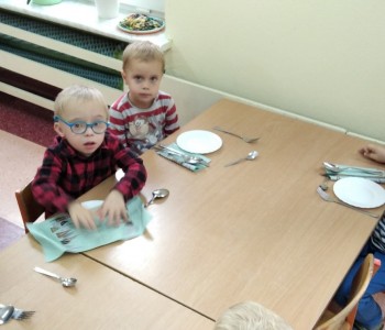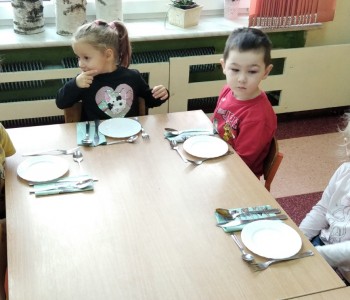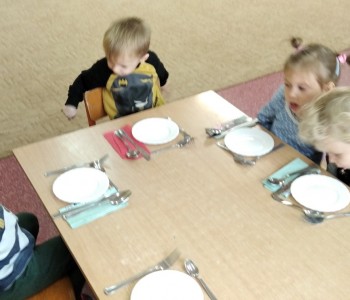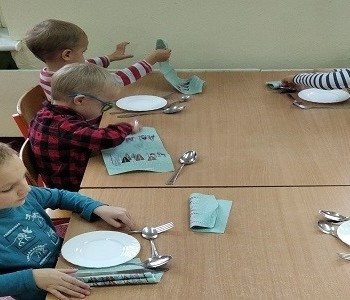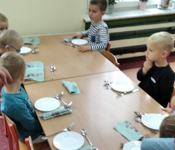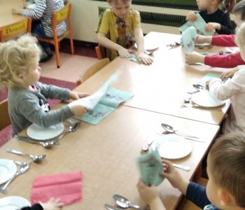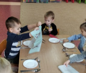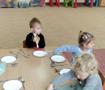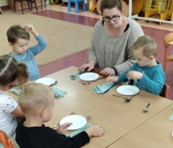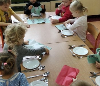 „Przyjmujemy gości” – w taką zabawę dydaktyczną bawiły się dzieci z grupy Krasnala Hałabały. Celem zajęcia było przygotowanie stołu na przyjście gości, ustawianie talerzy, kubków, sztućców, serwetek, nabywanie umiejętności prawidłowego nakrywania do stołu, zachęcanie do dbania o estetyczny wygląd nakrytego stołu, wdrażanie do przyjmowania odpowiedniej postawy przy stole.