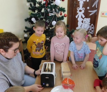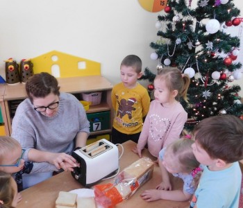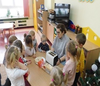 W ramach tygodniowego tematu kompleksowego „ Prąd elektryczny” grupa Krasnala Hałabały poznała urządzenie elektryczne –toster. Nie obyło się bez praktycznego i smacznego pokazu połączonego z degustacją.