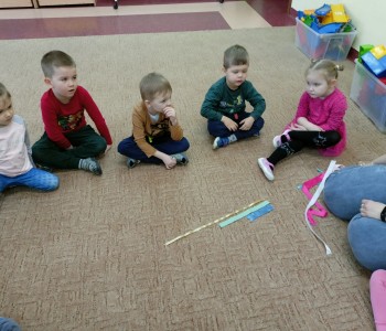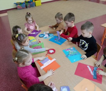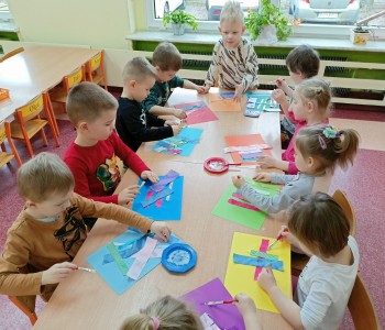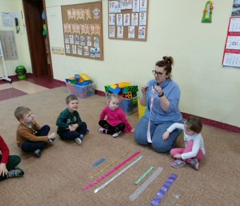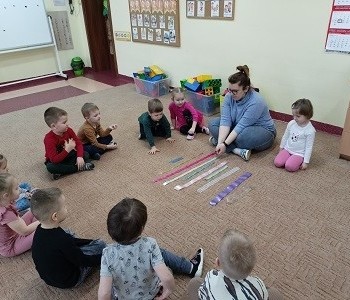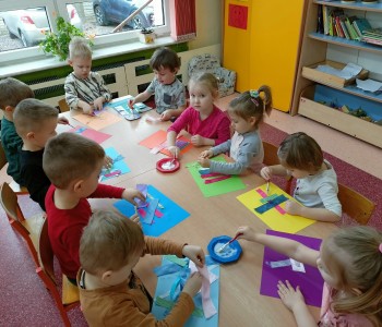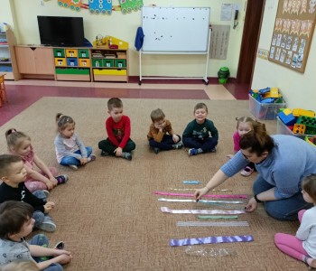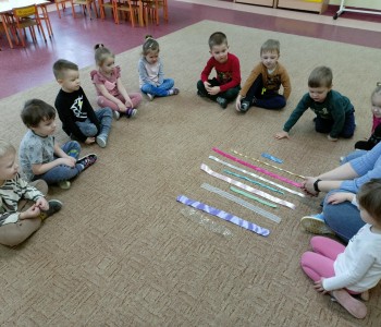 Podczas realizacji tematu kompleksowego „ Coś z niczego” dzieci z grupy Krasnala Hałabały oglądały, porównywały długość, wypowiadały się na temat kolorów, grubości i przeznaczenia wstążek. Na zakończenie zajęć stworzyliśmy wstążkowy obrazek.