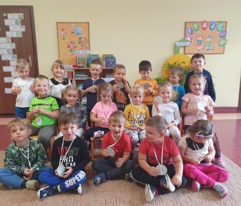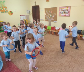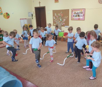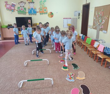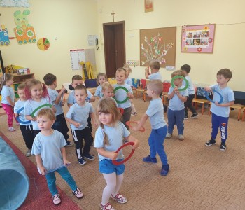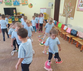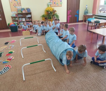 Zorganizowaliśmy również „Sportowy dzień” pełen aktywności fizycznej. Dzieci z wielkim entuzjazmem ćwiczyły z wykorzystaniem wielu przyborów dostępnych w przedszkolu: krążków, woreczków, tuneli, drewnianych stóp sensorycznych. Przygotowane zabawy miały na celu wspieranie rozwoju przedszkolaków, a jednocześnie dostarczyły ogromnej radości i pozytywnej energii wszystkim uczestnikom.