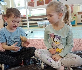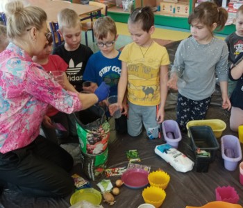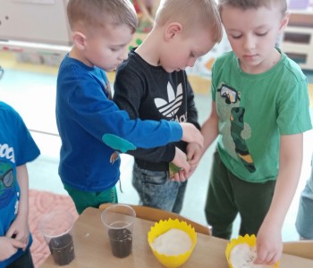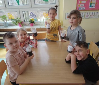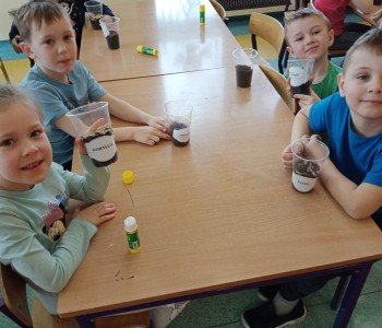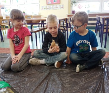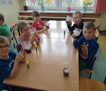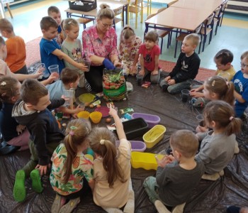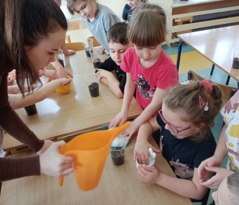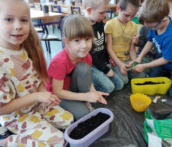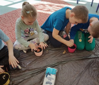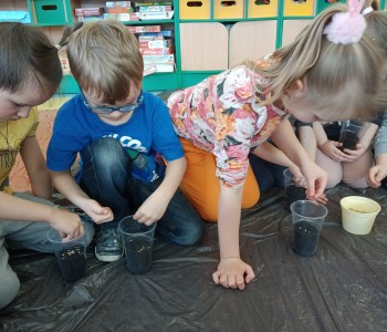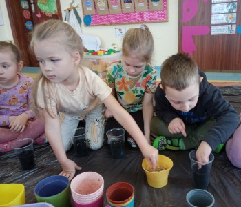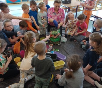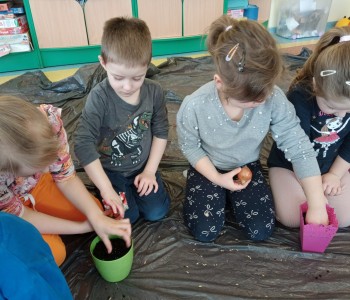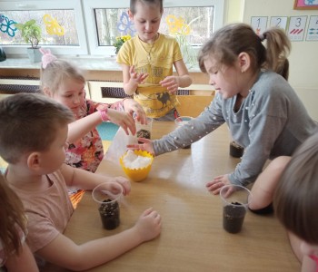 Pierwszą czynnością jaką musiały wykonać to napełnienie doniczek ziemią. Przedszkolaki dowiedziały się również co jest potrzebne do wzrostu roślin, nauczyły się sadzić cebulki kwiatów oraz siać nasiona różnych warzyw. Teraz z niecierpliwością czekamy na efekty naszej pracy.