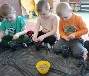 Grupa Kubusia Puchatka dobrze wie, że wiosna to czas sadzenia i siania, dlatego też mali ogrodnicy postanowili założyć w swojej sali ogródek. Dzieci bardzo chętnie włączyły się w prace ogrodnicze.